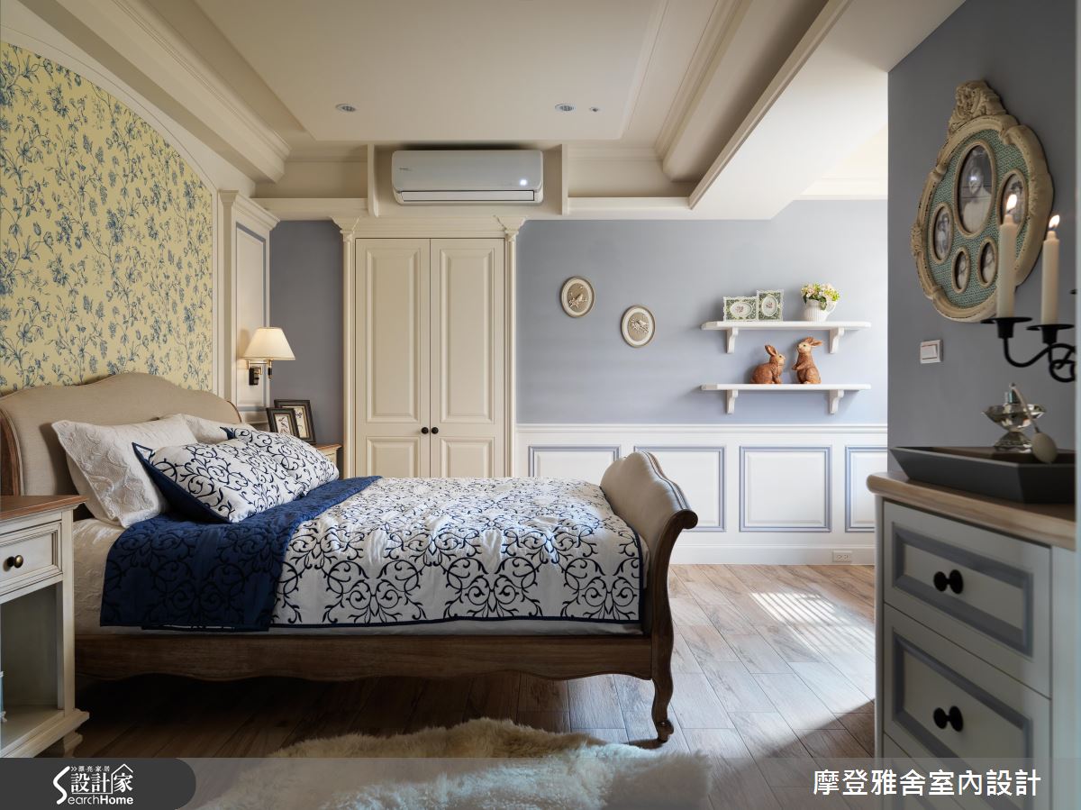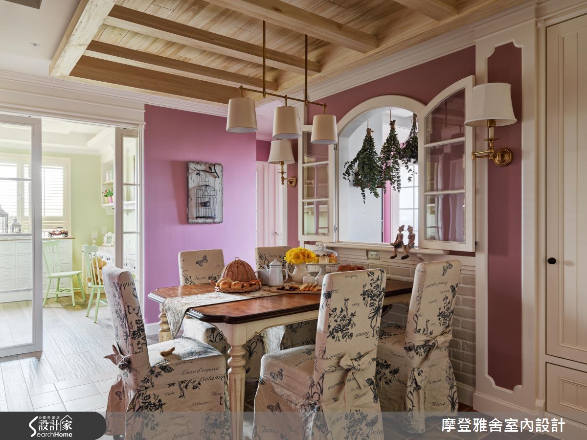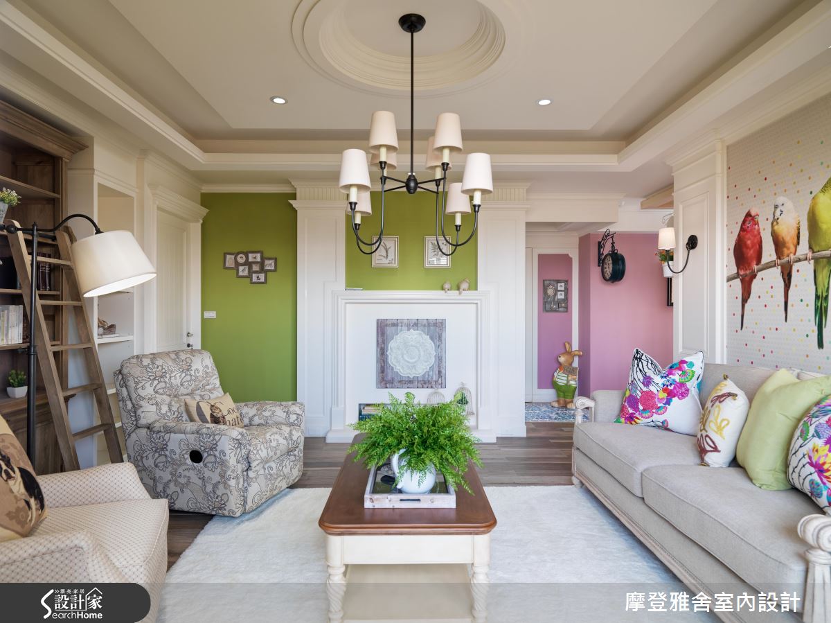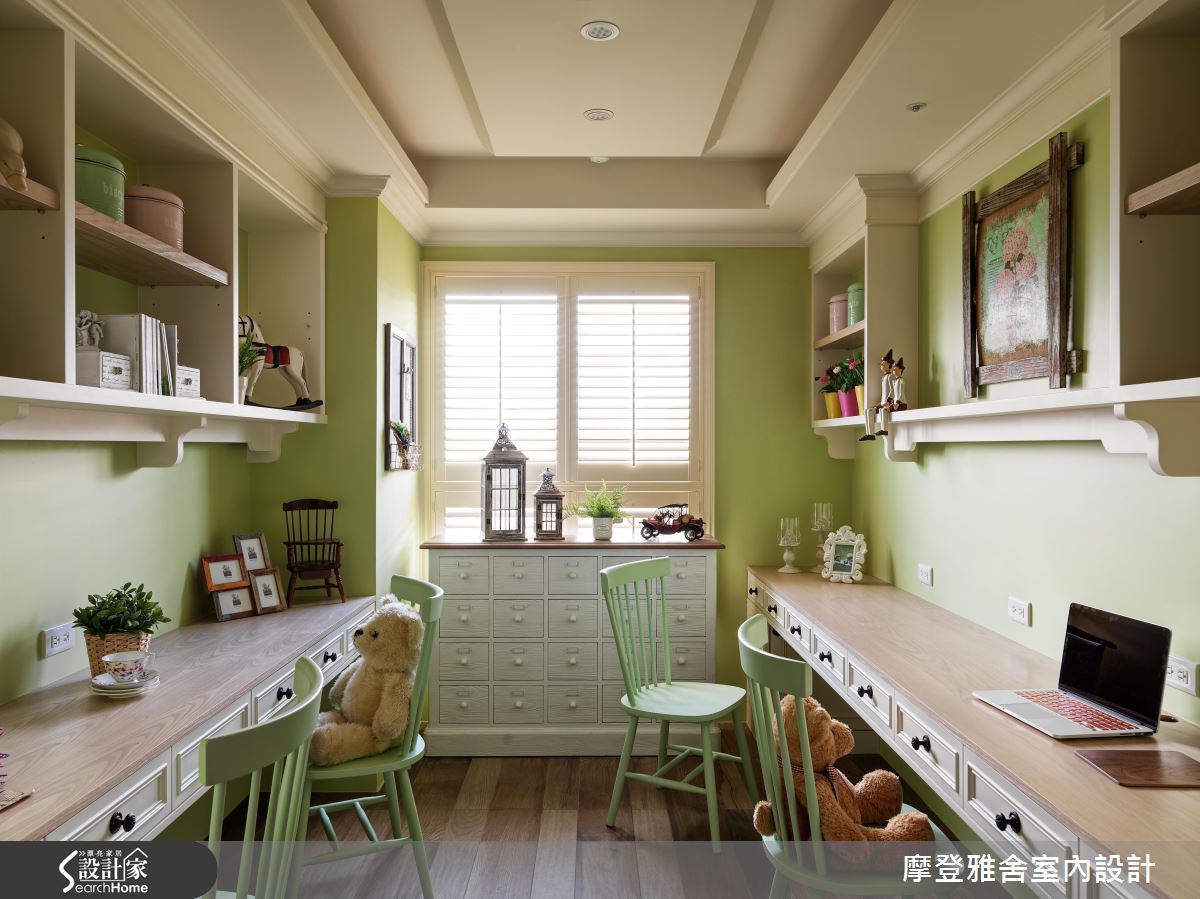 客廳呈萊姆綠色調,帶入夏季清新感,並考量到全家人習慣,捨棄制式電視牆,減少不必要的視聽娛樂,同時依據開窗方位,額外延伸出一處陽光臥榻區,滿足休憩閱讀需求,牆面繪製並肩的彩色鸚鵡,則象徵著一家人親密情感,描繪出無比的幸福景象;餐廚區採以紫莓色定調,透過拼花地磚、木質天花與燈飾增添生活氣氛,與廚房之間設計一扇拱型室內窗,讓後陽台光線可直抵餐廳,且達成場域之間的交流對話;書房融入棗綠色調,藉由格子清玻拉門延攬光線,內部不僅以抽屜、開放吊櫃滿足收納需求,更規劃雙排座位,打造美好的闔家閱讀時光;主臥內給予兩個更衣間,滿足男女主人個別所需,並加入灰藍薰衣草色,與藍色花朵壁紙、白色線板等相互搭襯,帶入法式普羅旺斯的清新意象!
