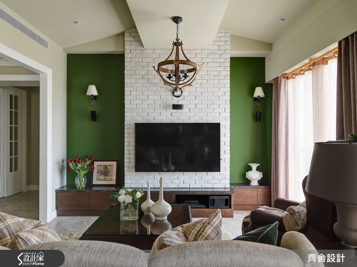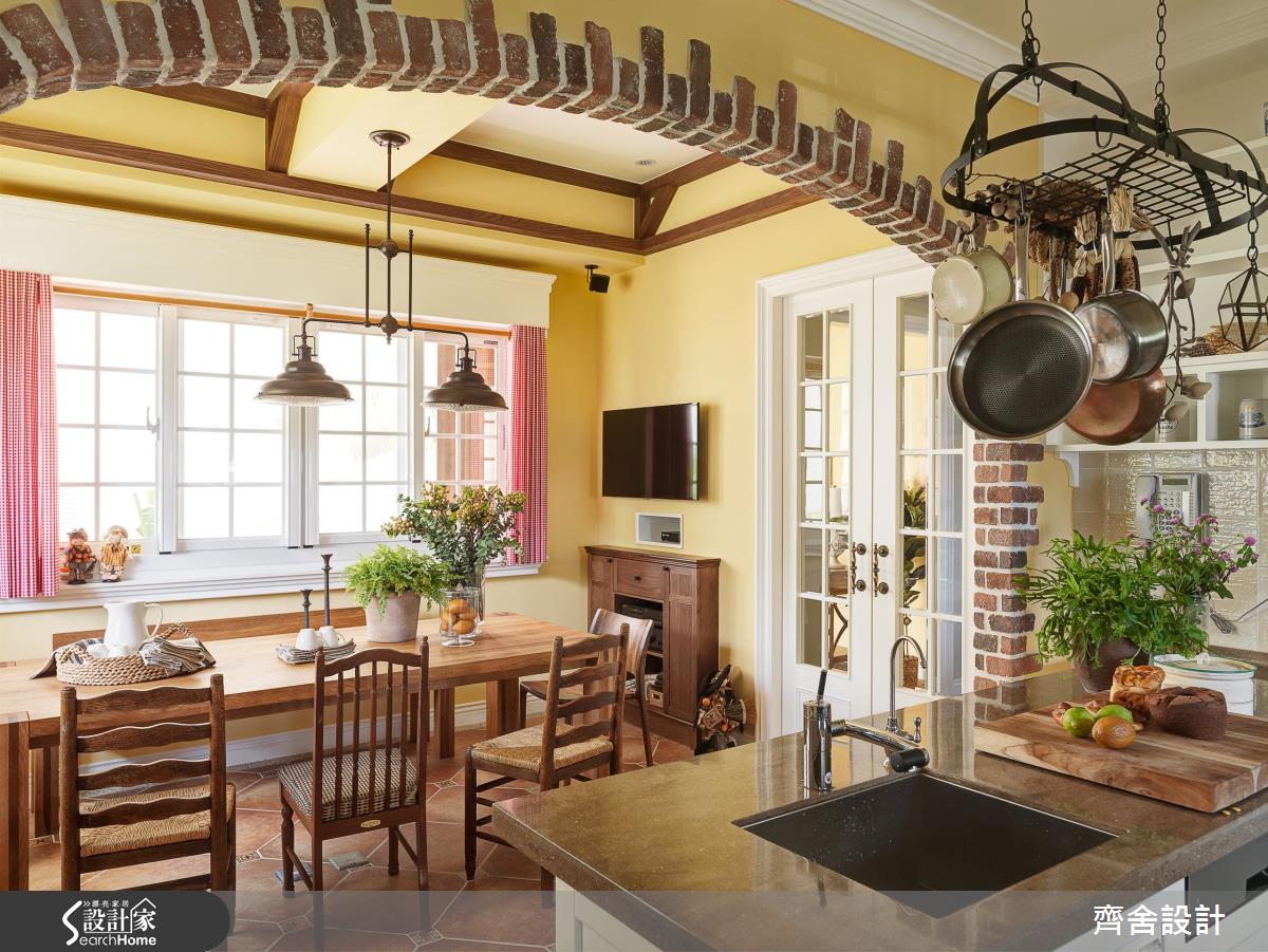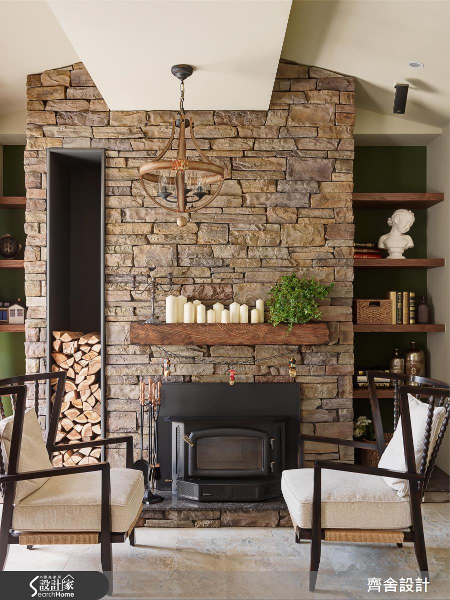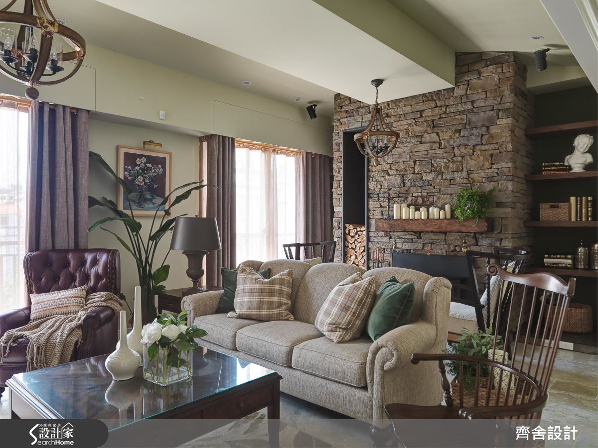 擅長英式風格的齊舍設計團隊,這次跳脫思考,在本案中以明朗甜蜜的鄉村風進行規劃,溫暖的色系與英式古典的素材優雅的融合,讓120坪的透天別墅全然換新。從灑滿陽光的金黃色玄關入口開始,仿古地磚與木製家具沉穩地迎接賓客。溫暖的客廳充滿英式鄉村元素,白色石磚與綠意牆壁構成恬靜的電視主牆、懸掛的鹿角壁飾帶來自然原始氣息、傳統鄉村風格厚實的沙發與銅色吊燈,以及粗獷的原石裸磚牆、與燃木壁爐營造真實溫暖的經典鄉村莊園氣氛。