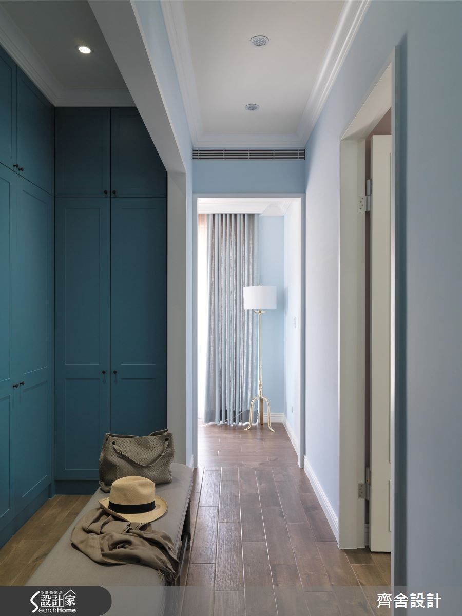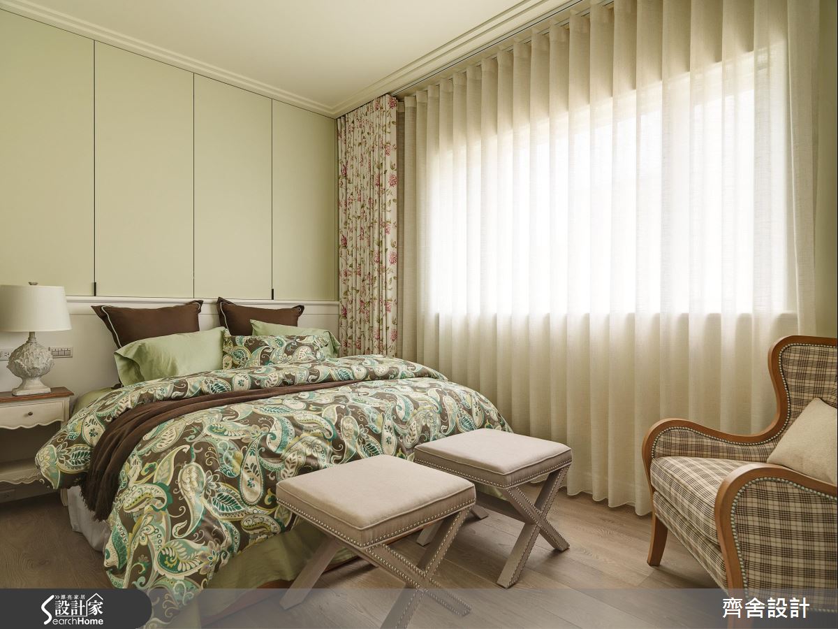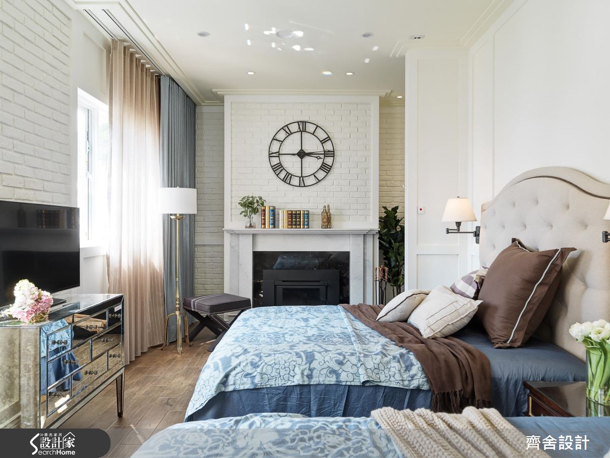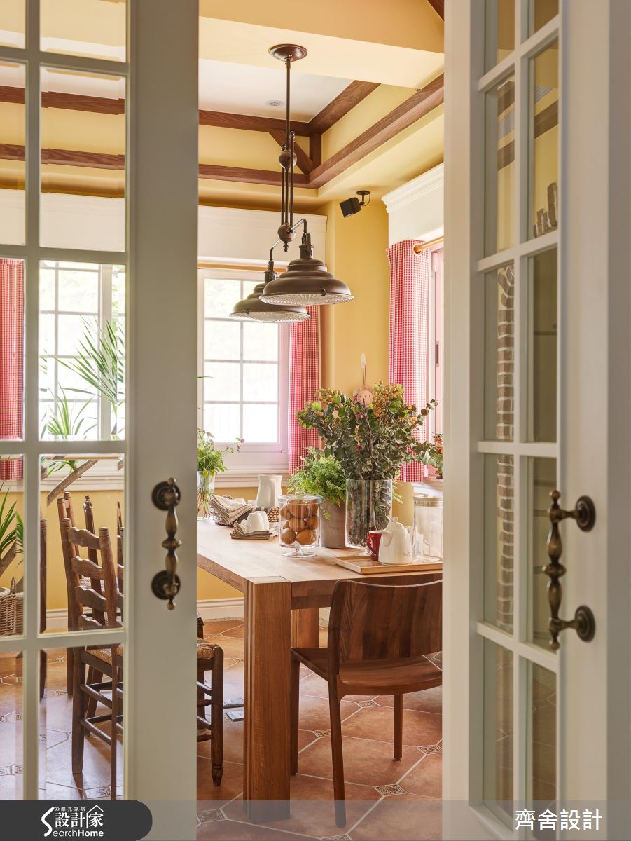 擅長英式風格的齊舍設計團隊,這次跳脫思考,在本案中以明朗甜蜜的鄉村風進行規劃,溫暖的色系與英式古典的素材優雅的融合,讓120坪的透天別墅全然換新。從灑滿陽光的金黃色玄關入口開始,仿古地磚與木製家具沉穩地迎接賓客。溫暖的客廳充滿英式鄉村元素,白色石磚與綠意牆壁構成恬靜的電視主牆、懸掛的鹿角壁飾帶來自然原始氣息、傳統鄉村風格厚實的沙發與銅色吊燈,以及粗獷的原石裸磚牆、與燃木壁爐營造真實溫暖的經典鄉村莊園氣氛。
