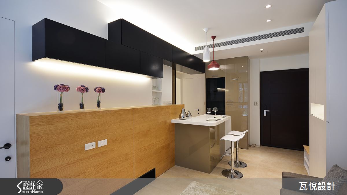 入門處即是及頂鏡面,延續到沙發背牆上方,不僅擁有框設玄關的效果,同時有效放大公領域視覺感受。設計師重新設計電視主牆,注入溫潤木色並結合開放式收納機能,更在上方增添黑色幾何量體,增加收納空間。因應人口與生活習性,以吧台取代餐桌,利用複合式機能增加空間多元用度。沙發背牆與櫃體相連結,以幾何紋路線條在純白色調裡創造居家層次。私領域則延續公領域設計概念,以純白色系、幾何線條與適當的鏡面比例放大臥房空間。