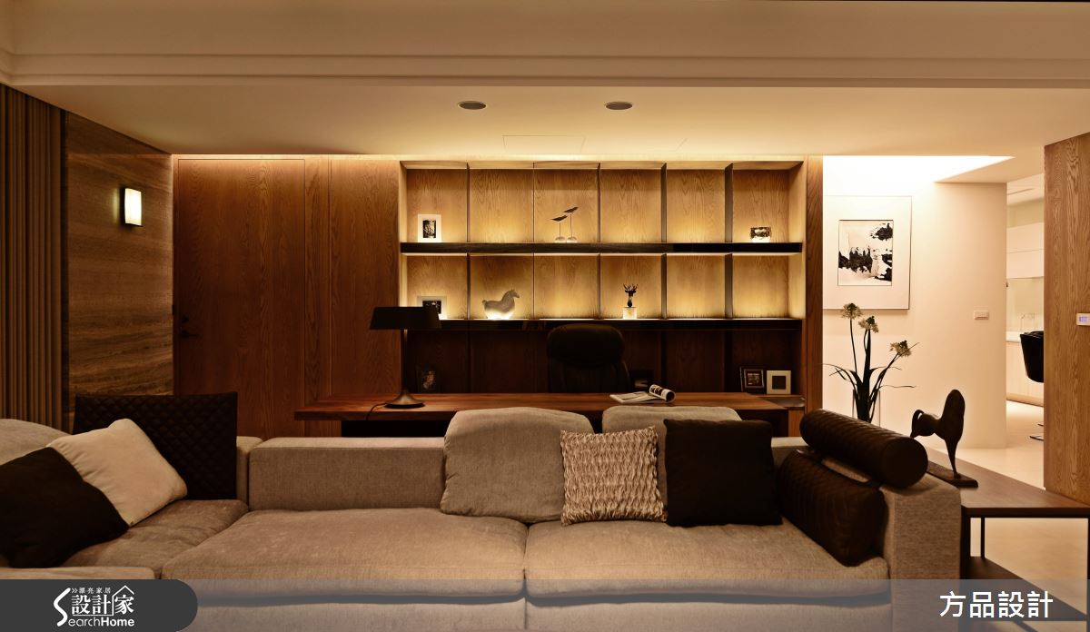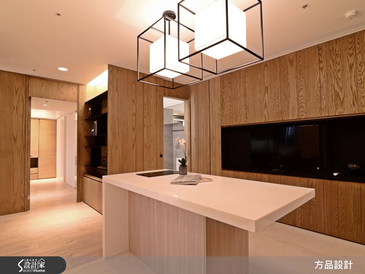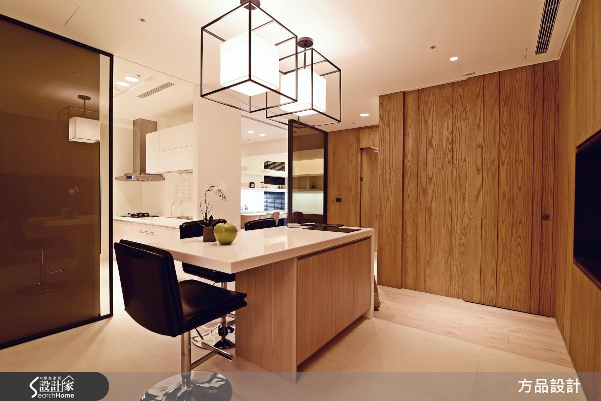 為了緩解穿堂煞的風水禁忌,設計師採以通透建材打造玄關屏風,以鐵件為骨架,讓清玻、灰玻等各式玻璃相互穿插,營造現代感俐落畫面;公領域將客廳、書房開放串聯,以大理石鋪述電視主牆,建構大器內斂的立面表情,書房後牆面則結合開放展示櫃,以木皮搭構溫和背景,襯出家飾收藏物的質感,並使用燈光點綴提升溫度,替俐落的現代格調揉入一絲暖意;餐廚場域規劃開放吧檯,將輕食、熱炒區域予以區隔,並讓白色、木質相互交錯,使電器設備做出完好整合,賦予美感、機能的雙重享受;寢臥床頭給予深色木作線條延伸,無形中拉長了牆面尺度,並讓床頭櫃呈懸吊之姿,巧妙與空間假柱相結合,而旋轉電視牆的設計,則體貼滿足了任一角落的觀賞視角!