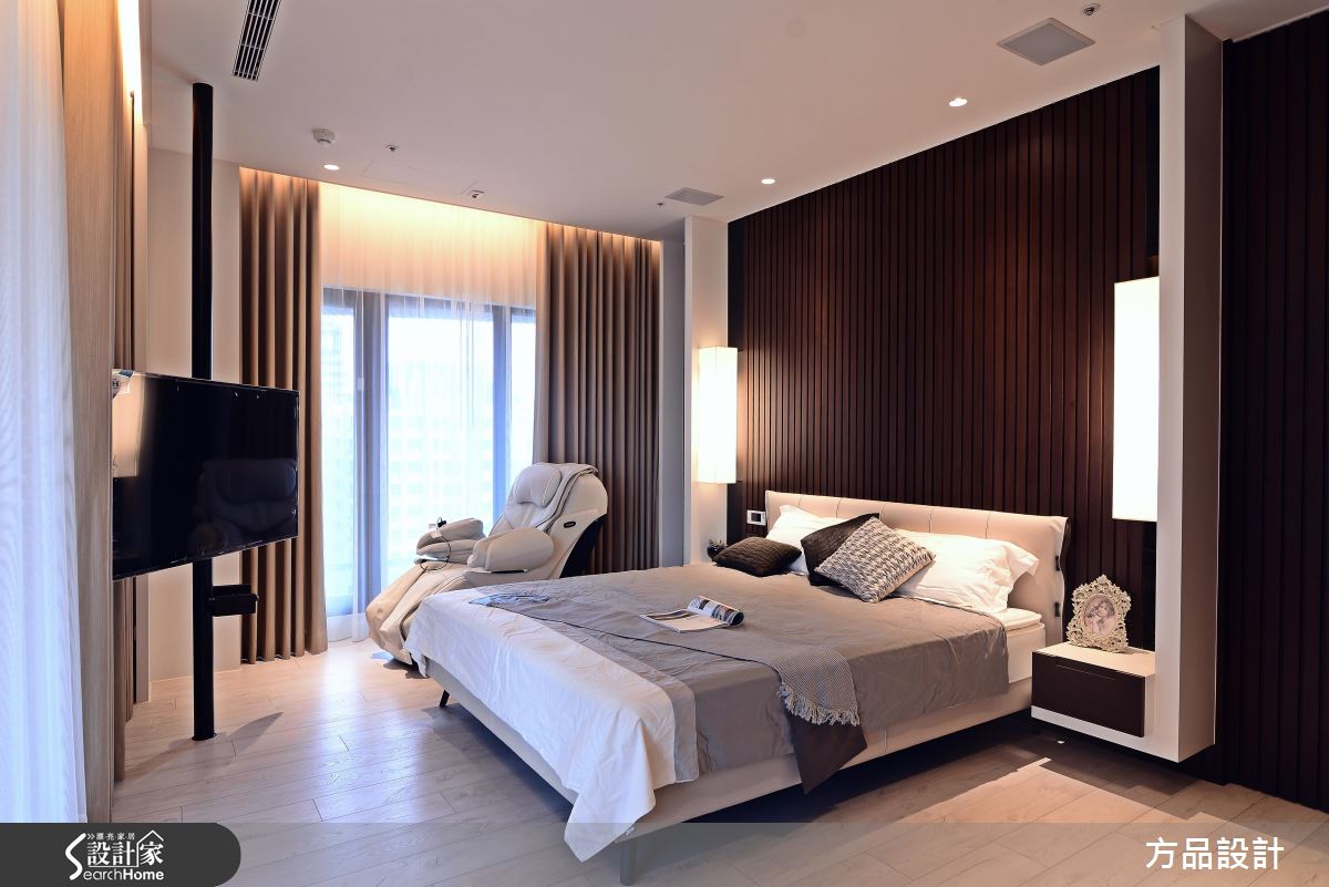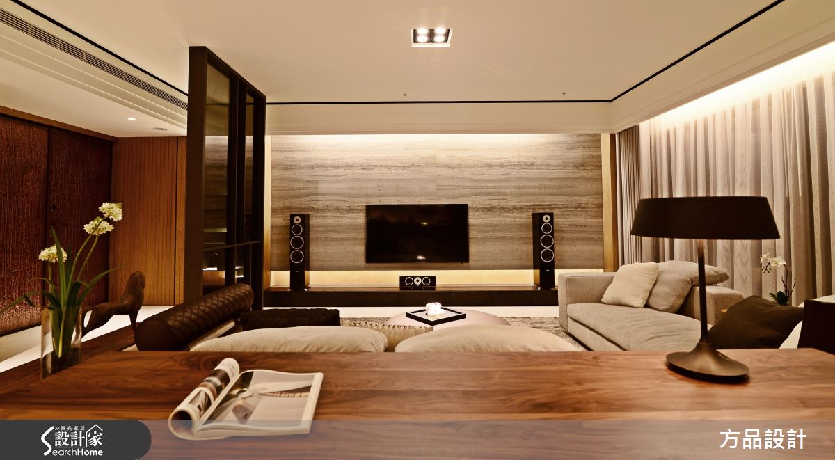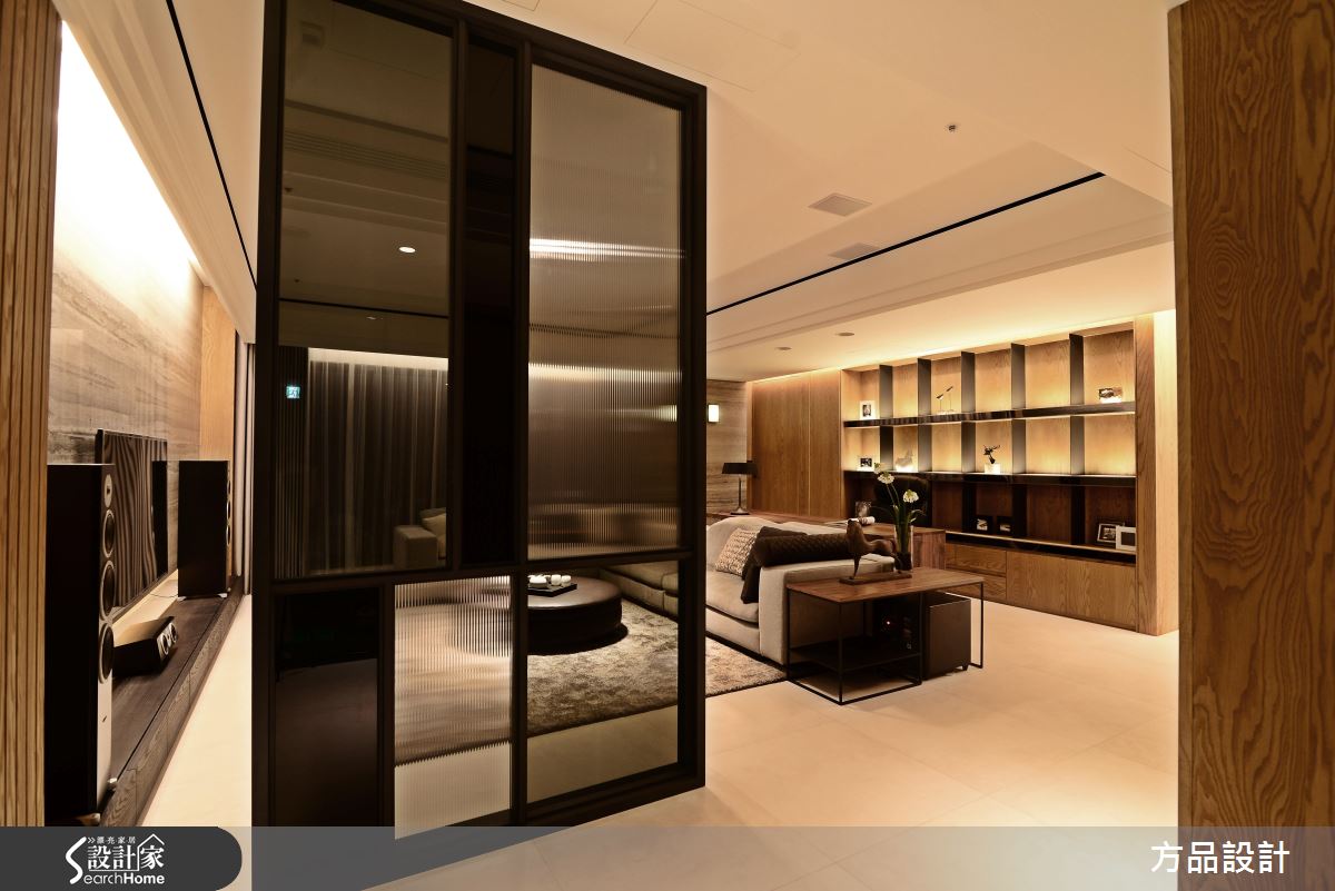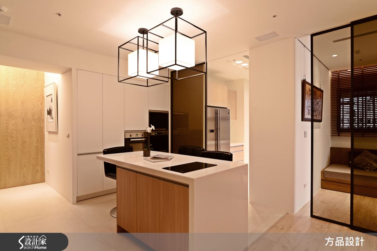 為了緩解穿堂煞的風水禁忌,設計師採以通透建材打造玄關屏風,以鐵件為骨架,讓清玻、灰玻等各式玻璃相互穿插,營造現代感俐落畫面;公領域將客廳、書房開放串聯,以大理石鋪述電視主牆,建構大器內斂的立面表情,書房後牆面則結合開放展示櫃,以木皮搭構溫和背景,襯出家飾收藏物的質感,並使用燈光點綴提升溫度,替俐落的現代格調揉入一絲暖意;餐廚場域規劃開放吧檯,將輕食、熱炒區域予以區隔,並讓白色、木質相互交錯,使電器設備做出完好整合,賦予美感、機能的雙重享受;寢臥床頭給予深色木作線條延伸,無形中拉長了牆面尺度,並讓床頭櫃呈懸吊之姿,巧妙與空間假柱相結合,而旋轉電視牆的設計,則體貼滿足了任一角落的觀賞視角!