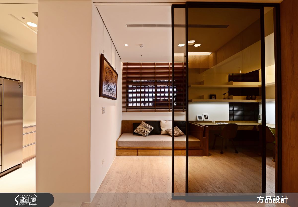 書房兼起居場域以拉門取代實牆,保留良好採光與生活互動性,並鋪陳木地板、配置木百葉窗,在百看不厭的木元素之中,導入放鬆且紓壓的氣氛!