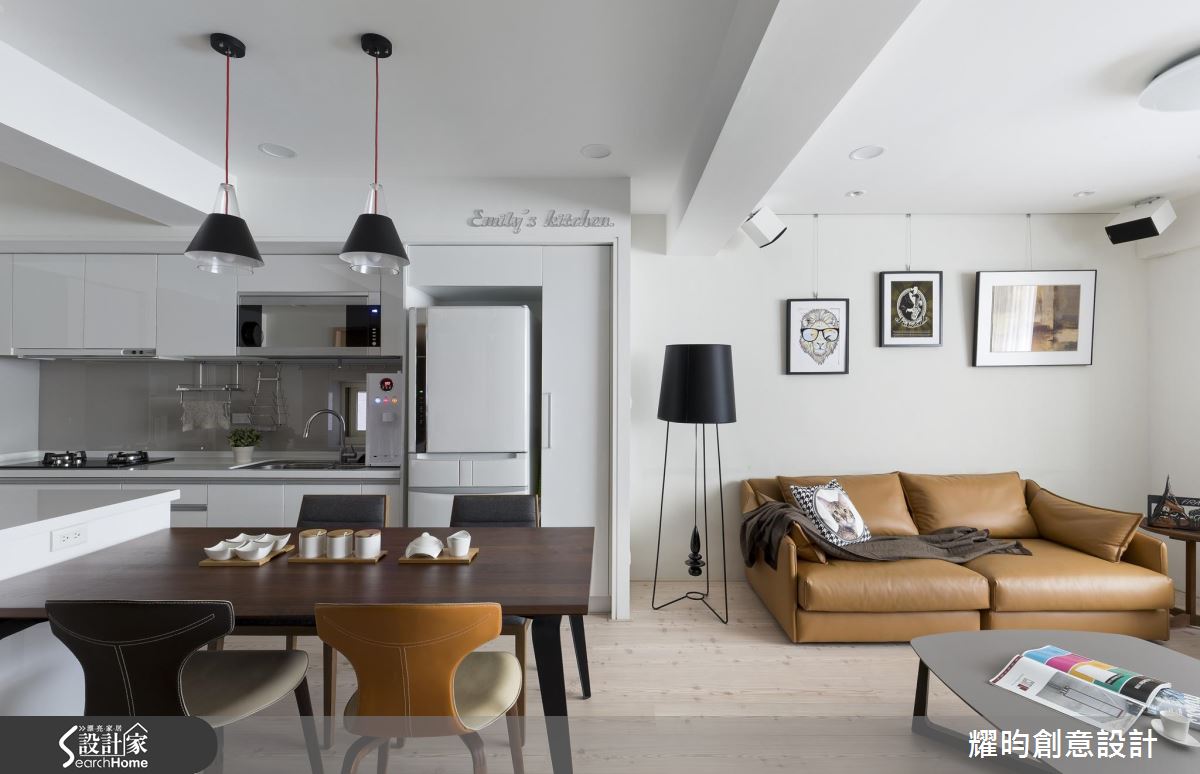設計師矯正格局比例,將開放式餐廚空間置於長形屋中段,成為居家中心點,更將 Emily’s kitchen 字樣以書寫體雋刻在牆面,創造獨一無二的專屬氣息,吧台與餐桌結合,與一字型廚房形成流暢動線。針對風格營造,設計師在純白空間內納入色調輕淺的超耐磨地板,佐以造型簡約的大型落地燈、皮製質感的沙發與掛畫,讓日光成為主角,一舉翻轉老屋的採光與通風問題,更善用客廳窗沿下方空間創造櫃體機能。
