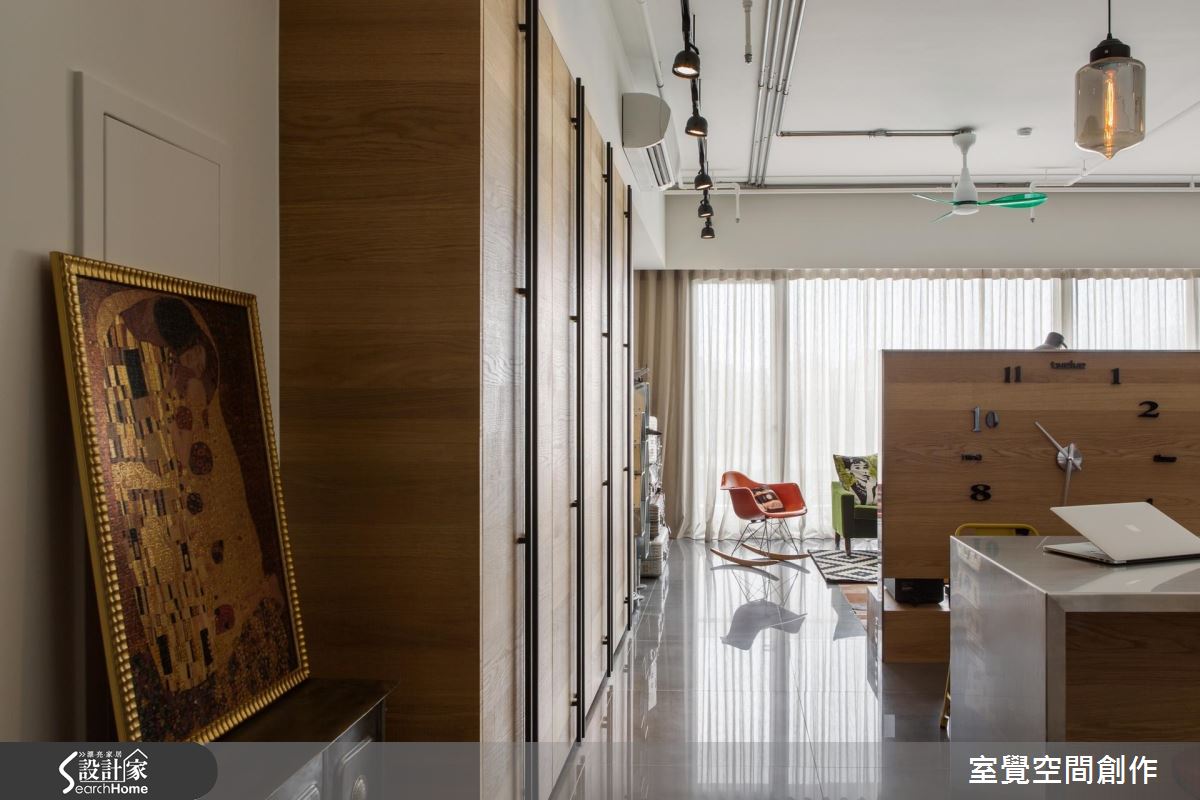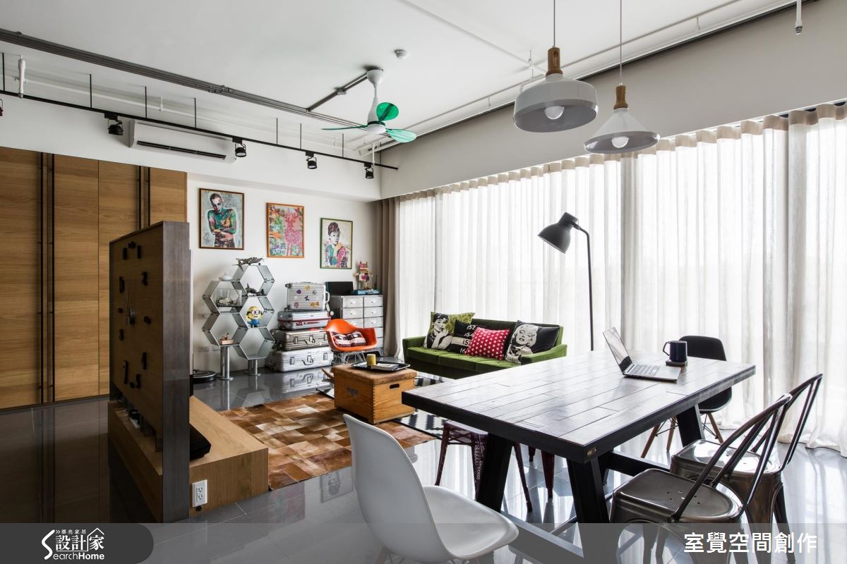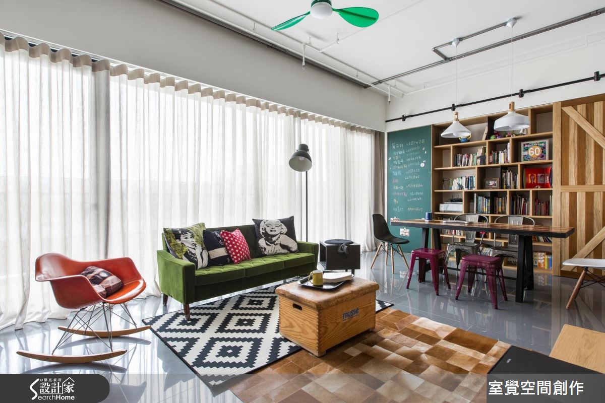 從玄關起始,即透過生活感的物品擺飾,展現私人風格主張,傳遞出有感的溫度;走進公領域,藉由客廳大面窗導入豐沛採光,結合穿透開放的場域界定,型塑均勻明亮的場景,整體利用雙面使用的低檯度電視牆、中島吧檯做為領域區隔,在層次井然的序列之中,營造順暢的行進動線,天花板保留了裸露管線,以軌道燈、吊燈的高低錯落,創造起伏的活潑線條,而客廳所加入的軟件擺設,則可見居住者獨到品味,在鮮豔色彩,造型感十足的家具堆砌之下,建構廳區趣味畫面,一旁連結開放式書房,以木質書牆構築美好風景,提升居宅的人文氣質,不僅提供閱讀、辦公主題,更網羅餐桌或孩子寫作業功能,醞釀隨興自然的家庭共處時光!