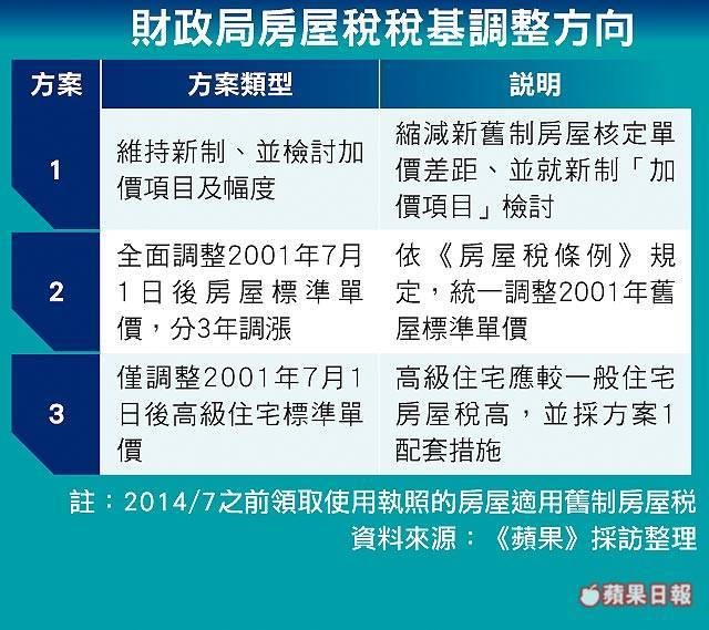 明年1月委員會討論為弭平新舊稅制差距,財政局針對舊版房屋稅提出3大調整方向,包括全面調整2001年後未調整的房屋標準單價,分3年調漲;擬2001年以後市價8千萬元以上房屋才課徵豪宅稅。財政局將持續蒐集各方意見,明年1月提交不動產評價委員會討論,最快2017年7月實施。
