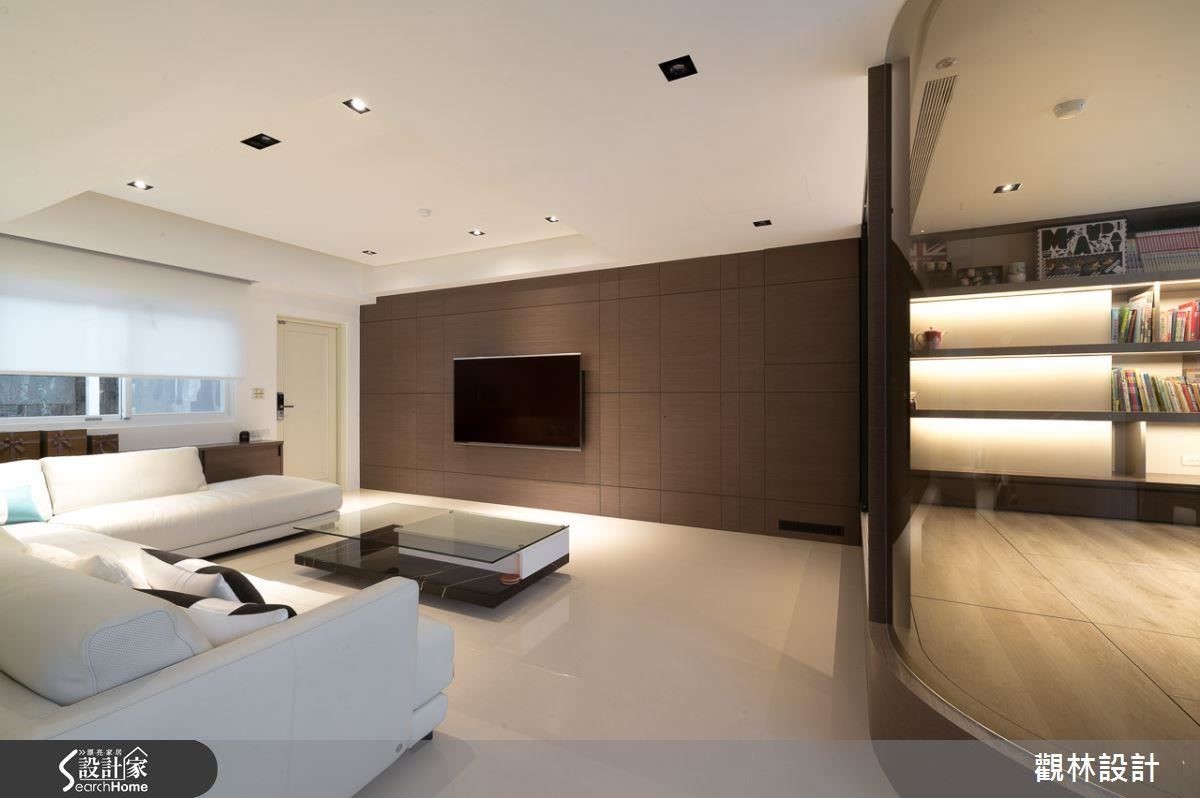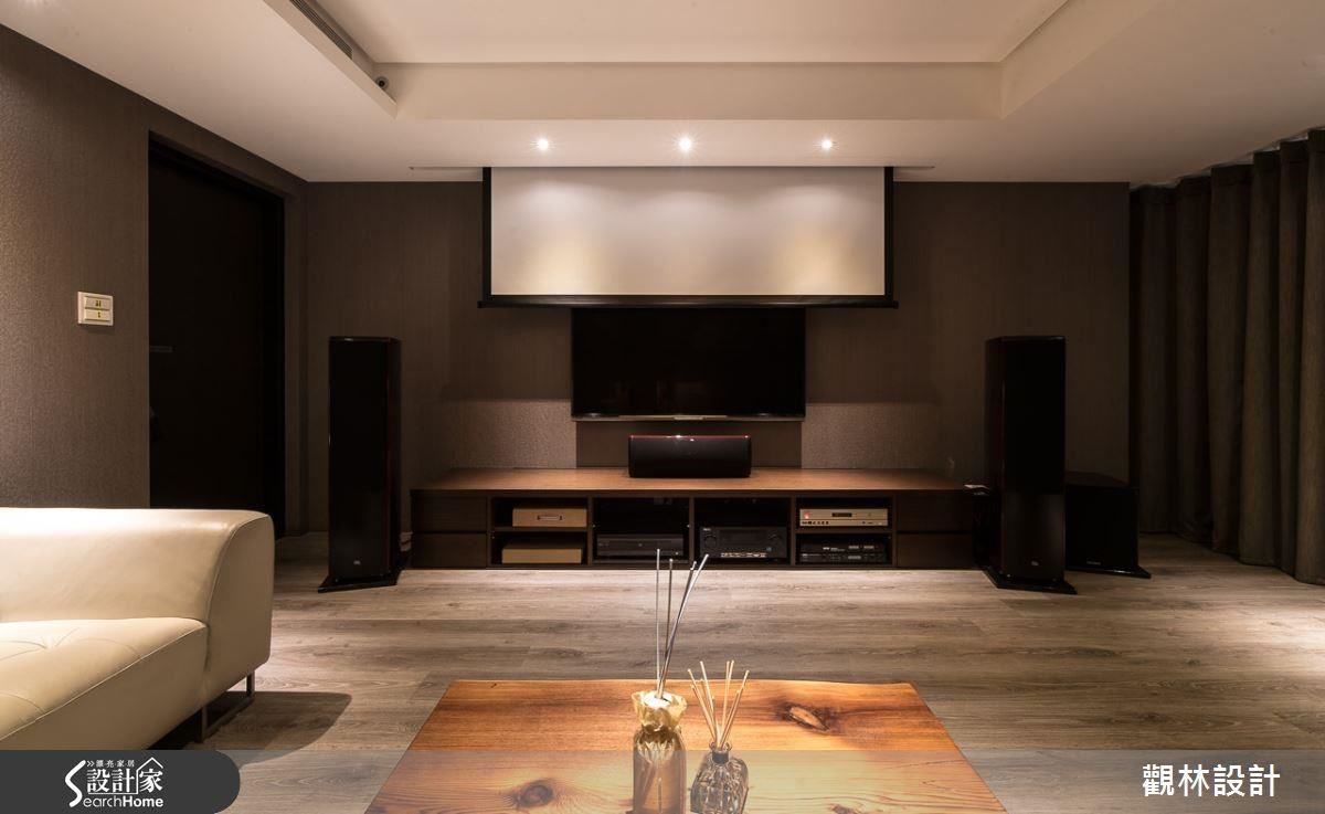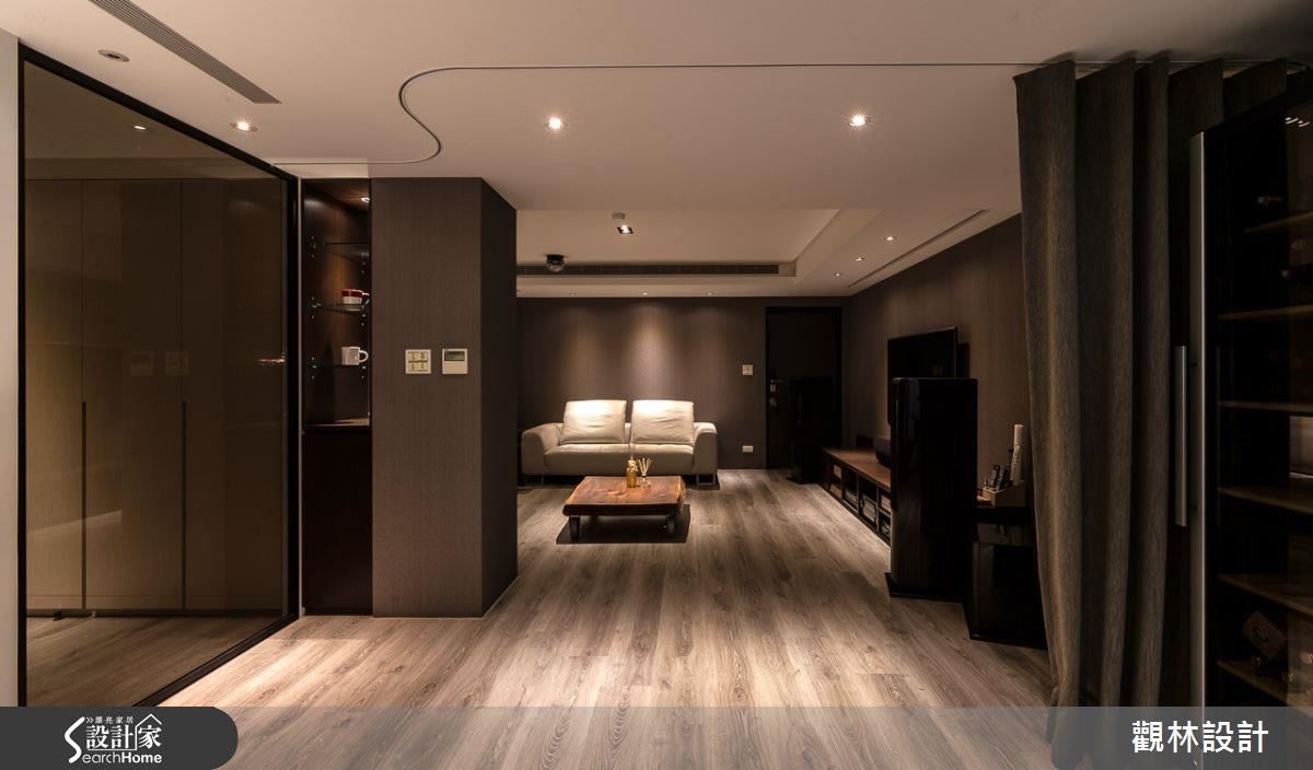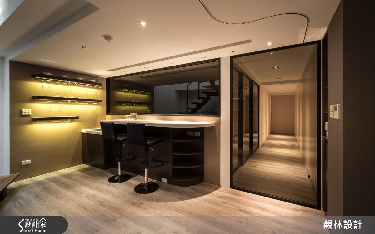 將私領域臥房及獨立書房集中在地下室,運用茶玻拉門區隔,讓隱私不受干擾;入口處增設小型吧檯,滿足輕食、茶水間的需求;大型簾幕區隔另一起居空間,結合家庭劇院、卡拉 OK 等影音娛樂。