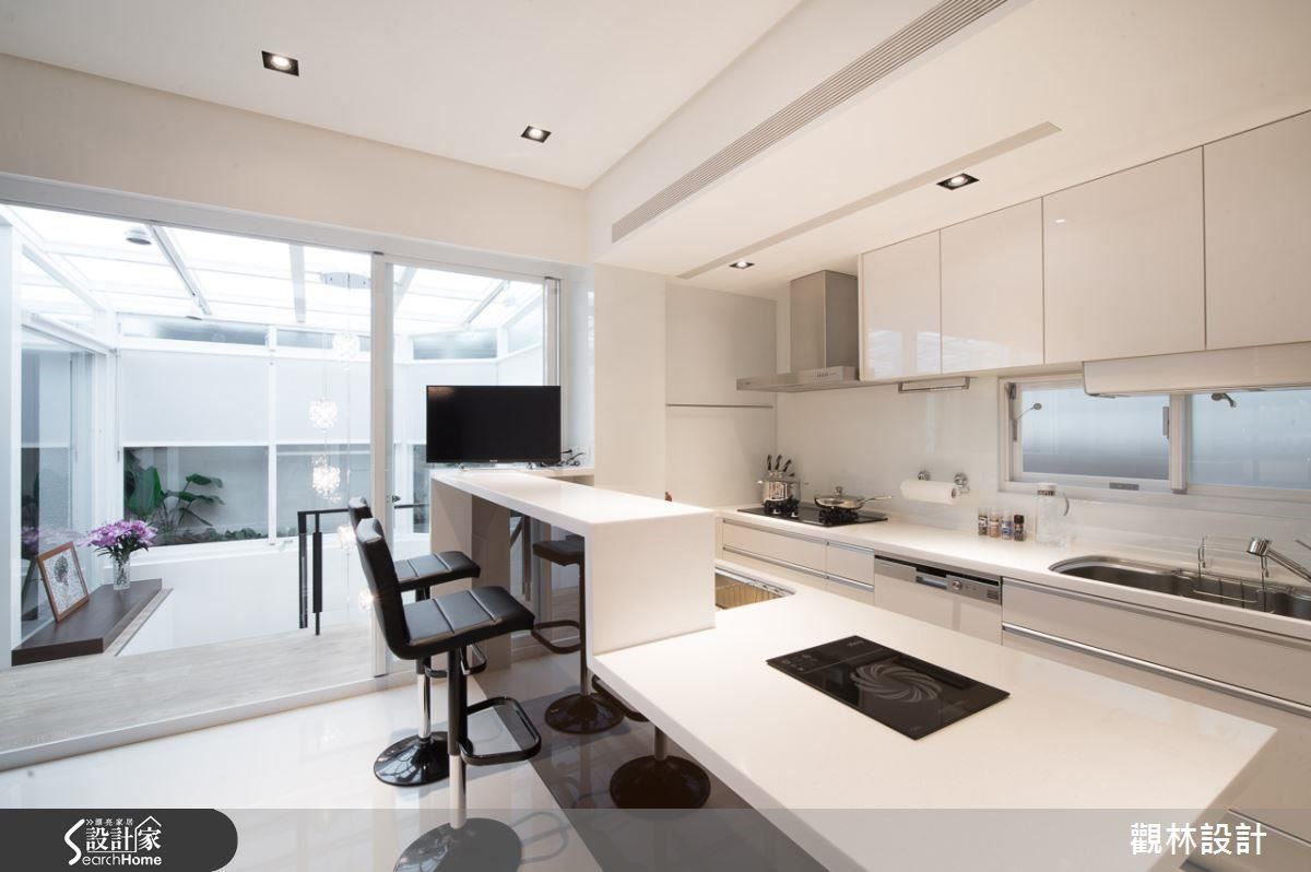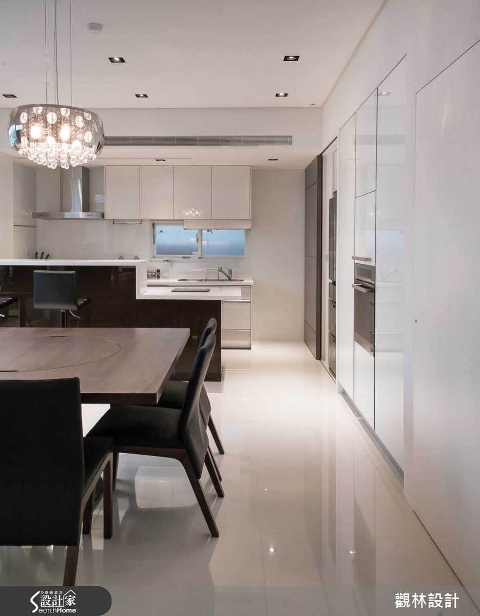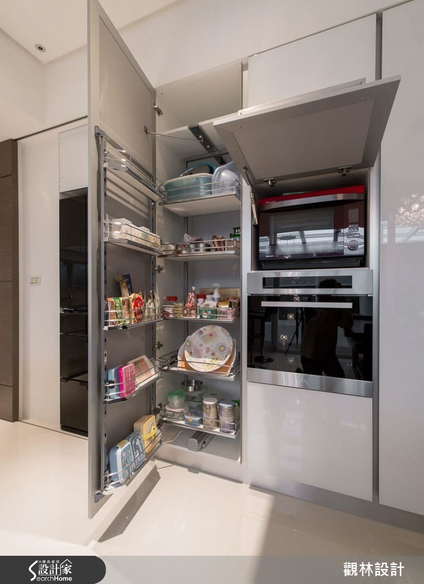 一家五口的收納需求非常龐大,除了一字型廚具之外,增設吧檯,滿足輕食、收納的需求,再利用牆的立面,整合烤箱、冰箱、食物櫃等設備,滿足大容量烹調用具、食器、乾糧的收納需求。