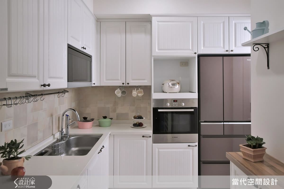 因為有在家烹飪的需求,設計師將廚房規劃為 L 型配置,以活動式拉門阻隔油煙問題,延續全室的白色主調,廚具也選擇同樣色系,局部跳色搭配來自義大利的復古磁磚,帶出簡樸而溫馨的親切氛圍。