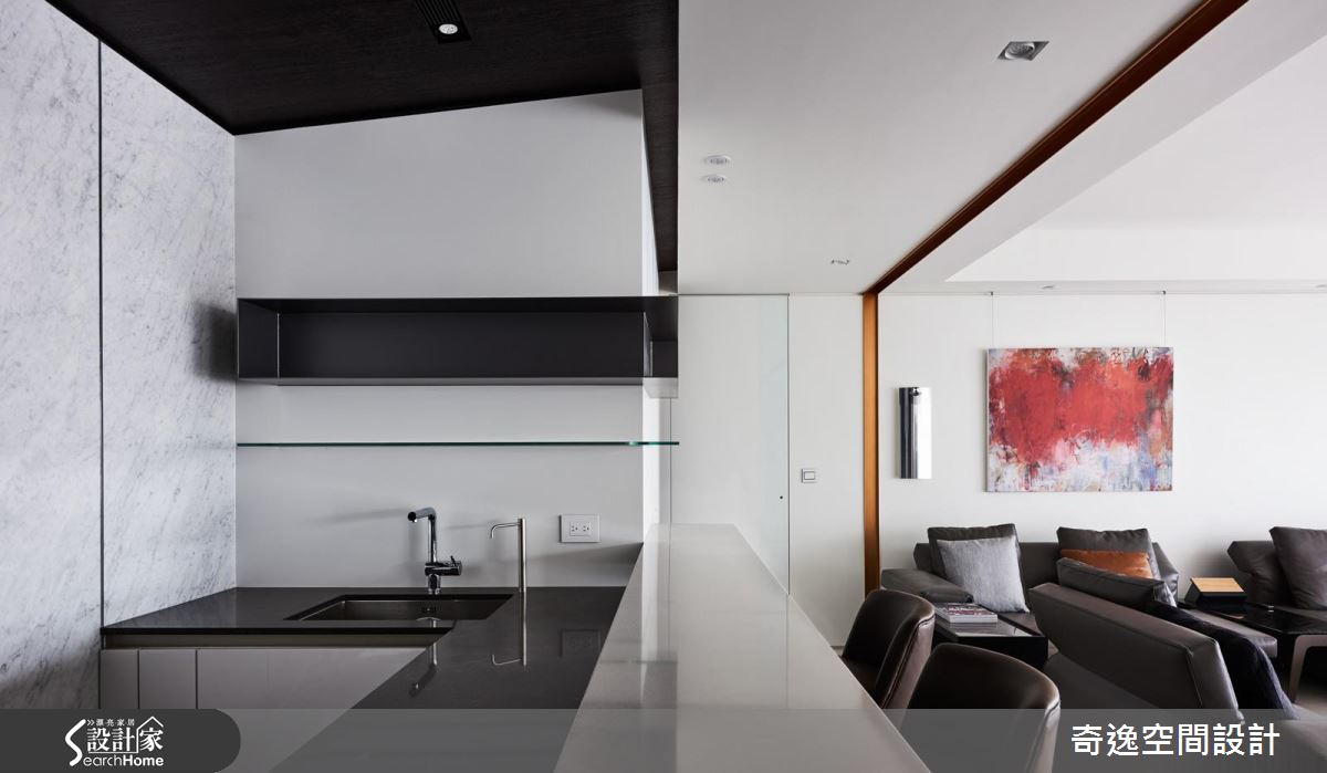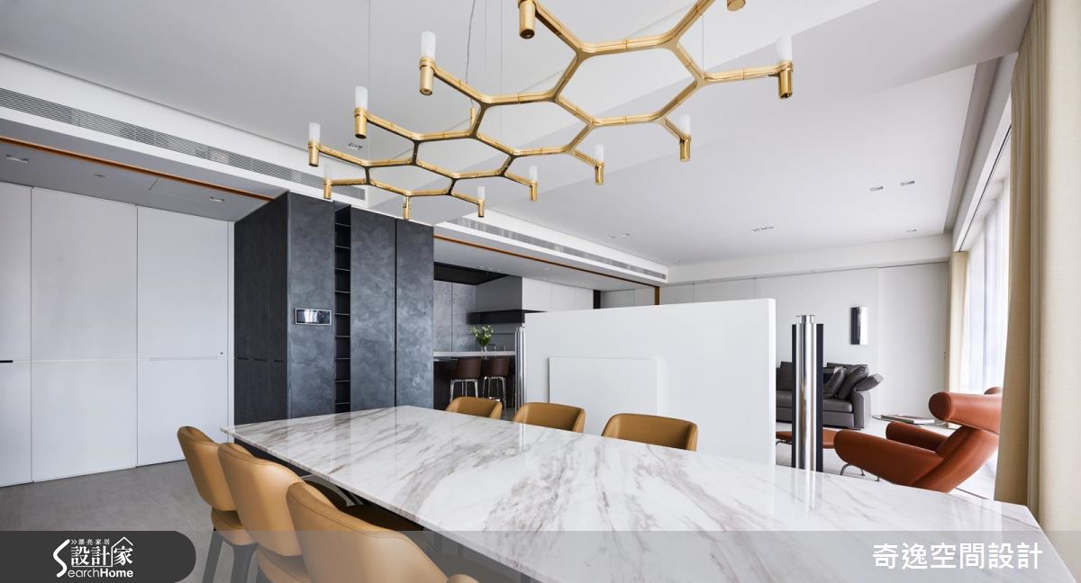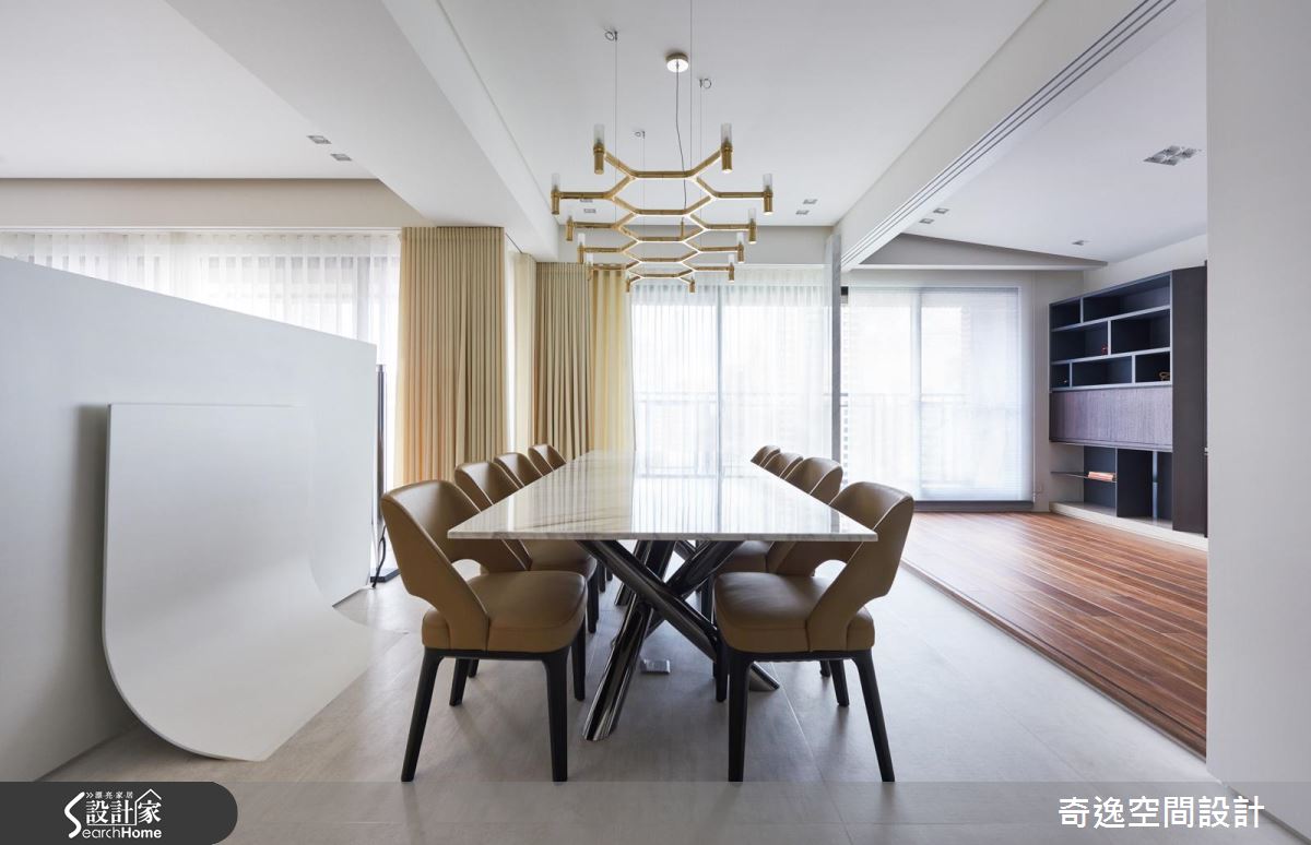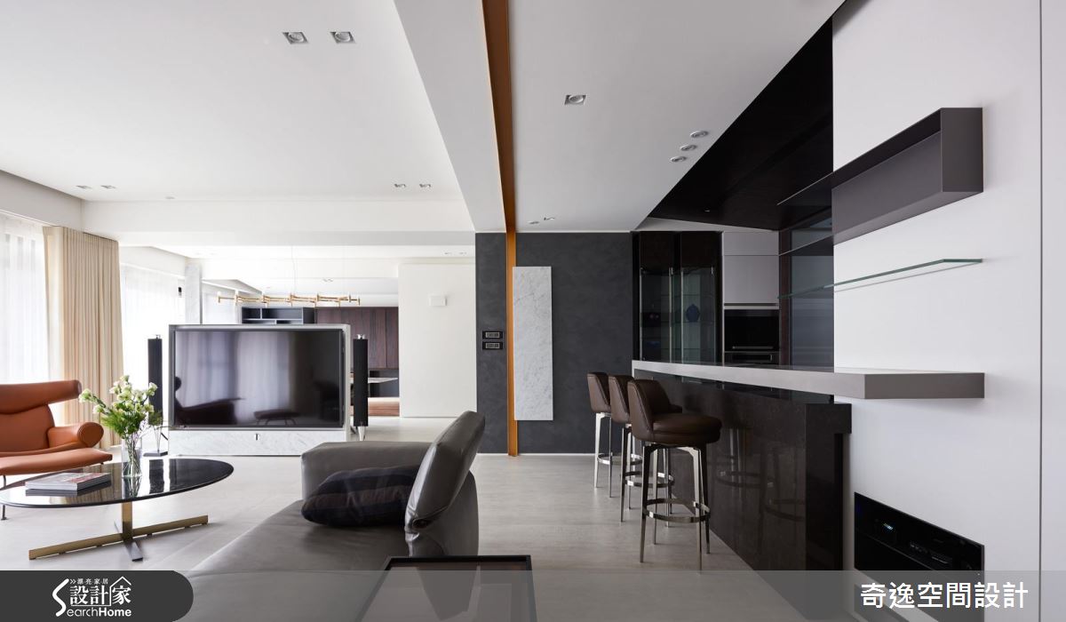 首先,設計師虛化走道界線,抹除一般對於走道的制式印象,將臥房分別隱於客廳左右後方,不僅打開了光照視野,更搭配天花金框線條,作為客廳與吧台的無形場域分屆。接著調整客、餐廳與書房位置與比例,將三者置於同一水平,拓增客廳空間,以向後傾斜 6 度、最適宜觀看的電視牆為客餐廳分野,回字動線讓動線更顯通透大器。餐廳與書房以活動式拉門與地坪為界,創造多功能應用空間。主臥以拉門設計劃分更衣室與睡眠區域,其中兩個孩子的房間也以刻意不及頂的拉門作為區分,同時兼具隱私與開放性。主臥衛浴更以前衛概念將鏡面延伸至天花,搭配不鏽鋼噴漆架面,為採光優勢創造摩登設計。