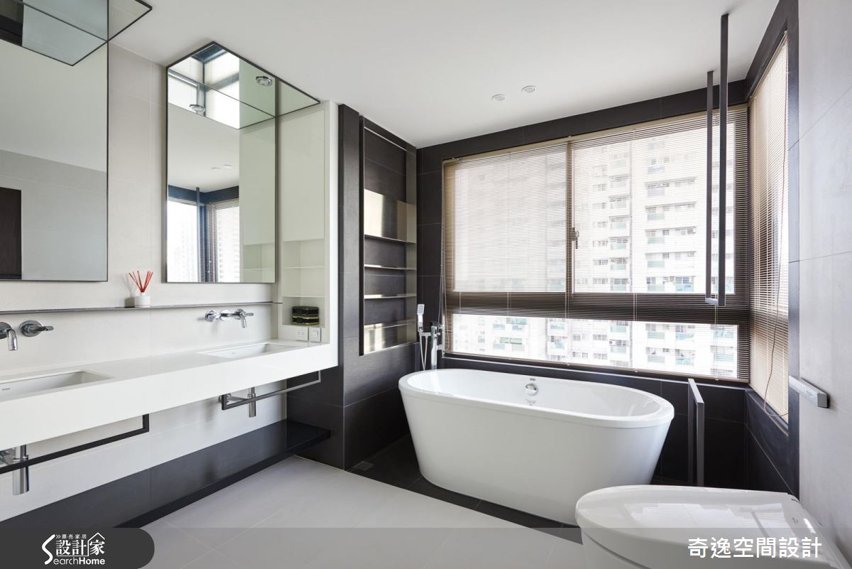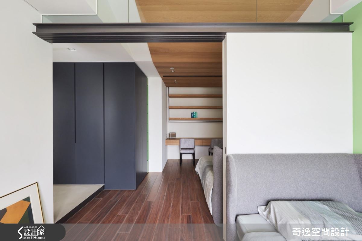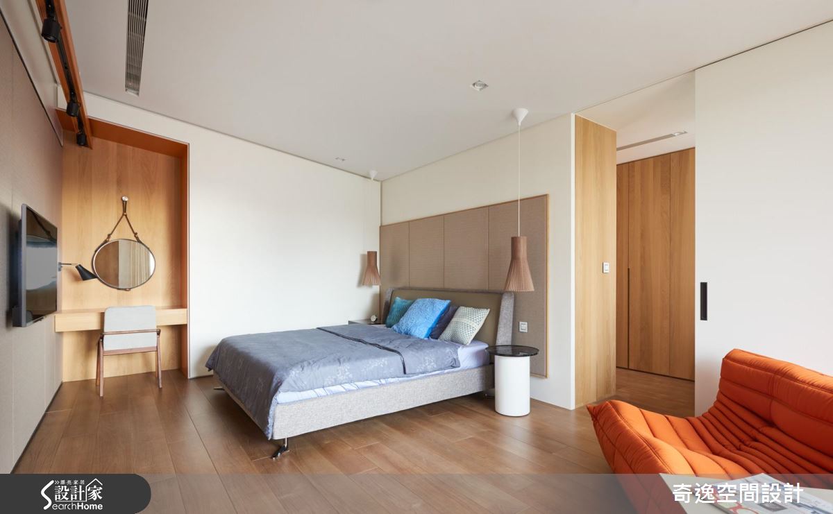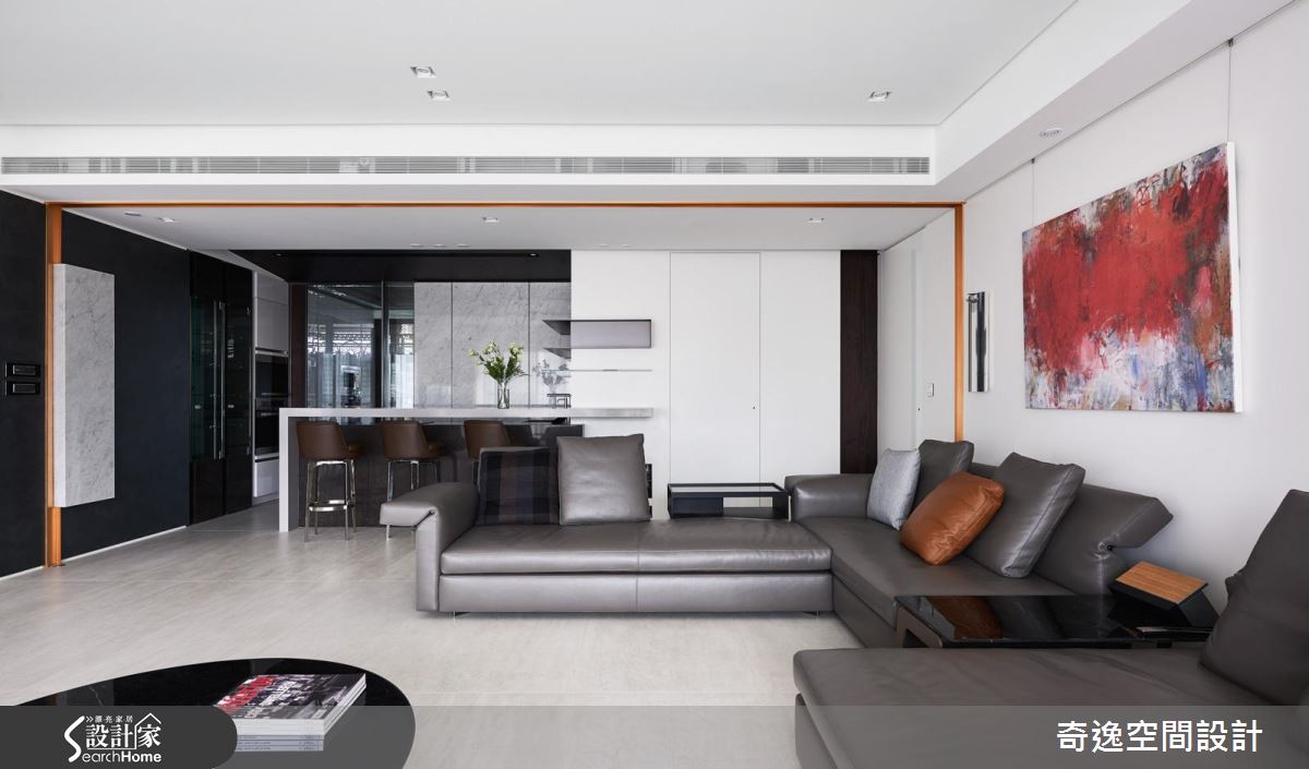 首先,設計師虛化走道界線,抹除一般對於走道的制式印象,將臥房分別隱於客廳左右後方,不僅打開了光照視野,更搭配天花金框線條,作為客廳與吧台的無形場域分屆。接著調整客、餐廳與書房位置與比例,將三者置於同一水平,拓增客廳空間,以向後傾斜 6 度、最適宜觀看的電視牆為客餐廳分野,回字動線讓動線更顯通透大器。餐廳與書房以活動式拉門與地坪為界,創造多功能應用空間。主臥以拉門設計劃分更衣室與睡眠區域,其中兩個孩子的房間也以刻意不及頂的拉門作為區分,同時兼具隱私與開放性。主臥衛浴更以前衛概念將鏡面延伸至天花,搭配不鏽鋼噴漆架面,為採光優勢創造摩登設計。