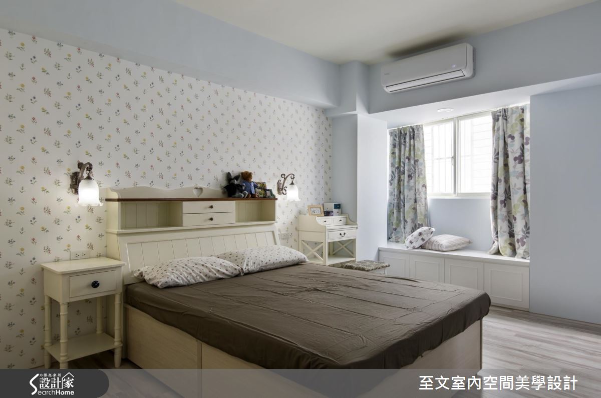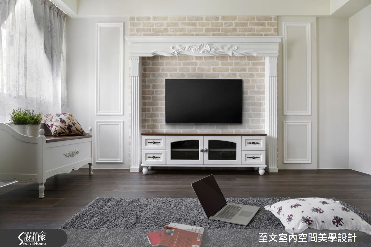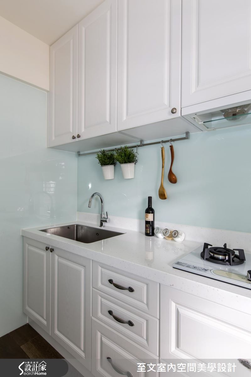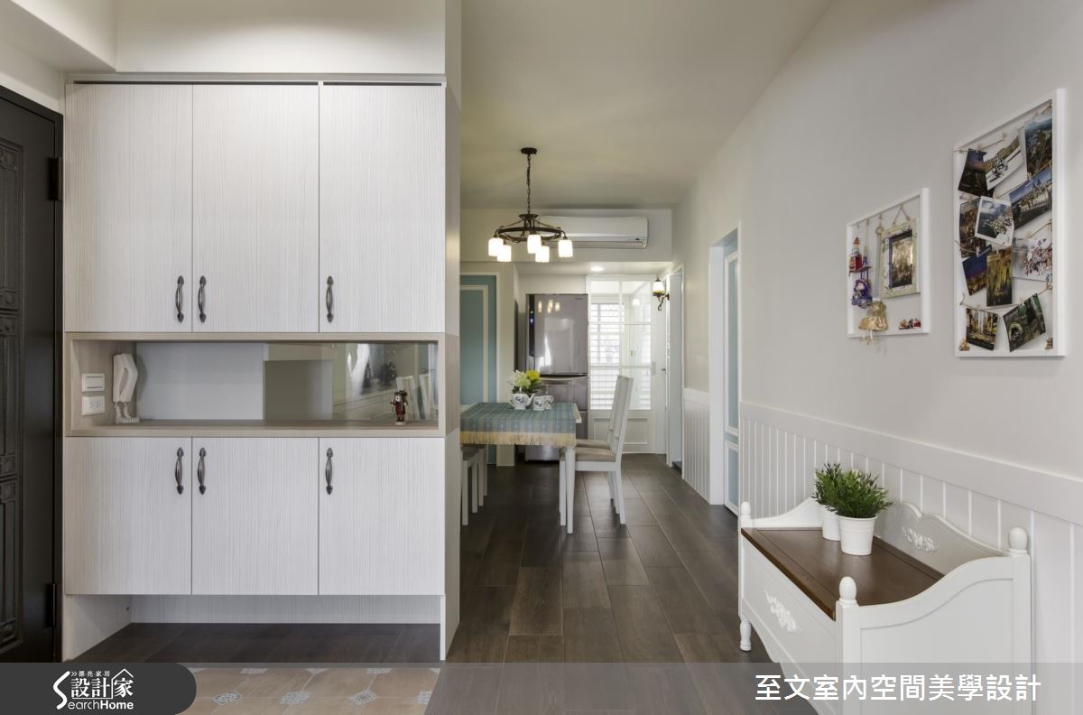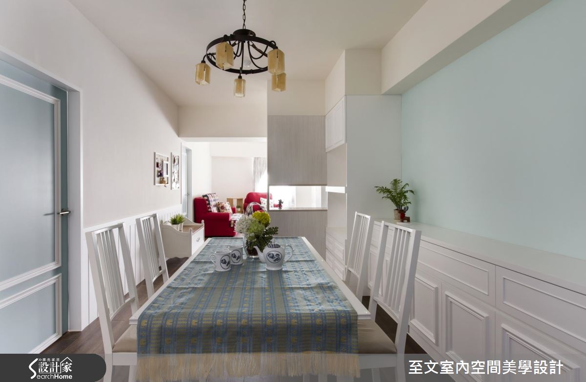 空間以白色作主調,搭配大面積深色木地板舖陳,營造穩重不失輕盈的視覺質感,並陳列紅色格紋沙發跳出鮮明度,替簡白背景添注一絲熱情風韻,電視牆機能則結合壁爐造型,加入線板、雕花等古典意象語彙,雕塑出細緻之美,且額外規劃投影機與升降布幕,賦予多元的視聽娛樂享受;餐廳呈開放格局,達到借引廳區光線的目的,並透過中段透空的玄關櫃體配置,作出與客廳之間的界定,搭配廚房門片改為橫推式玻璃格子門,使雙面採光可充分進入用餐範圍之中;寢居經由壁紙與淺灰藍色調打造甜美主題,窗邊則巧思做出臥榻設計,並善用活動家具與軟件擺飾、減輕繁複裝修成本,構成輕簡淡雅的空間氛圍!