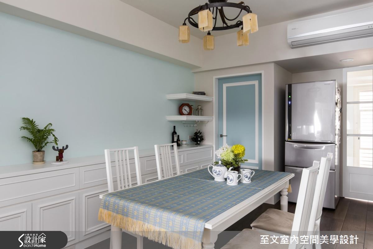 房門一致以線板滾邊結合淺藍色調,讓立面表情顯得優雅且立體,道出美式鄉村風的經典特色!