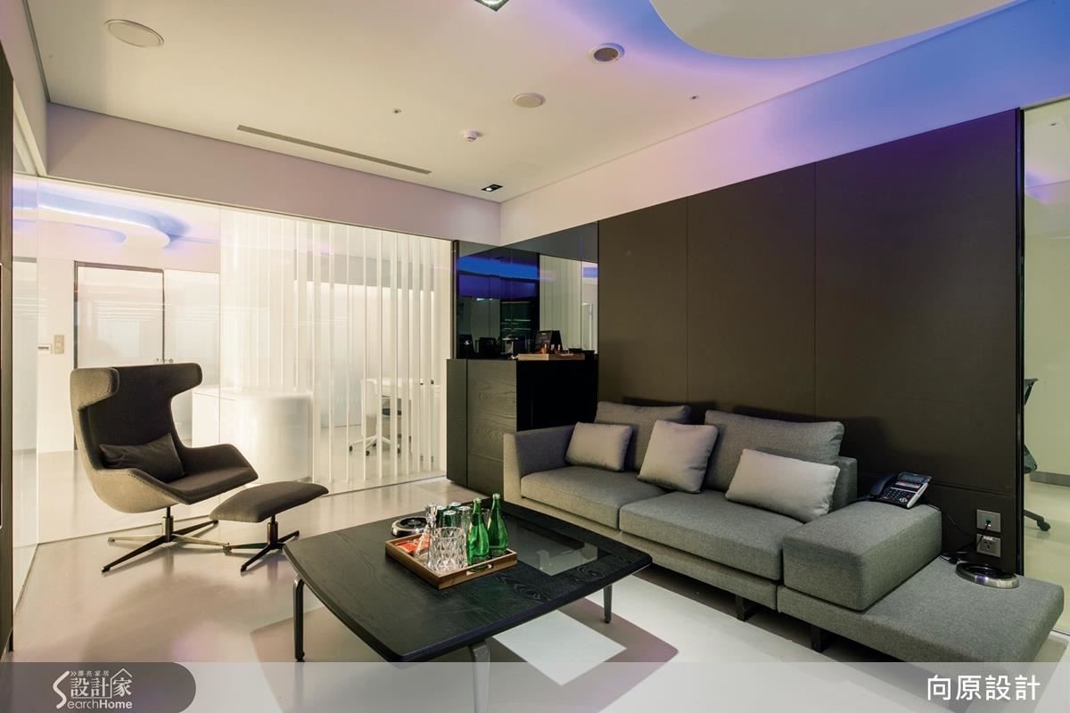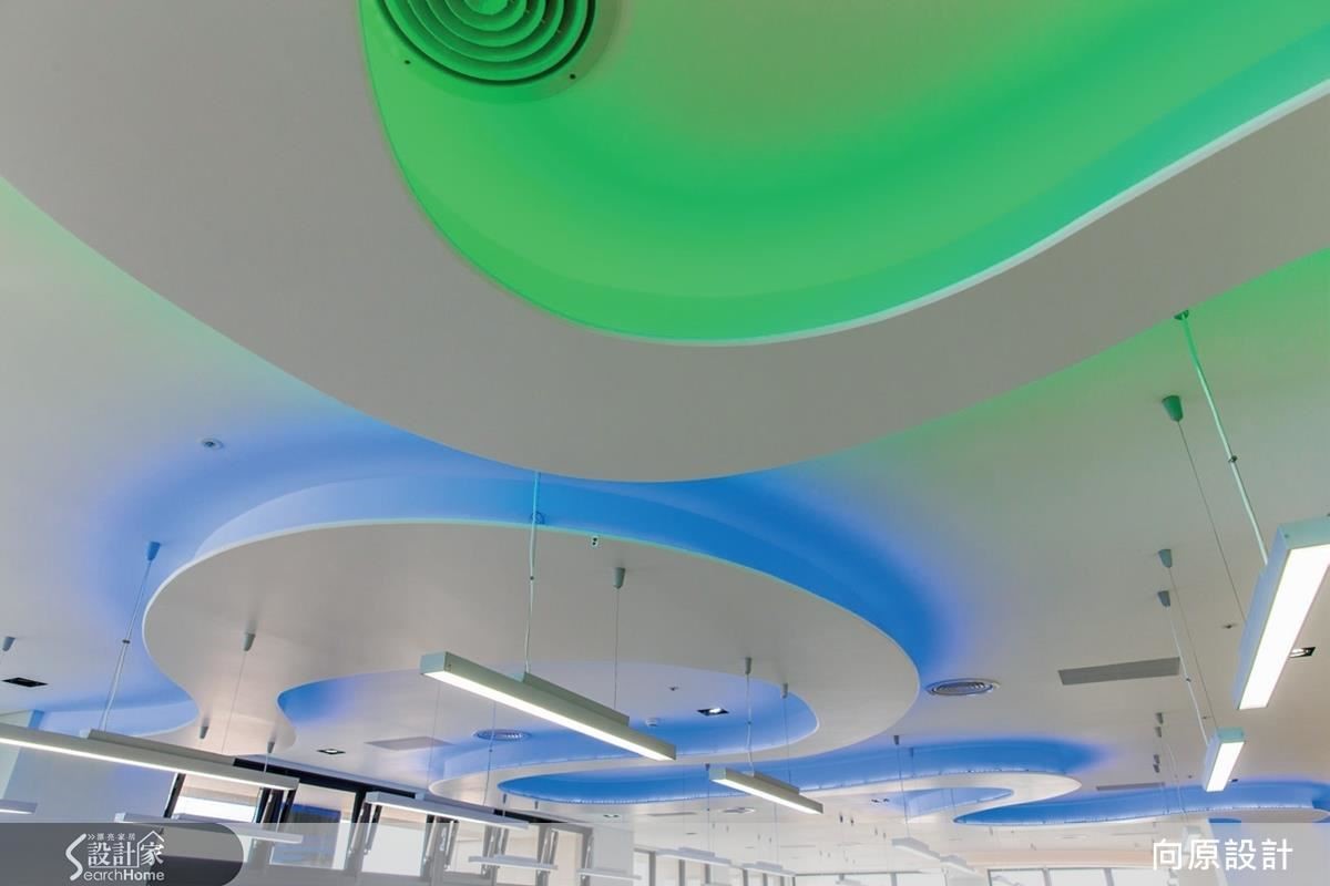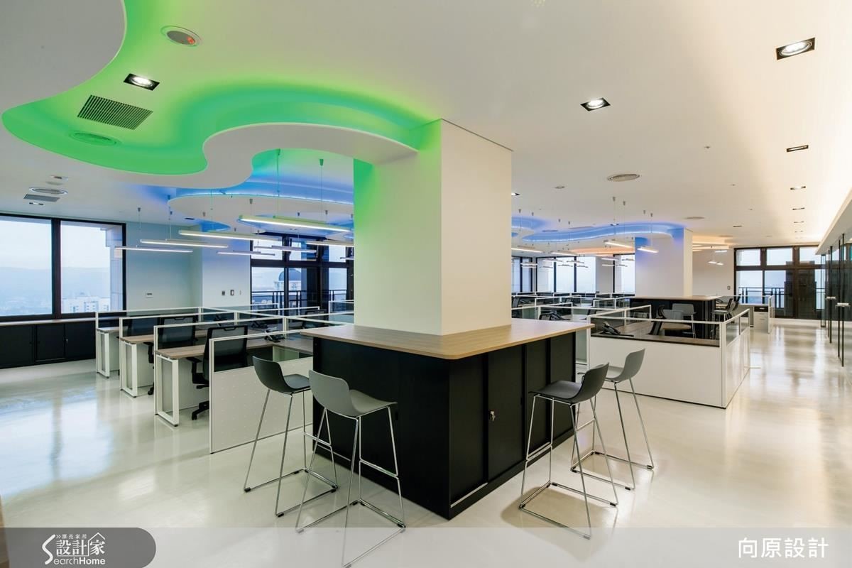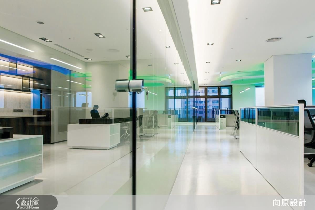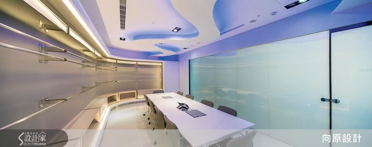 空間前身為毛坯屋,在向原設計的精心安排下,將兩戶予以打通,型塑敞朗大器的辦公場域,並依循業主期望的風水佈局,整合員工座位、辦公室與會議室等區域,讓走道與區域之間維持清晰界定,但保有流暢的串聯,尤其採用清玻璃隔間,細心考量到員工座位的隔屏高度,使三面採光得以不受阻礙地流通,營造明亮開闊的工作場景。「商空設計不同於居家裝修,空間的焦點特色須更為鮮明、有驚喜感,帶出讓人印象深刻的企業特質。」向原設計表示道。於是在此空間內,以大面積素白作為背景,隱喻胚布無雜質的基底,並巧妙加入圓弧流線、多彩燈光,不僅將六種企業色融入其中,更帶出了布料柔軟具層次的意象,色彩更可隨時彈性變換,不僅使辦公室多了繽紛意趣,更可迎合到訪客戶的企業色彩,打造賓至如歸的感受。