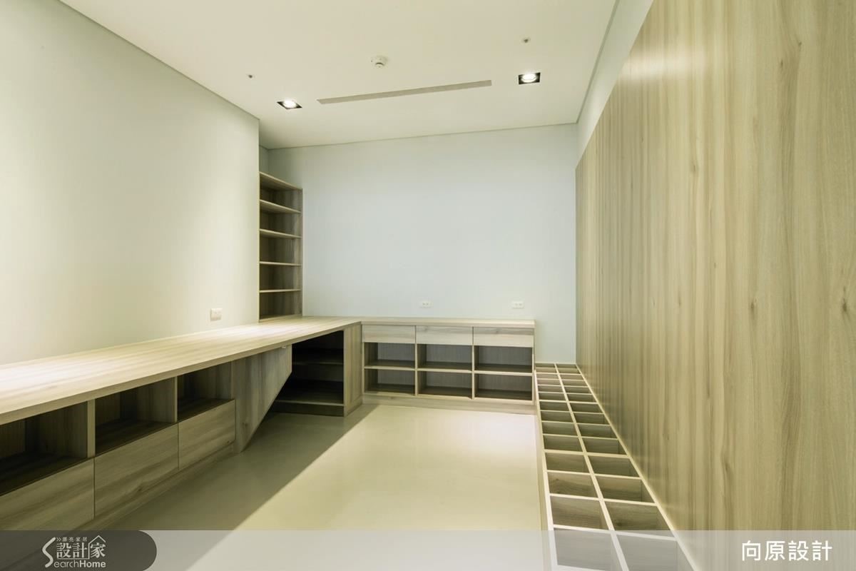 額外規劃寬敞的布樣室,以系統櫃植入收納機能,透過精準的格櫃大小,讓布料得以清晰被展示,一旁則陳列深度 90 公分的裁布桌;整體以一致的淺色木皮鋪敘,建構低調內斂的溫樸背景。
