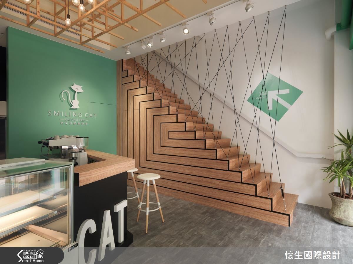 通往二樓用餐區域的樓梯,運用木質色調的暖性,大幅減少梯體的生硬感,加上黑線條紋構築而成的幾何畫面,有一路向上的延伸效果;側邊由繩索形成的不規則線性扶手設計,更是降低整體厚重感的一大亮點。