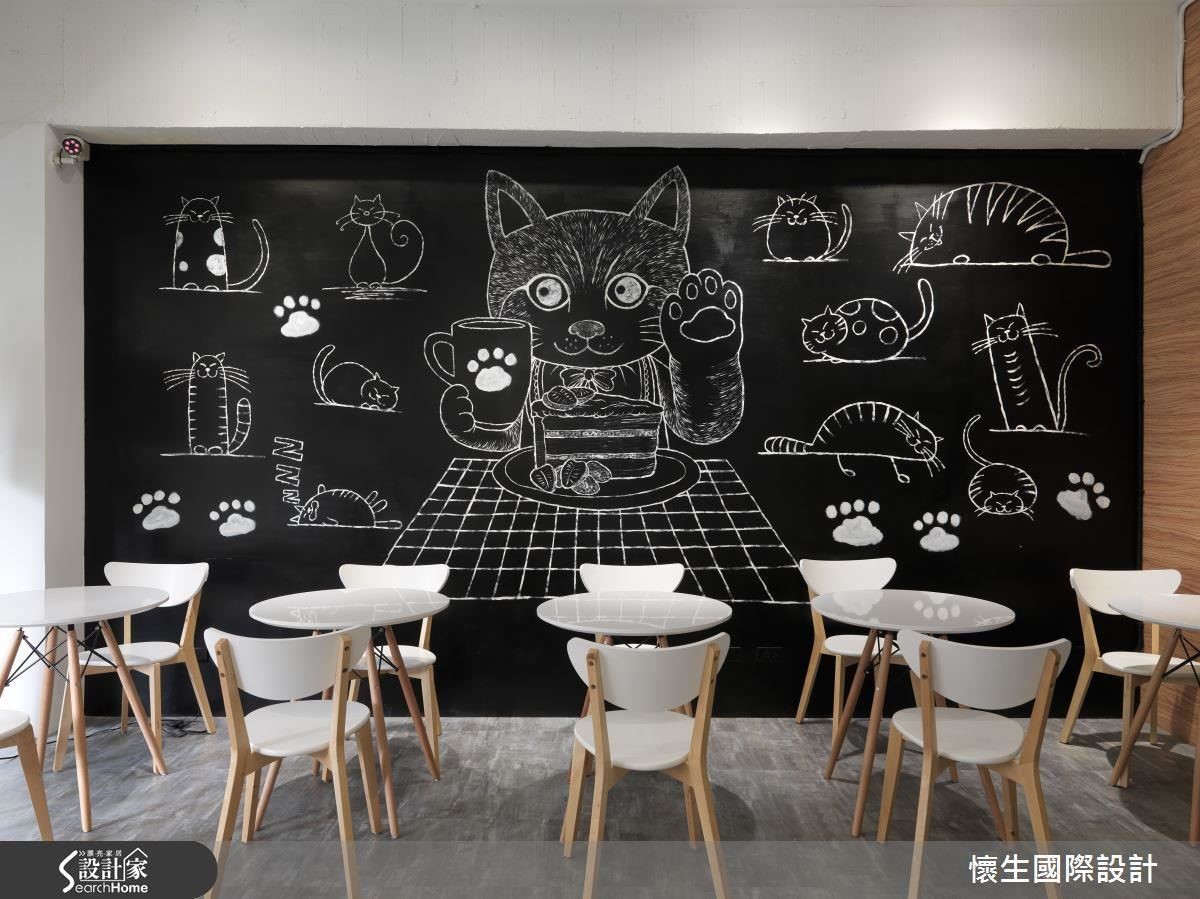 以貓咪為主角設計的主題式咖啡甜點館,在一整面的黑板漆牆上,塗鴉了各式可愛逗趣的卡通版貓咪,再次強化並凸顯主題重點,並為空間創造出一幕童話感,讓客人和童話牆上的貓咪,一起開心喝咖啡、吃點心。