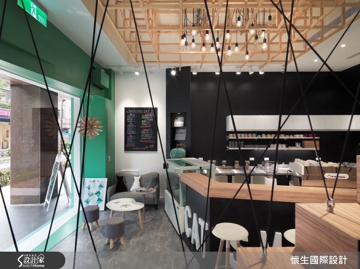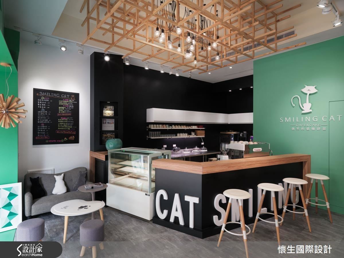 在清爽薄荷綠的色彩規劃中,輔以黑與白的對比調性,讓整體空間充滿現代簡約的氣息,而挑高的天花板上,則採用簡單樣式的燈具,搭配木質格柵的設計巧思,營造出三度空間的立體感,讓視覺表情極具豐富性和延伸性。開放式的吧檯設計和甜點櫃,除了保留咖啡甜點館的主要機能工作區,更為空間的靈活運用上,創造層次感鮮明生動的一隅,讓店容不僅只是一頁平面的漫畫書,而是一場活潑有趣的動畫電影,引人入勝。在現代色調與溫暖木質的相輔相成下,不僅柔和了整體場域的調性,更是營造出店內的放鬆氛圍,讓心情為之舒緩,悠然自在地徜徉其中。