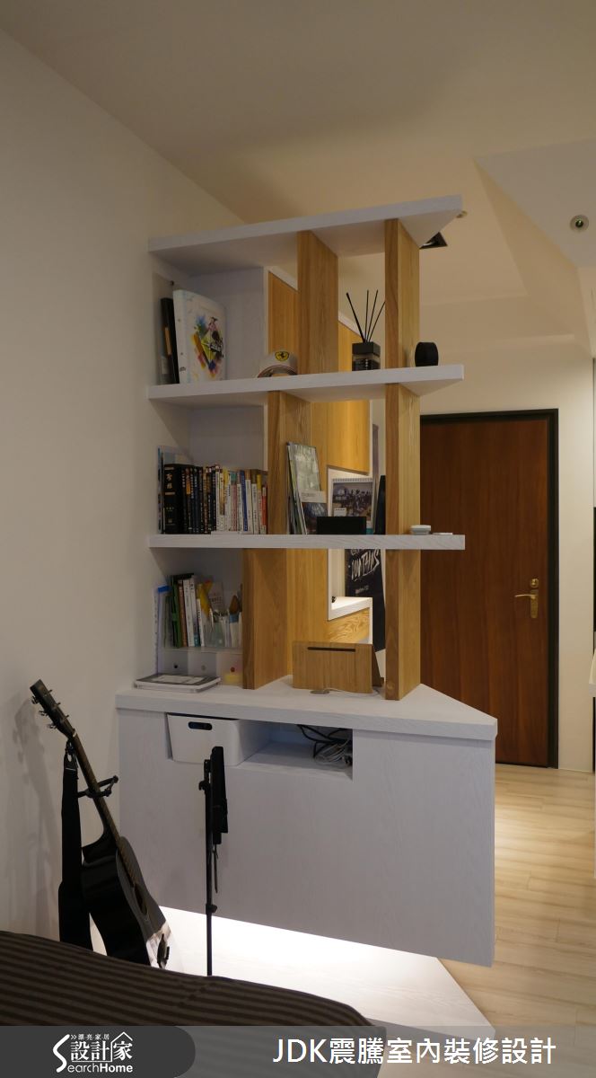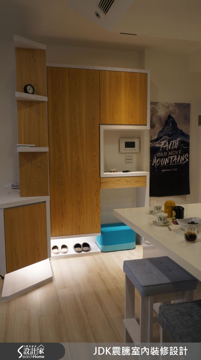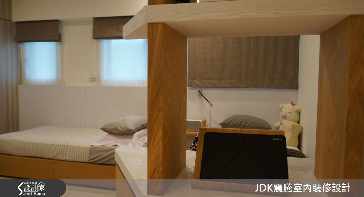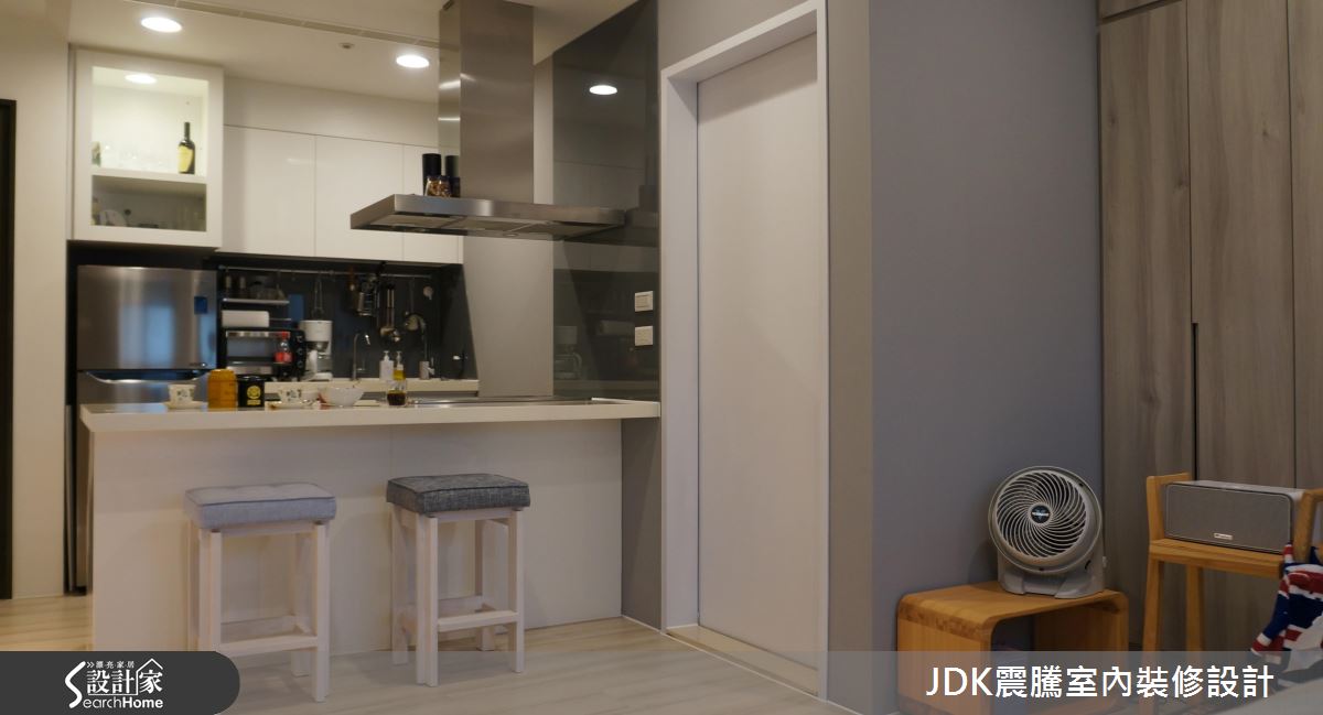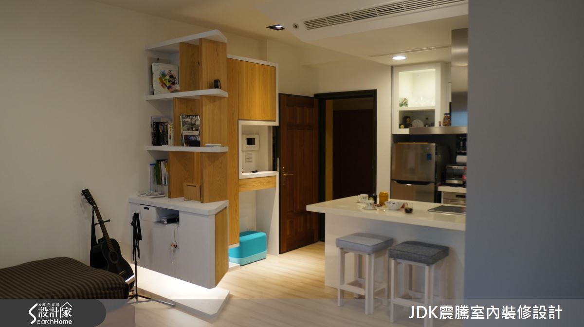 入口處,設計師配置簡易鞋櫃滿足機能,以木皮為面、白邊為框,保留開放的內凹置物檯面,搭上光源隱約映照,型塑量體輕盈質感,並連結一旁的屏風兼展示櫃,使玄關、客廳保有視覺穿透、且適度作出區隔;餐廚則在天花作出斜切角度,將空調完好包覆,並充分運用空間上半部收納空間,即便是抽油煙機上方也成了物品的絕佳展示平檯,同時給予開放格局設定,藉由亮面建材、金屬等妝點,替白色底調增添層次變化;臥房則因沒有實質隔間,維持較開闊的視野,且在牆面內嵌衣櫃,收整女孩們的諸多衣物,床頭旁則加入可調整角度的照明燈設計,挹注舒適的閱讀光源!