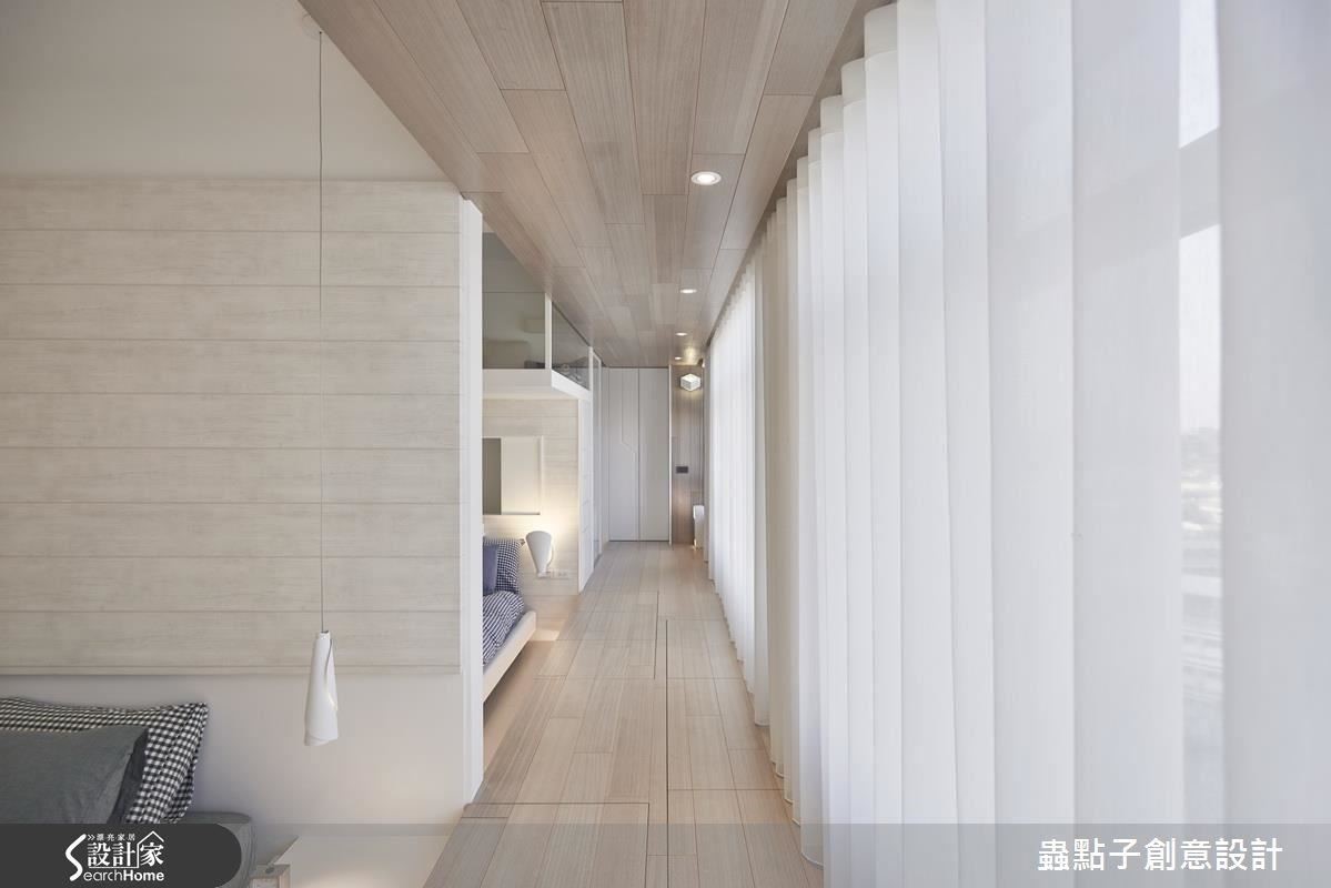 透過大膽的動線提案,設計師沿著窗邊打造一列散步道,光是待在家裡就能享受自在悠遊的休憩樂趣。