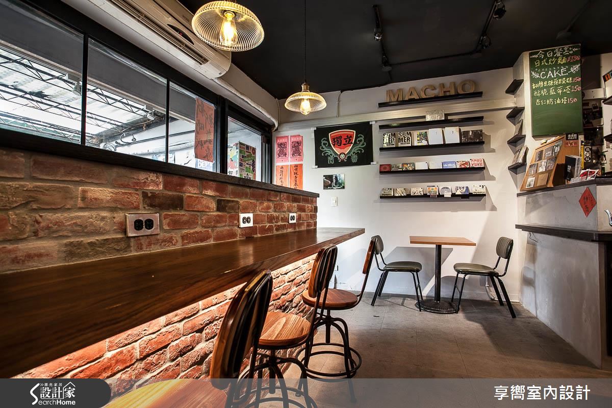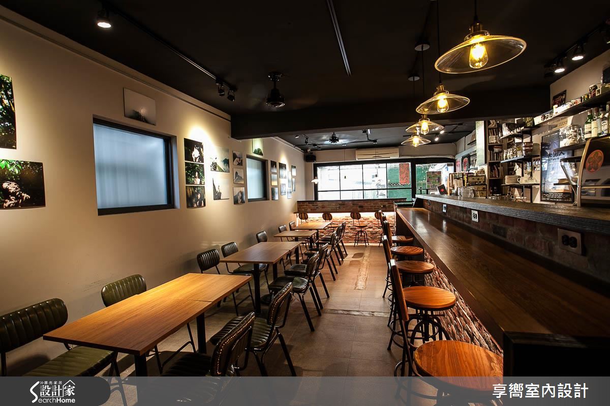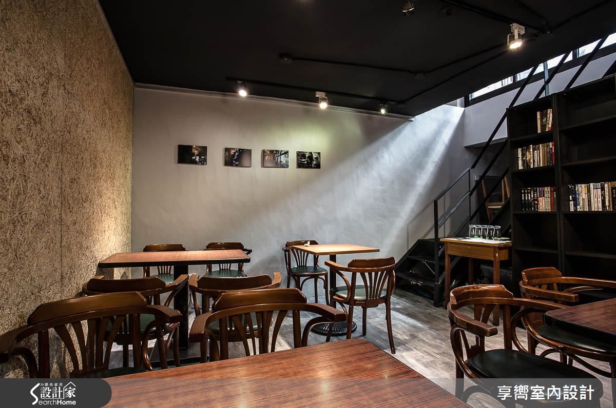 從門口進入,深邃的色彩有效提升空間的視覺高度,挹注鐵件、玻璃吊燈等元素,營造簡約復古的環境氛圍。格局配置上,重視整體動線的順暢,小巧的室內空間有序地劃分領域,在窗邊及料理區保留吧檯座位,並貼心預留電器插座位置,下方加入照明設計,利用光影凸顯磚體的層次。而寬敞開放的空間感,無形之間也連繫起人與人的互動,讓客人在品嘗咖啡之餘,能夠相互談話、交流,若是與朋友一起到訪,也具備適合多人聚會的座位區,地下室則藉由梯間引光,讓上下空間保有光度的舒適流通。