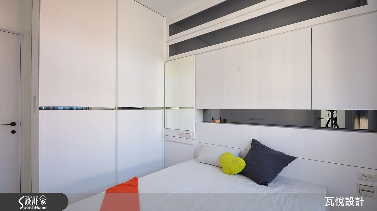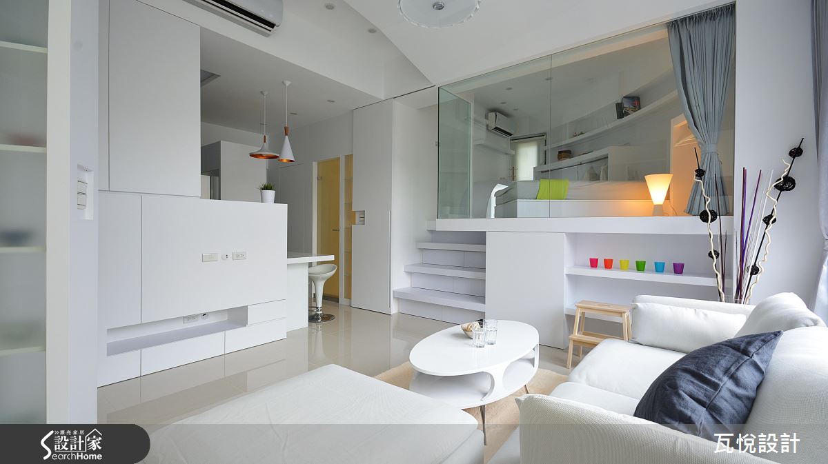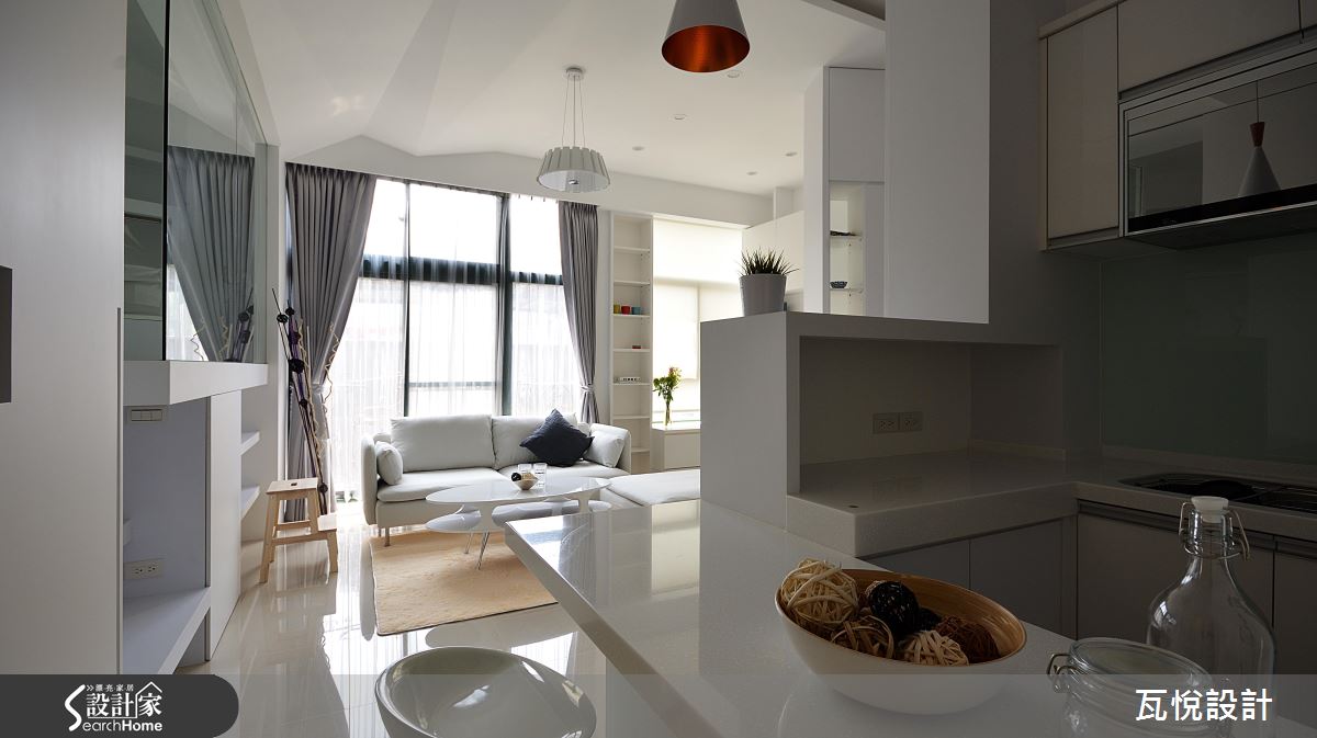 設計師首要改善採光問題,拆除原先玄關的多餘隔間,更換為具有收納機能的櫃體;更出乎意料地以大面積玻璃取代女兒房實牆,善用邊間優勢,援引落地窗的充裕光線至開放式客廳與餐廚。針對動線規劃,設計師變更客廳格局、 90 度翻轉沙發坐向,結合女兒房與書房空間,成功擴大視覺感受、梳絡流暢動線。設計師更利用複合式機能整併居家空間用度,例如將大量收納機能置於墊高的女兒房樓梯下、收納櫃結合屏隔用途、 L 型廚房結合吧台機能等,讓動線更加俐落。主臥延續純白色調與前衛的金屬光澤,打造清爽明亮的睡眠空間。