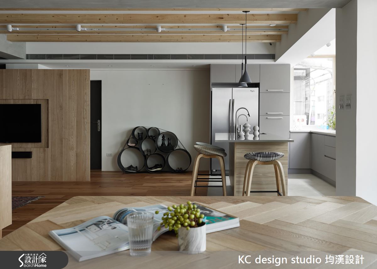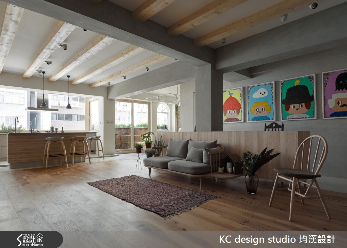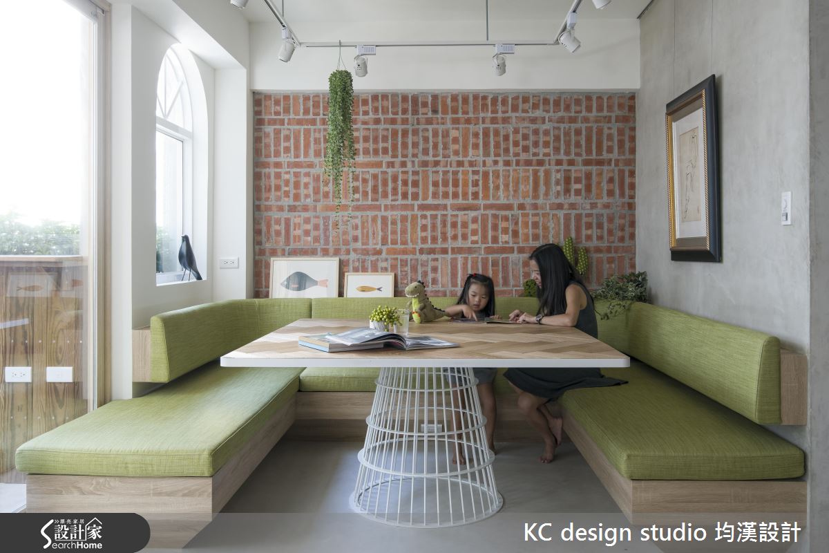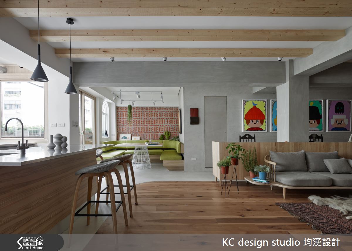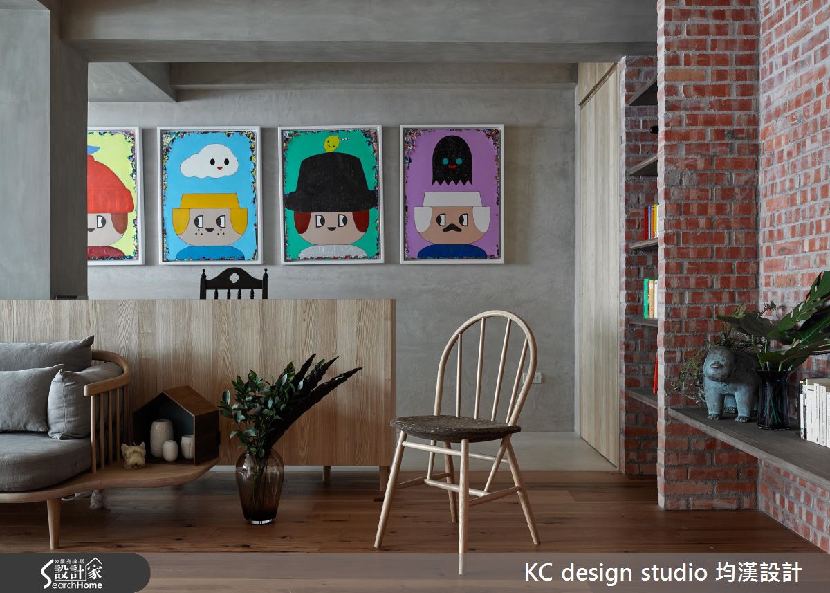 由於地處都市鬧區,有著狹隘的居住環境與噪音問題,因此屋主希望再回到家還能擁有閒適、紓壓的鄉村風情。設計師取材自德國田園美麗的自然風景,利用實木樑與粗獷紅磚將相似的氛圍注入居家空間。開放式空間保留原始樑柱,並以水泥粉光呈現不造作的現代氣息,更抹除牆面隔閡,讓餐廚空間、客廳與書房的動線流暢、視野寬闊。更納入歐式生活習性,為一家人在臨窗處設置專屬的ㄇ字起居空間,形成特殊的 3 廳格局。居家空間中可見大量木元素、紅磚與翠綠植栽,搭配色彩繽紛、充滿童心的單品與畫作,儼然就是都市裡的德國小木屋。