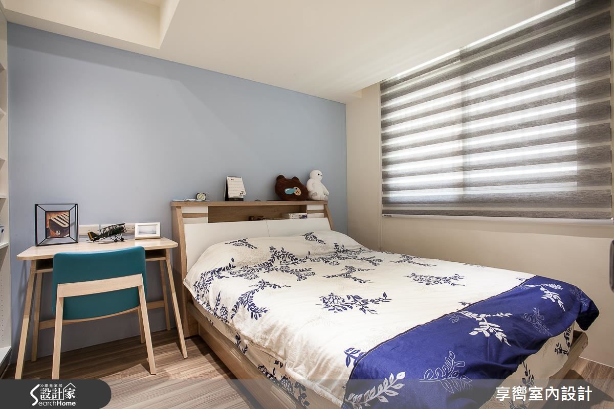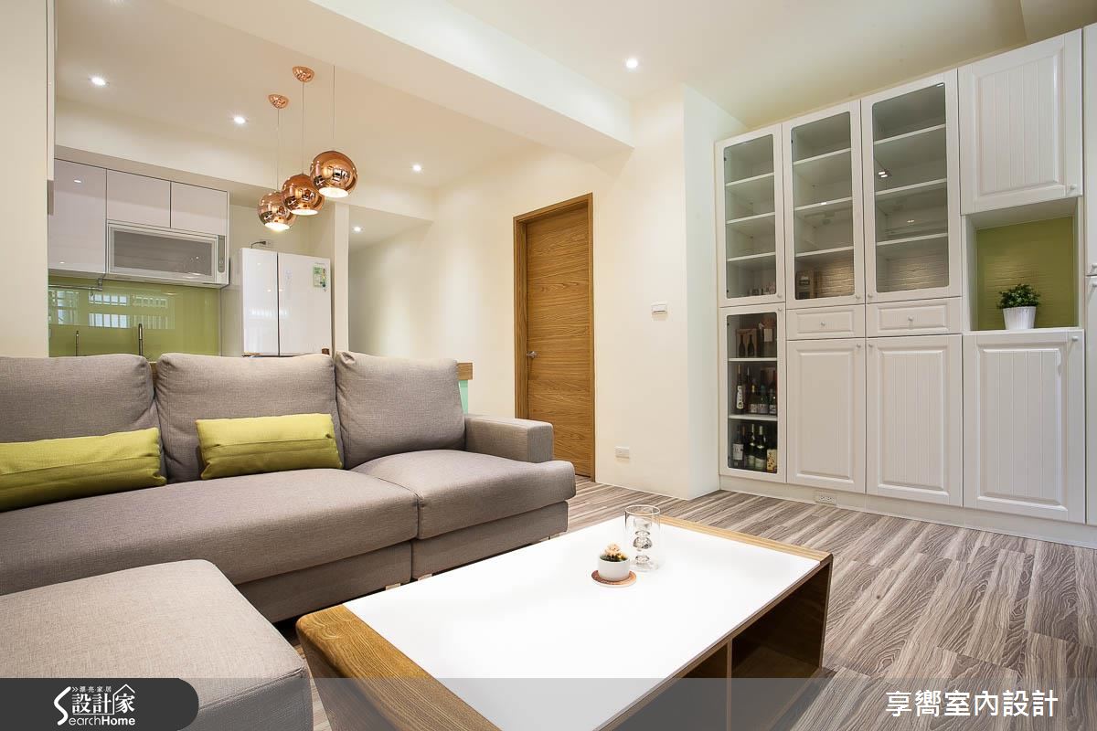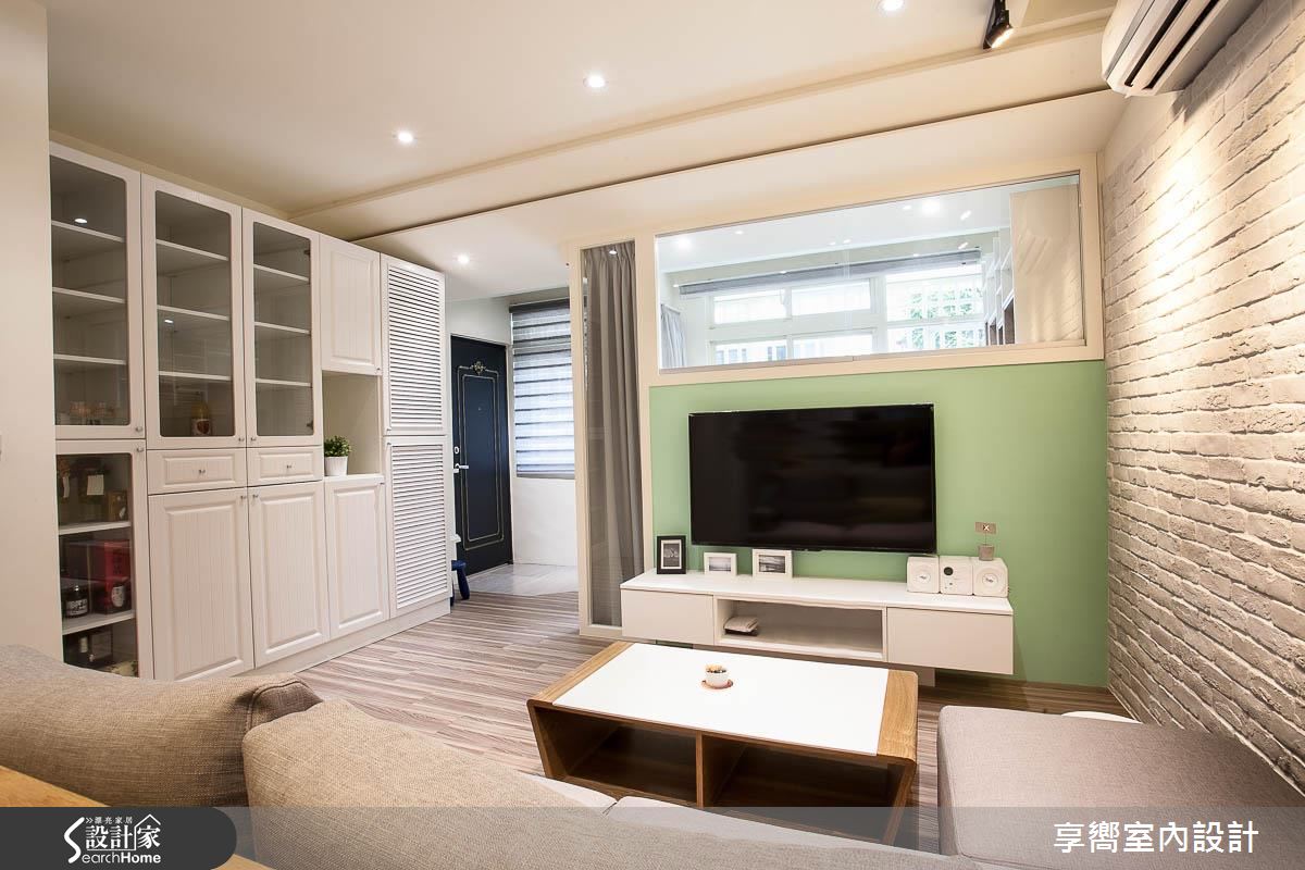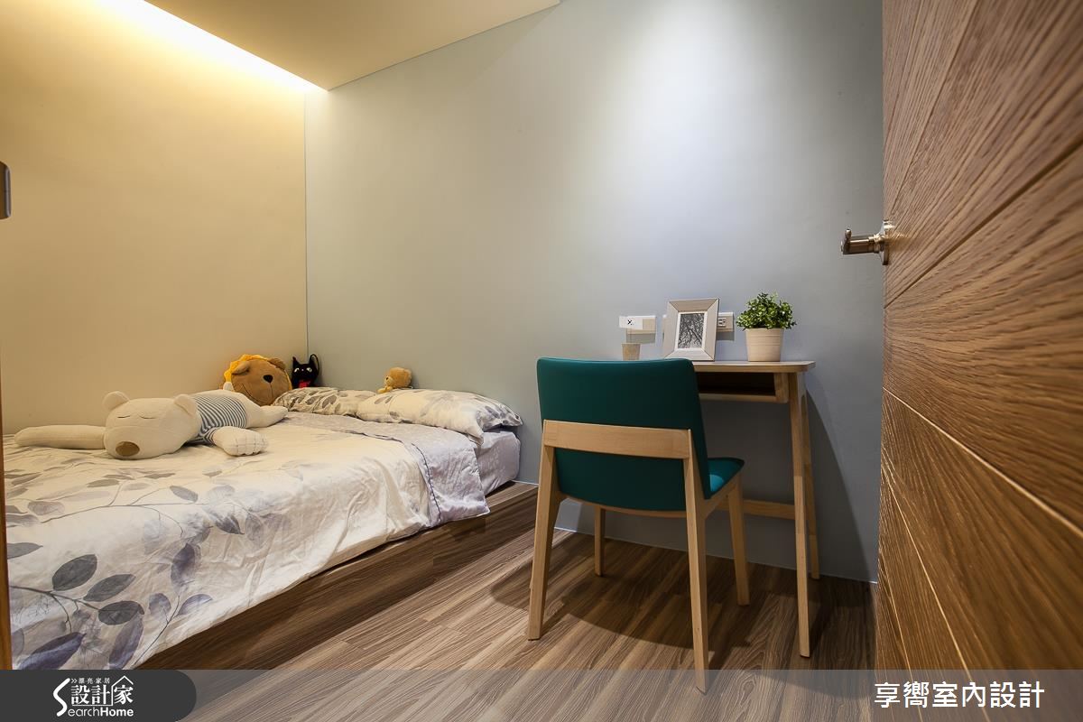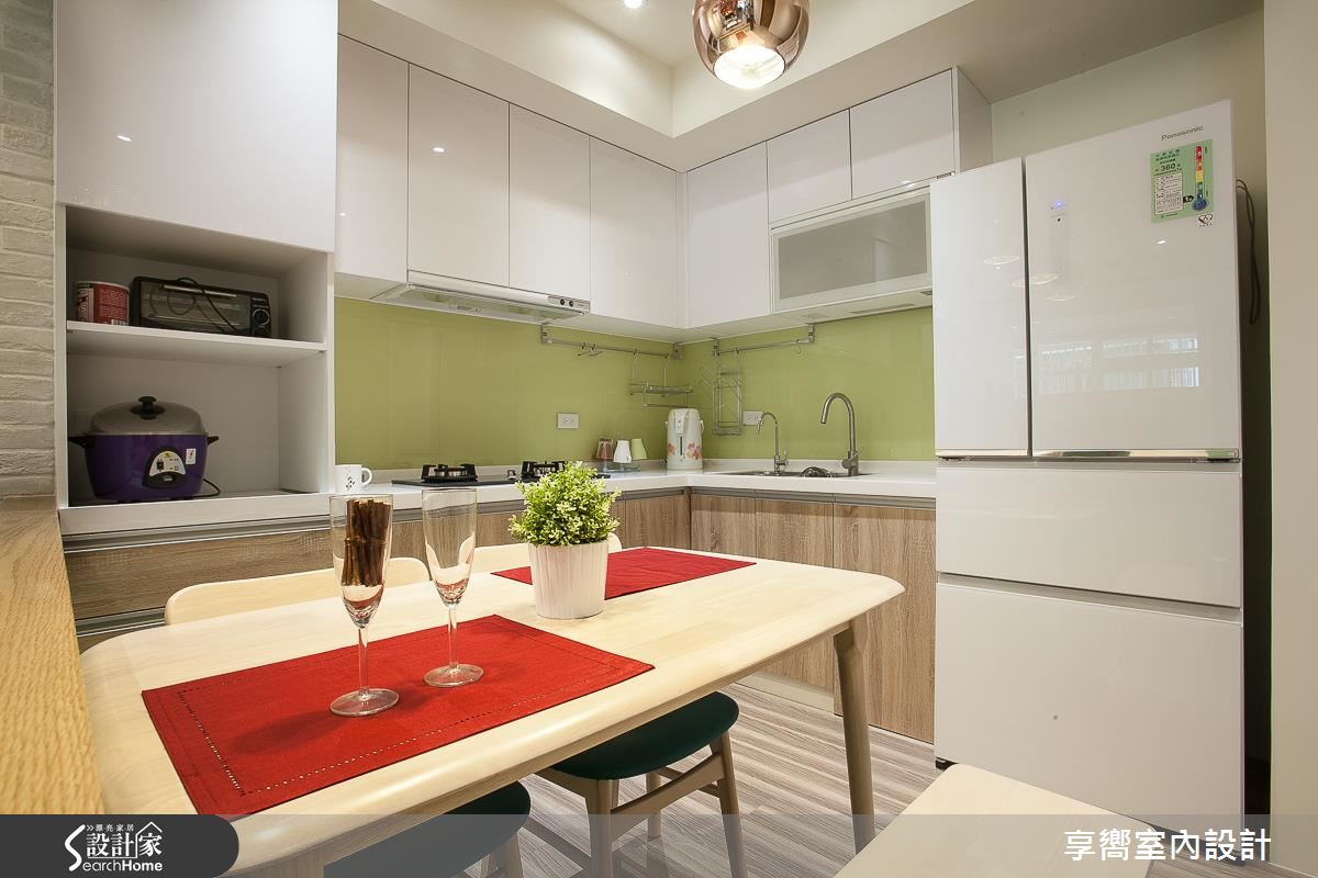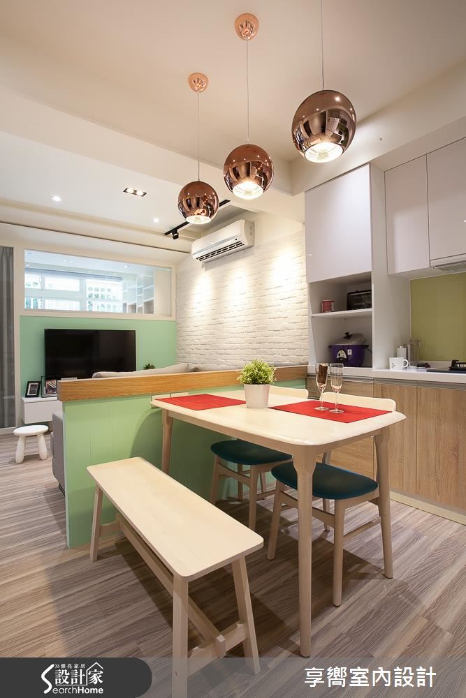 公領域內,設計師刻意將客餐廳整併於左側,保留通暢的廊道軸線,一旁則配置整排白色百葉櫃體,在收整立面線條的同時,亦挹注強大收納機能,同時在電視牆上方拼接清玻材質,讓廳區、多功能起居室可共享採光,牆面色調則採淺綠色定調,搭襯手感十足的文化石牆面,輔以家具輕簡陳設,型塑自然無壓的生活視野;餐廳、客廳之間規劃矮牆、予以簡單的場域區劃,並做出清爽的廚房基調,以烤漆玻璃延續綠色主軸,搭配溫潤的木質肌理,成就小而溫馨的聚餐領域;兩間寢臥依循不同居者需求、給予不同主牆色調,搭襯木地坪的鋪設,營造休閒紓壓氛圍,而活動式的書桌椅設計,不僅合乎了輕盈的整體調性,更創造未來使用上的彈性可能!