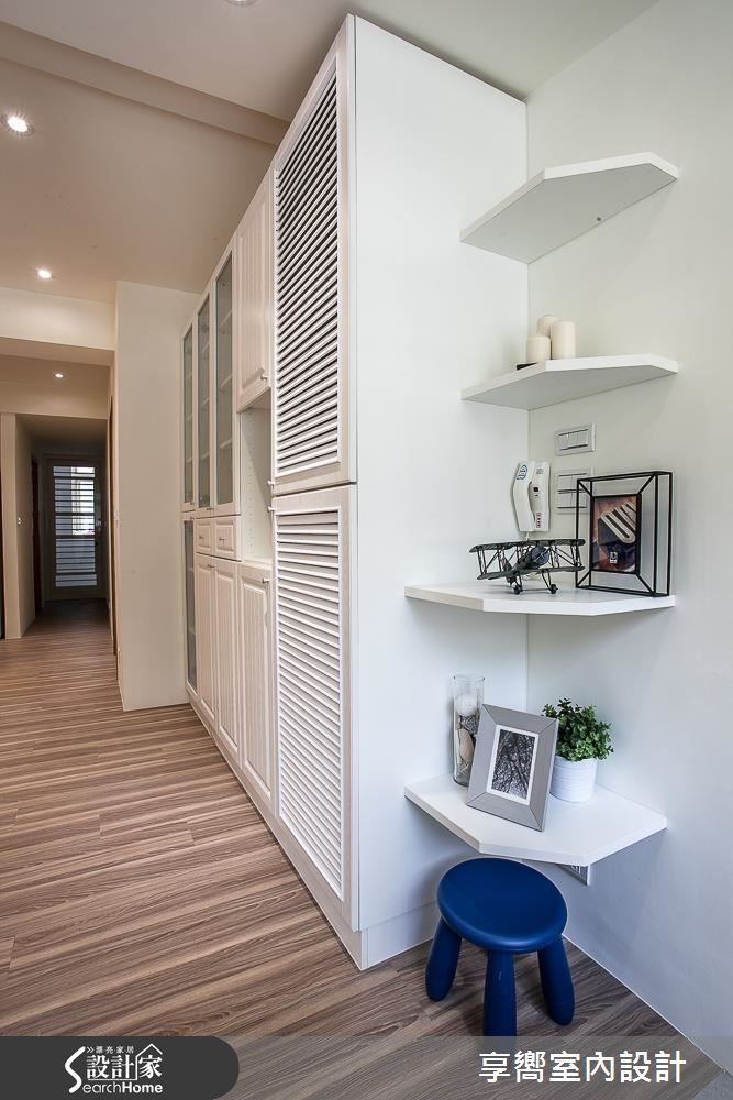 為了美化突兀的直角轉折,設計師在櫃體、壁面之間規劃層板,將之轉化為開放展示櫃,瞬間營造入門後的視覺亮點!
