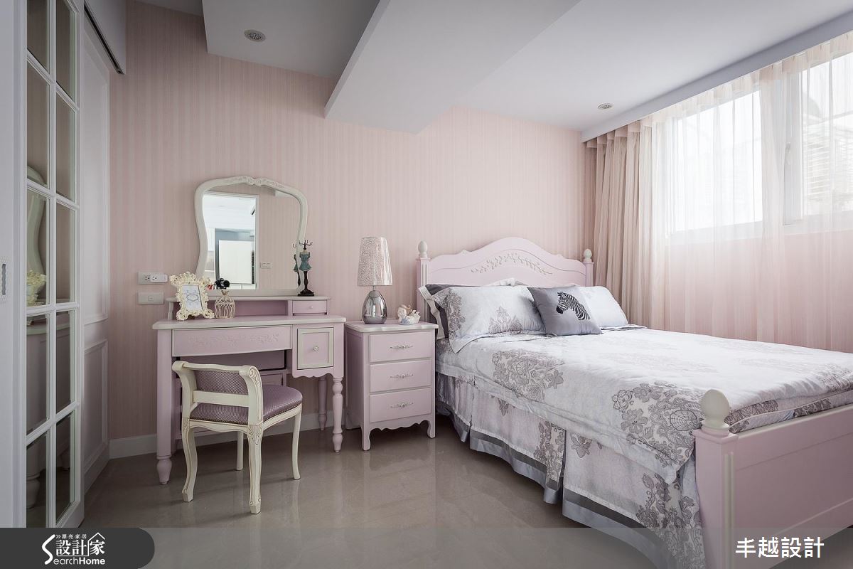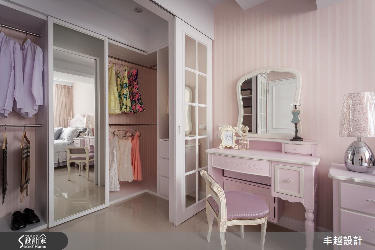 次臥房融入粉紅色系營造甜美氛圍,一旁則以鏡面格子門區劃更衣間、做出完好場域分屬,一次滿足唯美風格與實用機能!