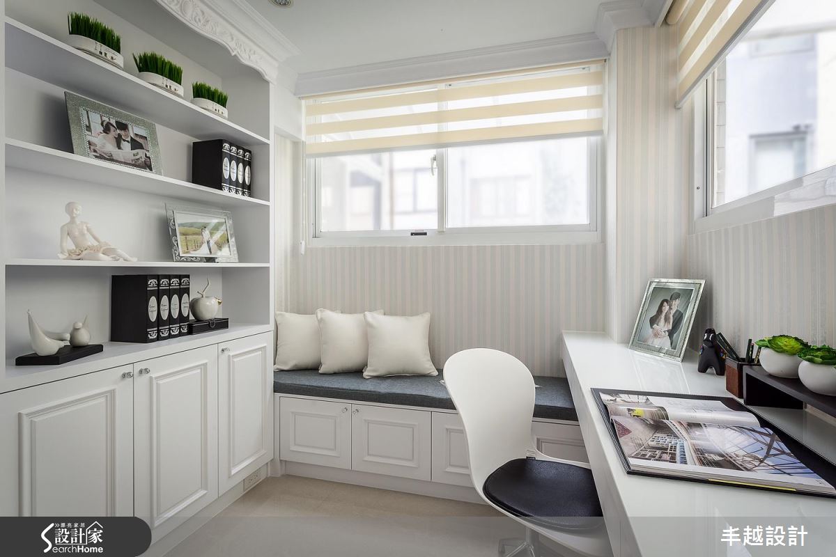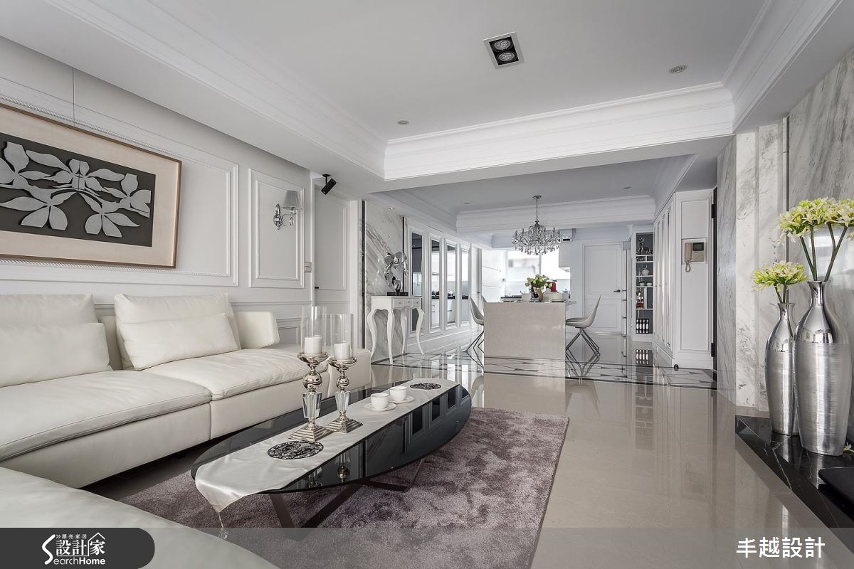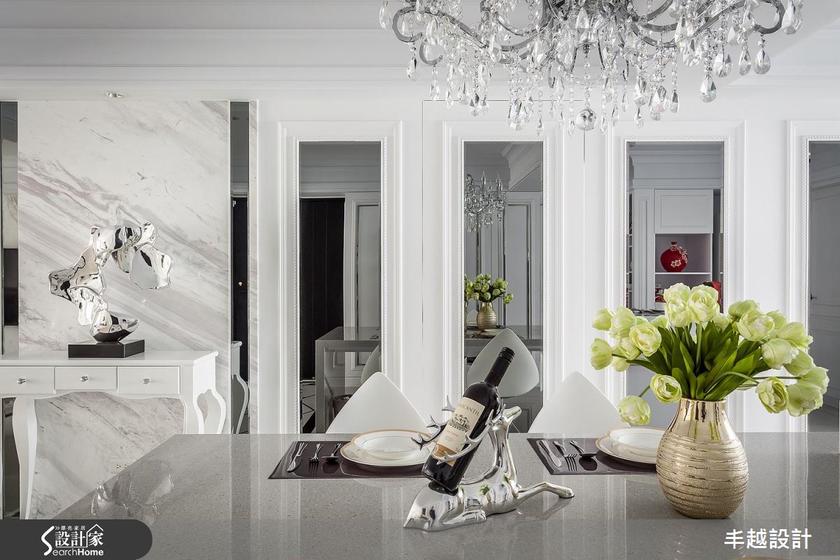 公領域內,設計師挹注開放式設計,將客、餐廳串聯一體,地坪中段則鋪陳拼花大理石呼應上方天花樑柱、形成二者領域界定,靠牆處則搭襯櫃體陳設藝術品,讓此端景構成入門後的唯美印象;全室選用白色底調,搭配銀狐大理石電視主牆、及細緻線板的勾勒,藉由地毯與抱枕點綴浪漫紫色,在清爽之中不乏華麗質感;餐區則將收納機能整合於牆,立面不時穿插深色鏡面,搭上中島與開放廚房配置,注入寧靜舒適、互動極佳的用餐氣氛;書房延續白色主軸,除了書桌與展示收納櫃外,亦規劃窗邊休憩臥榻,增添空間機能性;主臥給予清新柔雅的底調,於櫃面飾以不鏽鋼線性,佐以繃布拉扣床頭、古典壁燈、線板裝飾等,使空間洋溢著令人陶醉的法式情懷!