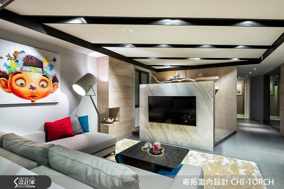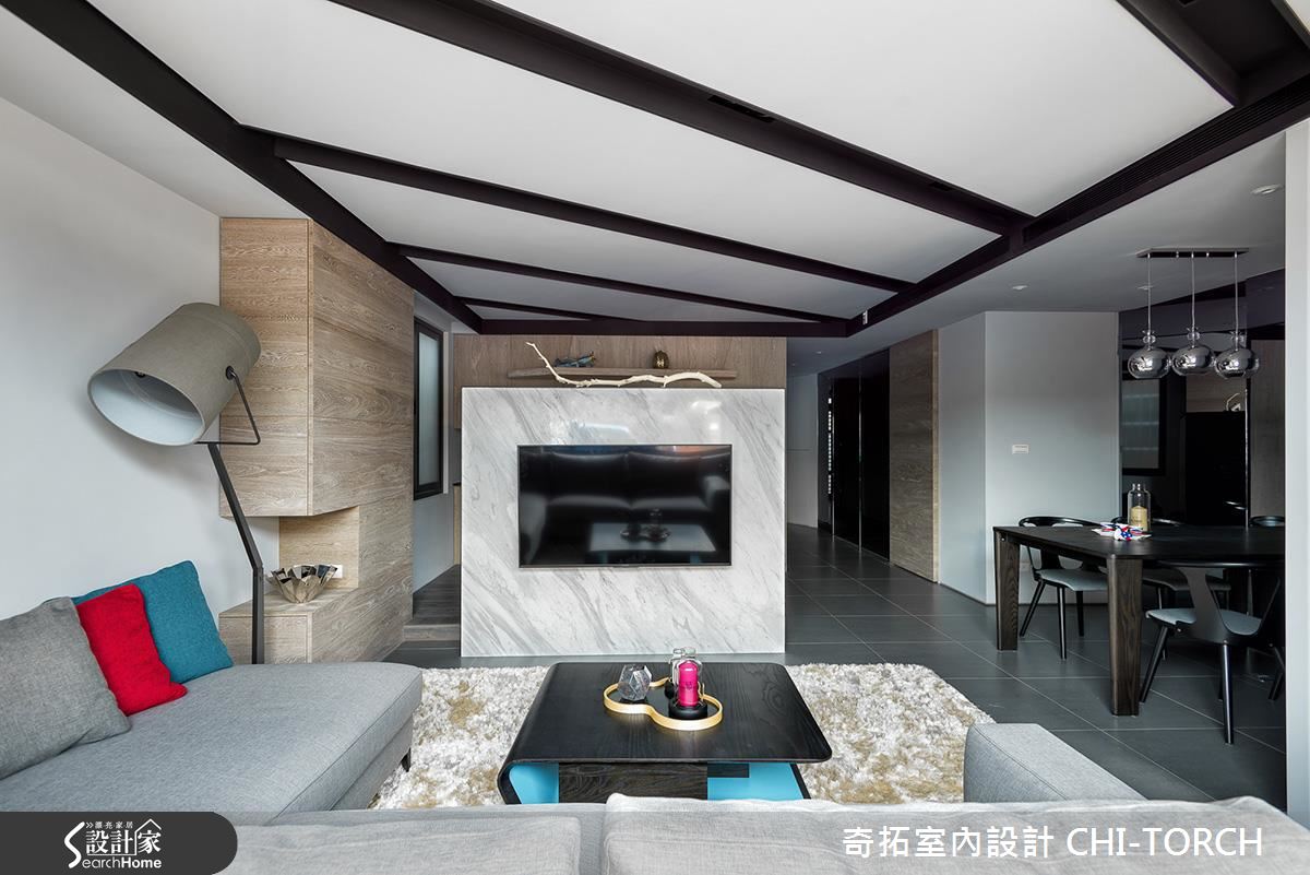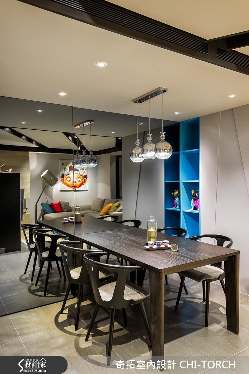 除了自然採光之外,設計師也利用隱於鏤空天花的投射照明與鏡面材質創造明亮大方視覺感受,帶給一家人最清新的感受!