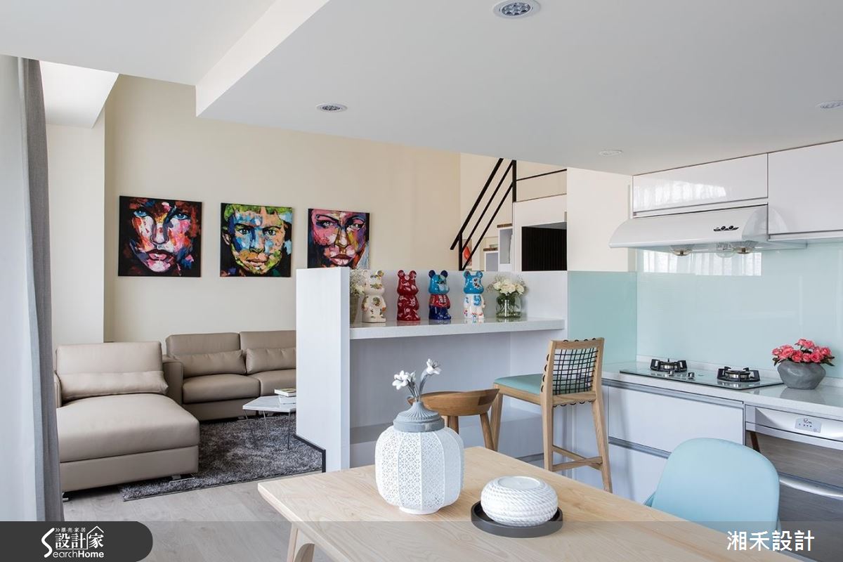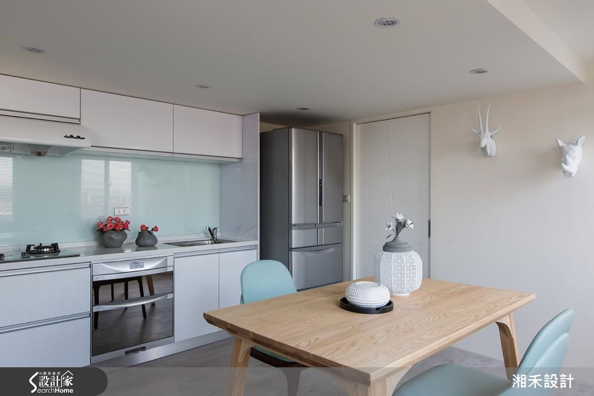 造型俐落的電視牆具有多重功能性,不只可以做為空間分野和儲物收納,來到電視牆的另一面,便成為餐廚區的吧檯區塊,讓用餐時光也能擁有浪漫情調。