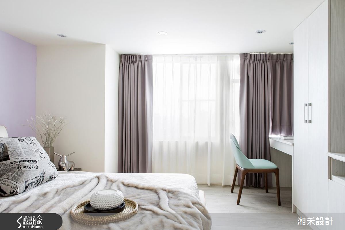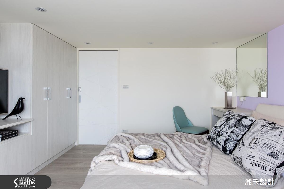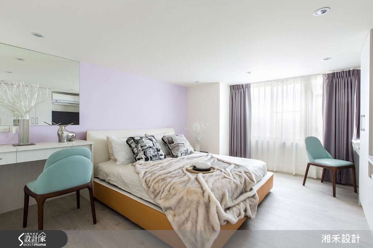 室內以樓梯連結上下樓層,並巧妙劃分出玄關和公領域分野,一樓作為客廳及餐廚用途,透過大面積的窗景採光,迎入明亮氛圍,客廳電視牆則不做滿,保留開放空間感,讓兩個領域可以共享日光和流暢生活動線,一家人的公共視野也變得更加遼闊放大。另外,梯下空間也不浪費,打造為展示收納區塊,可以擺上屋主的書籍或收藏品,轉化為日常生活中的趣致端景。沿著梯階走上二樓,私領域空間同樣延續淨白色調,並依據不同居住者個性,挹注豐沛機能及收納,牆面繪上恬靜柔和的色彩,更顯溫和舒適。