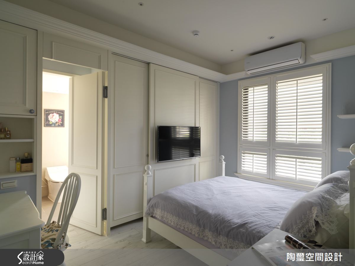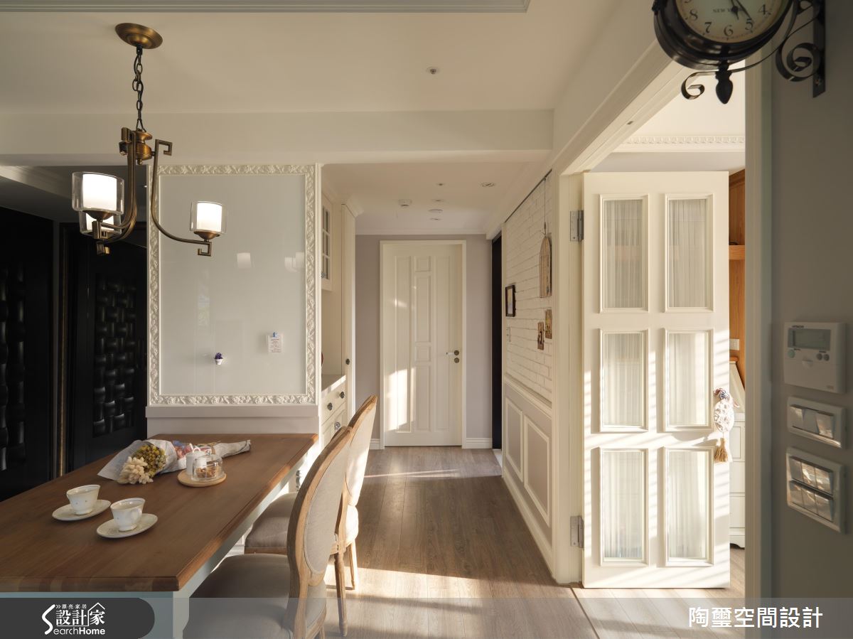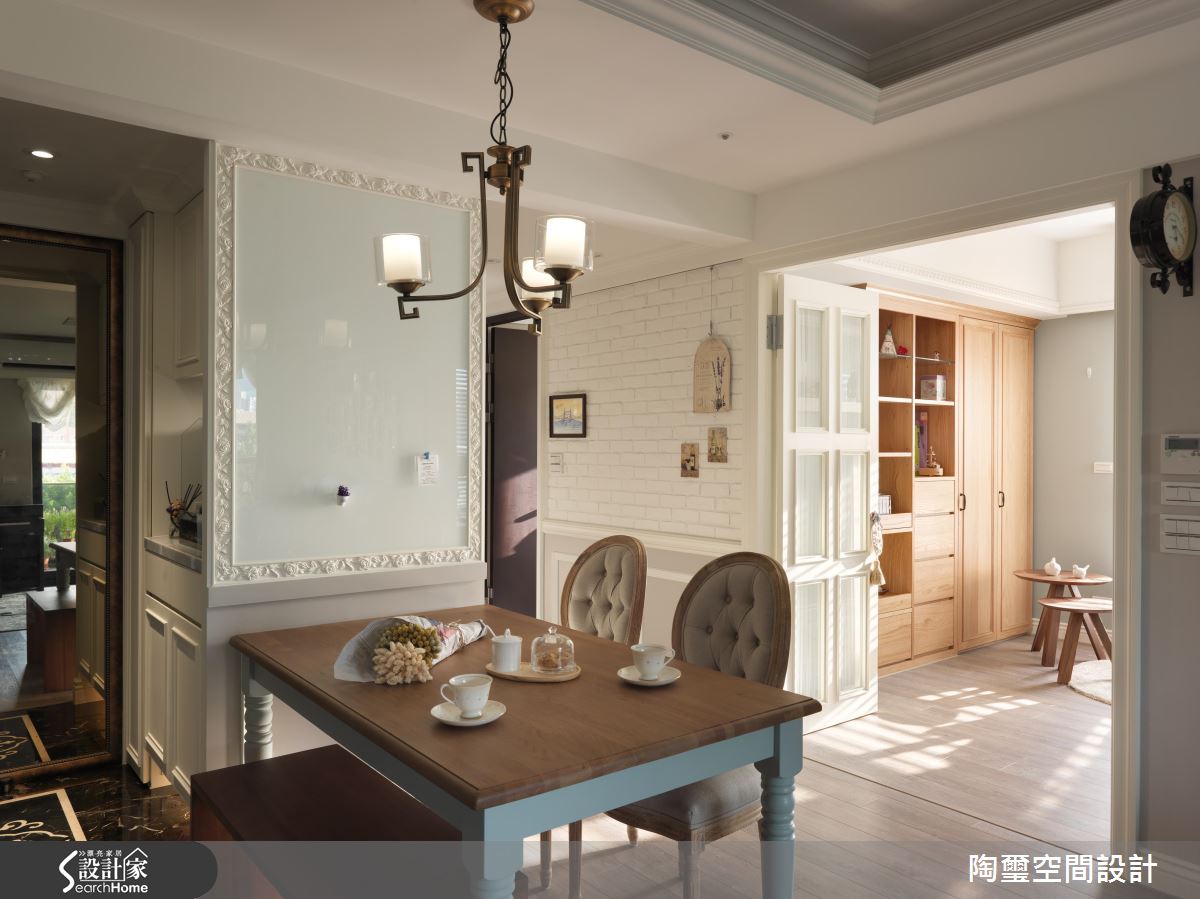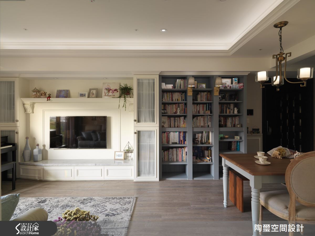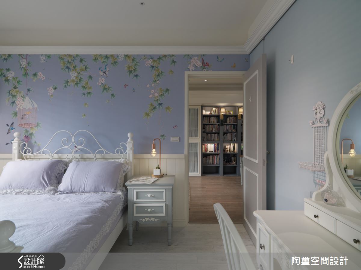 新成屋的屋況條件極佳,唯獨原有書房格局讓採光有所限制,設計師拆除隔間牆後,令室內中段也得以享有舒適光感,而略為幽暗的玄關處則設置鏡面,承接公領域的明亮光度,並具放大空間的視覺效果,再搭配拼花大理石地板,營造出低調而奢華的入門氣場。另外,喜歡英式古典風格的屋主,平時擁有豐富的藏書,公共空間利用線板搭配歐式家具,框畫出典雅的異國氣質。客廳電視牆採用半壁爐式設計,旁邊也規劃一道灰藍色落地書櫃,完美達成風格與實用機能需求,而餐桌旁則安排一道附有白膜玻璃的雙面櫃,可以進行收納,也兼具界定空間、生活備忘錄等多重用途。進入主臥室,以薰衣草色和花草語彙渲染浪漫的睡眠氛圍,純白線板門片則隱去盥洗區及衣櫃收納的存在感,讓整體風格更具一致性。