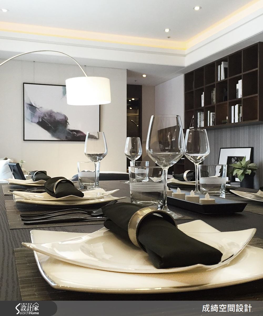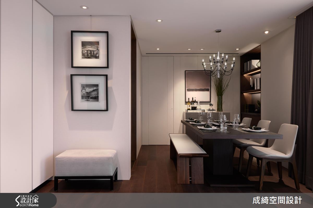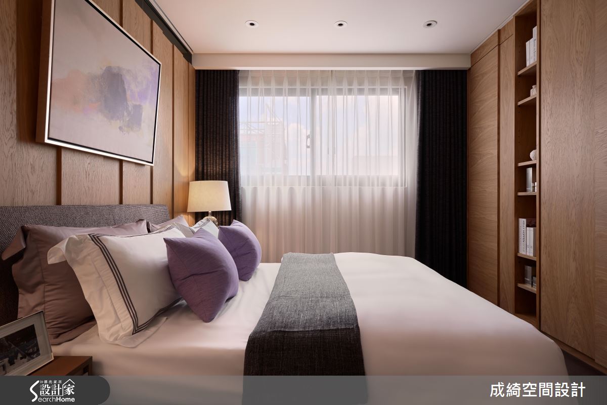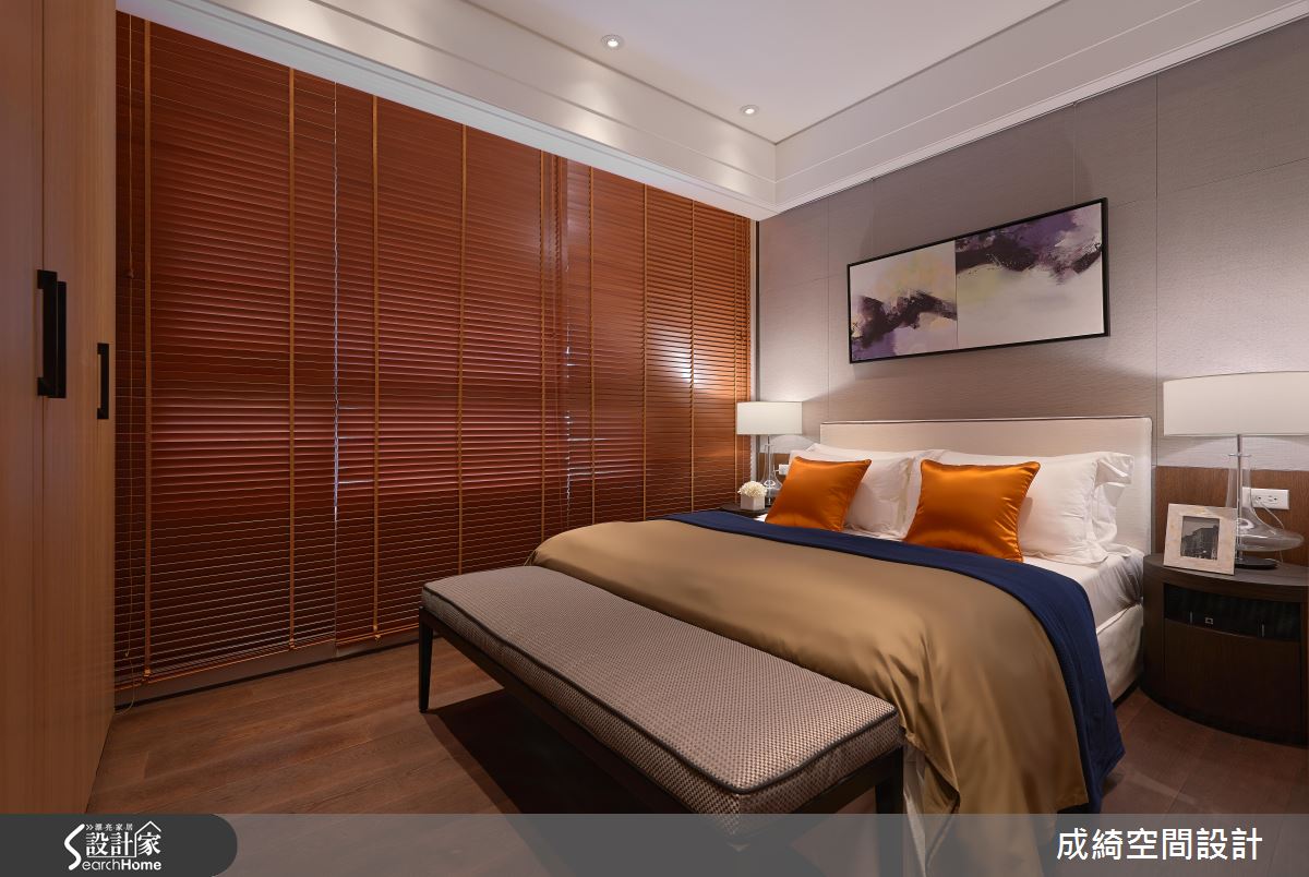 客廳,給予溫暖的灰色沙發安排,搭配立燈造型、家飾品妝點,在木皮與壁紙的相得益彰下,型塑宜人的生活場景,並捨棄一般電視牆規劃,於牆面配置工整的木作櫃體、陳列藝品書籍擺設,建構充滿人文感的牆面表情;餐廳採深色木紋鋪述地坪,提供舒適溫馨的用餐場合,透過牆面的藝術畫作點綴,勾勒出獨到的居家美學品味;主臥導入明亮採光,以大面積紮實木作鋪陳壁面,注入恬適的寢居質感, 並在櫃體中穿插開放的格櫃設計,豐富量體的變化性;次臥則作出整面木質百葉,構築寧靜的禪風底蘊,再加入被單、抱枕融入跳色亮點,帶出年輕的氛圍!
