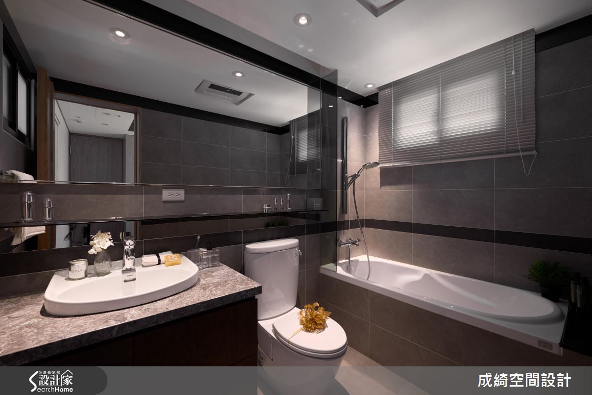 衛浴引用天然石材、磚材提升視覺質感,並別出心裁地於牆面中段嵌上鏡面腰帶,讓空間多了幾分精緻氣質!