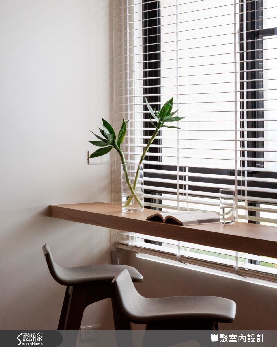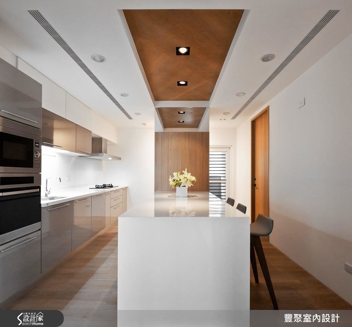 為了讓親友們能夠自在的於空間中走動,豐聚設計以「雙動線」為空間主要訴求。開放的公共空間為多功能型態,沙發區、木長桌區或是窗邊的高腳椅區,都能依照心情或需求隨心而坐。中島廚房也可作為宴請友人的餐廳區,鏡面設計巧妙延伸視覺高度,在簡而俐落的線條勾勒下,創造出開闊且視野通透的流暢動線。