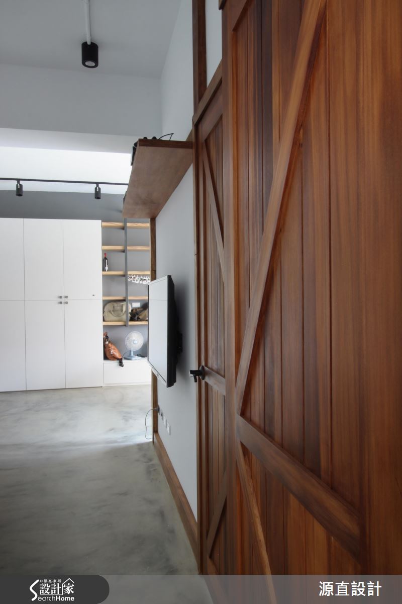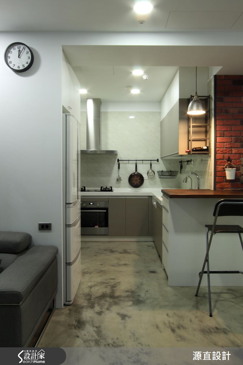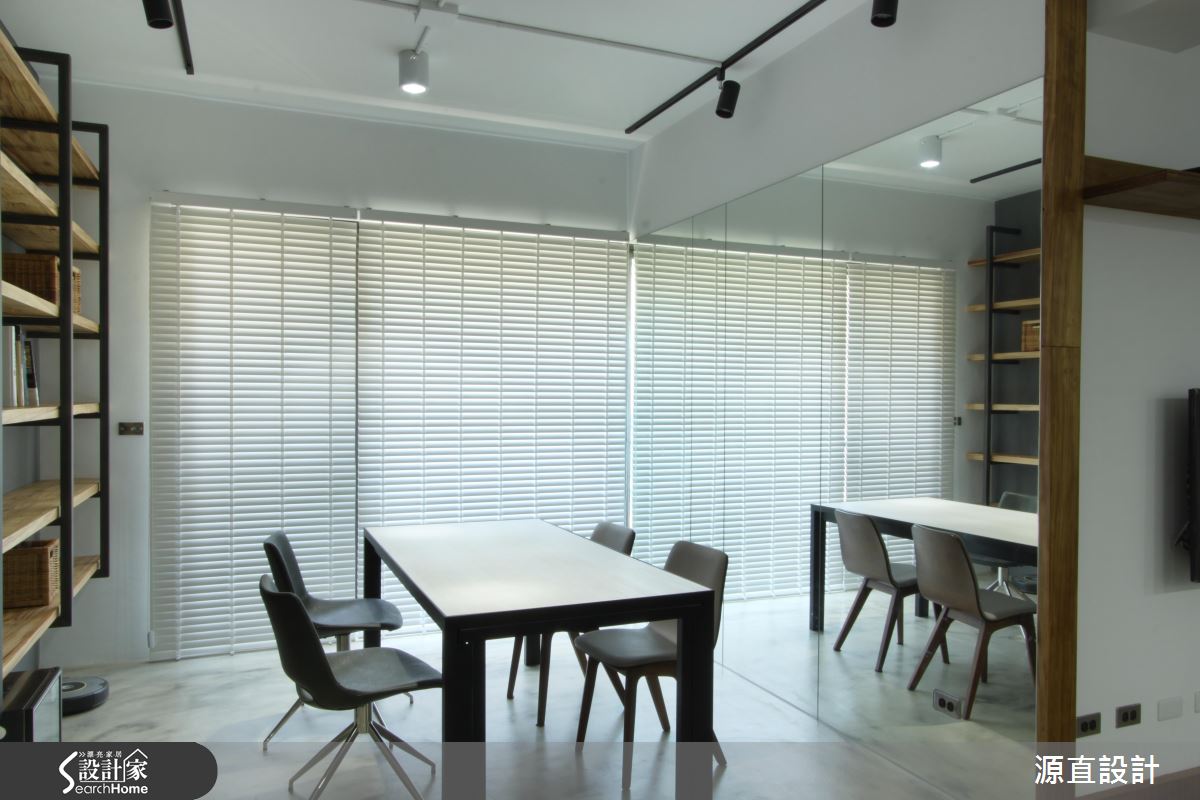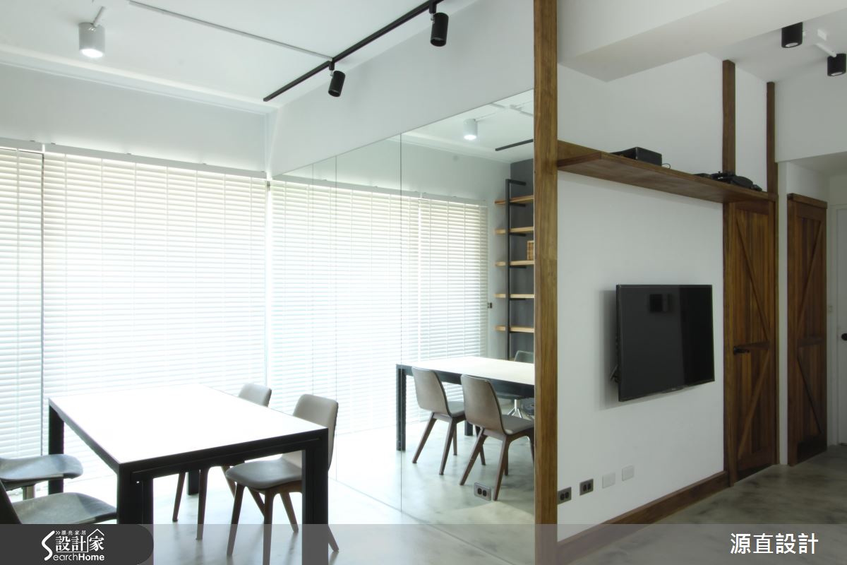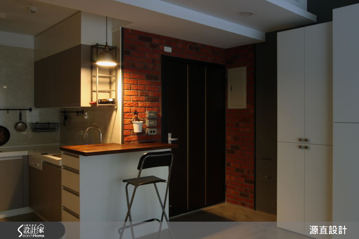 大門處,設計師以紅磚鋪陳牆面,帶入復古時髦的生活氛圍,一旁則解放廚房空間,並連結小巧吧檯、搭配燈光照映,把用餐區塑造得有如小酒館般富有情調;全室地坪採水泥鋪平,保留大面積留白,創造敞朗開闊的視感,立面鋪排整道櫃體,以白色量體結合木作鐵件層架,將公領域範疇一路串聯至書房,電視牆則給予清爽表情,以木作為框、白色為底,旁側連接穀倉木門語彙,表述自然樸實的 Loft 感受,而書房內不僅網羅閱讀機能,更多了會議工作室的主題使用,且運用大片鏡面設計,營造場域雙倍延伸的效果;私領域內則鋪陳溫潤的木地板,挹注紓壓氣氛,並保留最彈性的簡約情境,將空間主軸還給日後陳列的軟件家具!