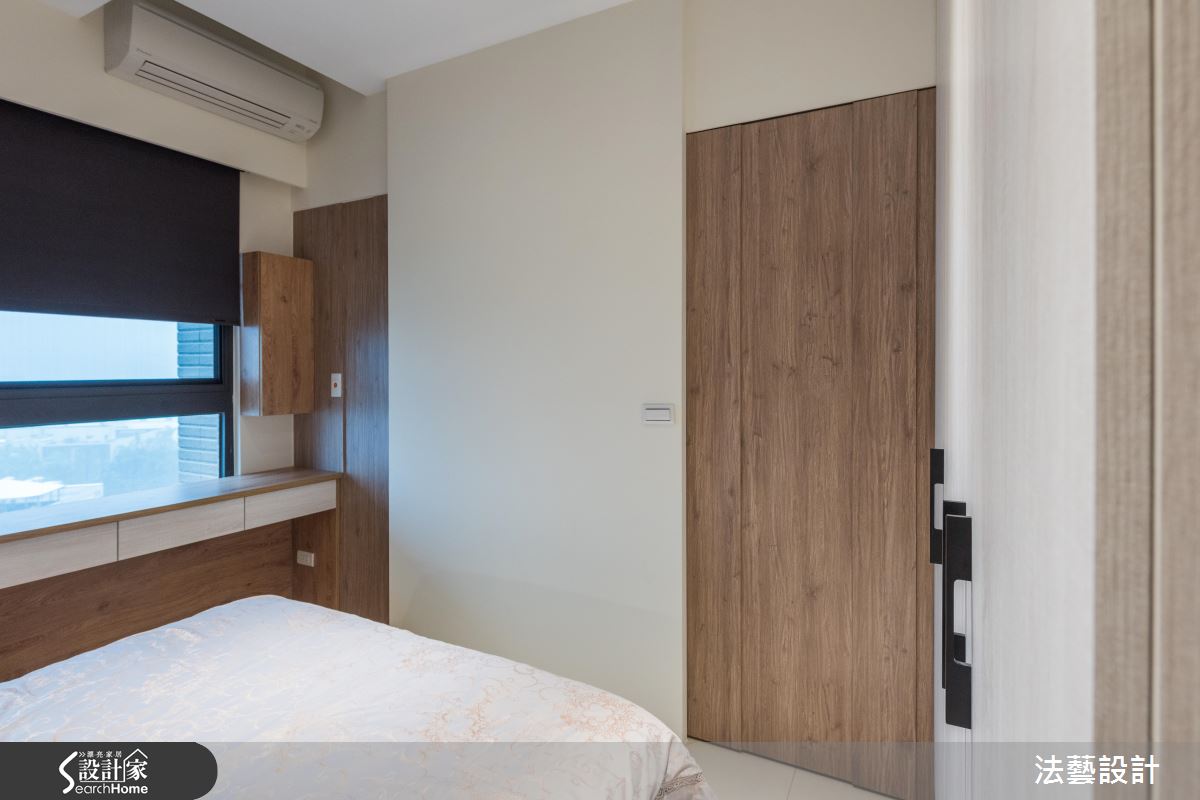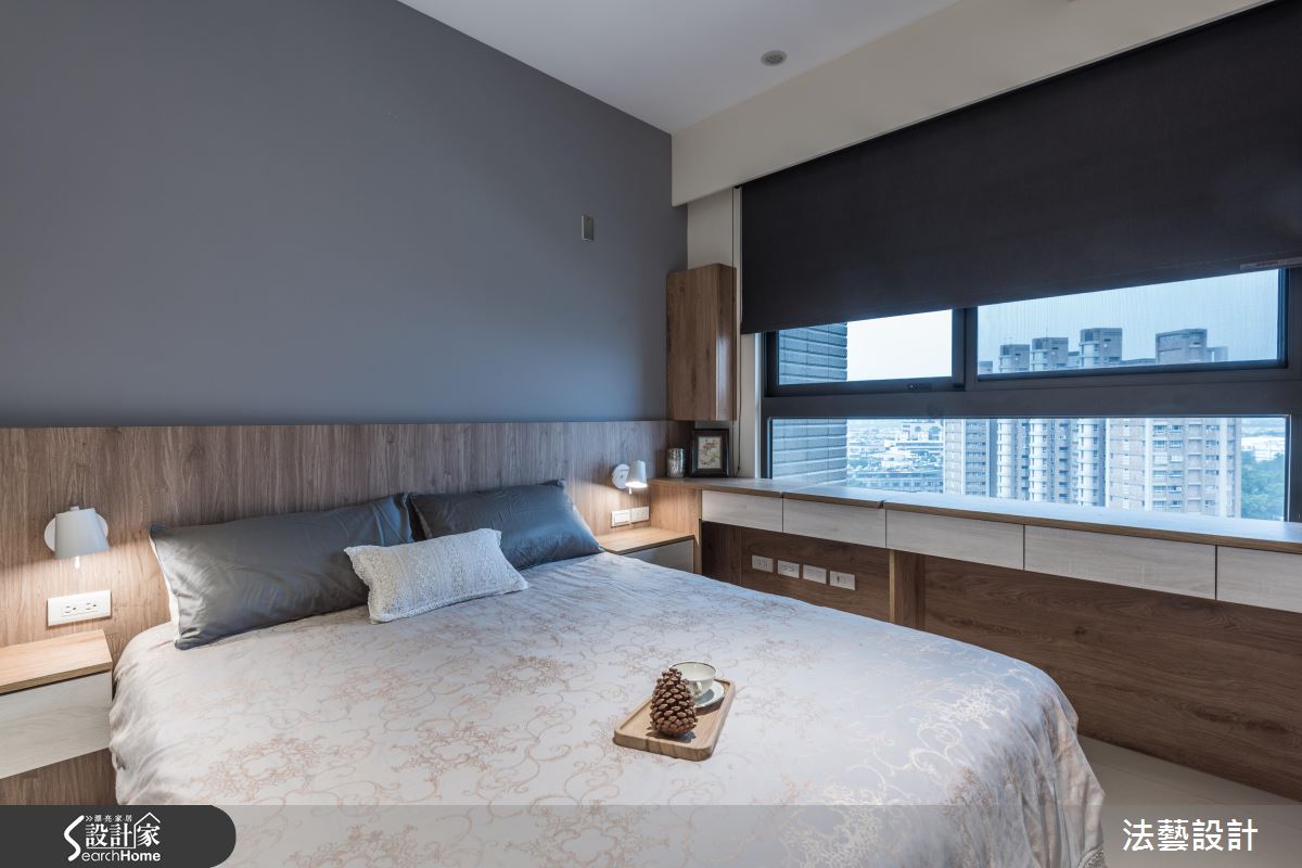 主臥於床頭揮灑優雅色彩,並收整櫃體、門片線條,以木質紋理串聯整體,帶來舒緩療癒的放鬆感!