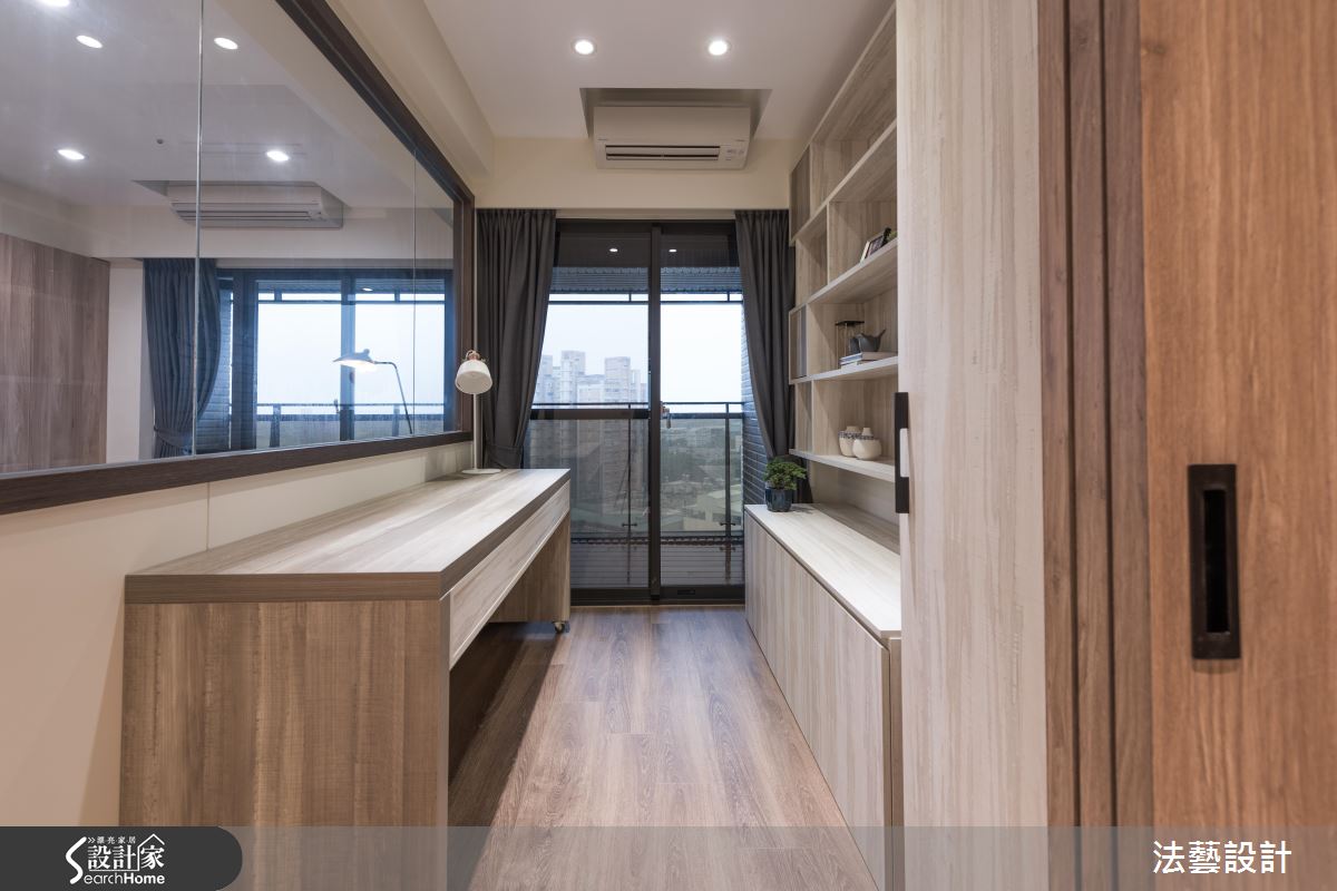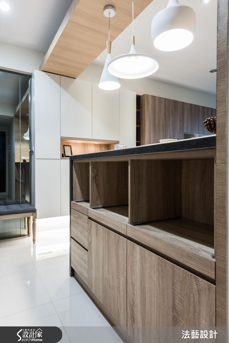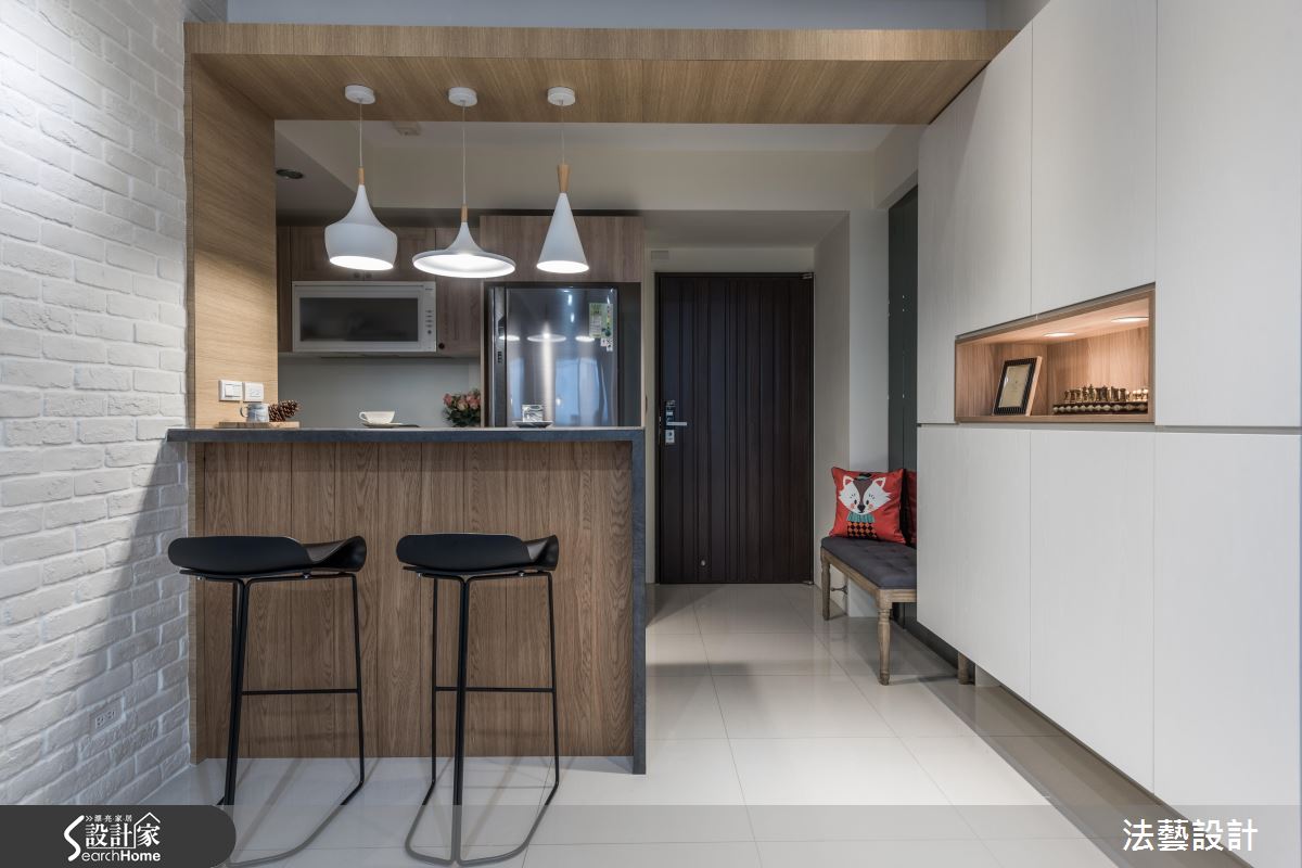 居宅掌握木質的溫潤特性,藉由溫煦色調搭配、避免繁雜凌亂的感受,且精算量體比例,將入門鞋櫃、電視櫃做出整合,塑造舒適自然的立面表情,並配置畫作取代電視聚焦視覺,同時保留電視管線,因應未來的彈性調整,廳區一旁在採光最佳處安置一張單人座沙發,搭配立燈照映,醞釀優雅的人文氣息;書房則採大片玻璃建構隔間,型塑一覽無遺的視野,並延續木質素材挹注樸實穩重感,書桌則設計成滾輪活動式,可將桌體挪動,與書櫃完全緊密貼合,讓出作為客房使用時的寬闊場域;餐桌改為吧檯形式,讓量體身兼收納機能,達到雙重機能滿足,並以文化石鋪述牆面,加入木作板材延伸,搭佐三盞造型主燈,使空間散發出獨到美學品味!