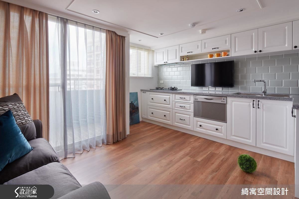 在評估業主生活習慣後,方能規劃出適切的生活動線距離,也是複合空間成功的要素!經過精準的距離計算,讓爐灶、電視、水台三者在同一直線上各司其職,不讓爐口熱度、水槽用水影響電器機具,就能運用有限空間,讓原本僅 150 公分寬的一字型廚房進化為機能性更強大的 L 型廚房,打造業主的夢幻廚房。