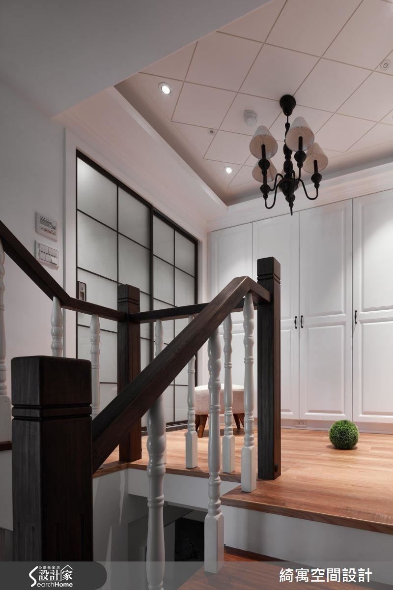 自玄關、沙發背牆延伸至臥室的文化石,在此著重於材質的延續並刻意點出挑高之美,除此之外,綺寓設計經營風格意象,像美式線板、文化石、實木扶手、實木踏階、罩吊燈、格狀天花板等美式經典元素在適當比例調配下皆不缺席,並因地制宜刪除踢角板與腰線以維持空間完整不切割,細膩的風格刻畫讓本案質感倍增,處處展演美式風華!