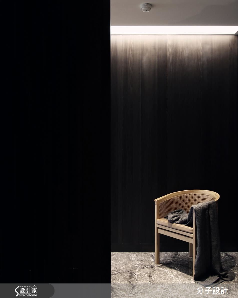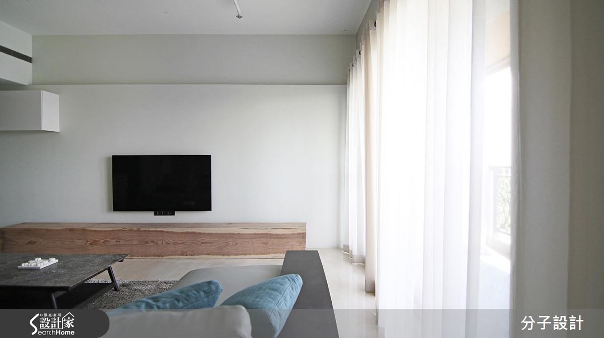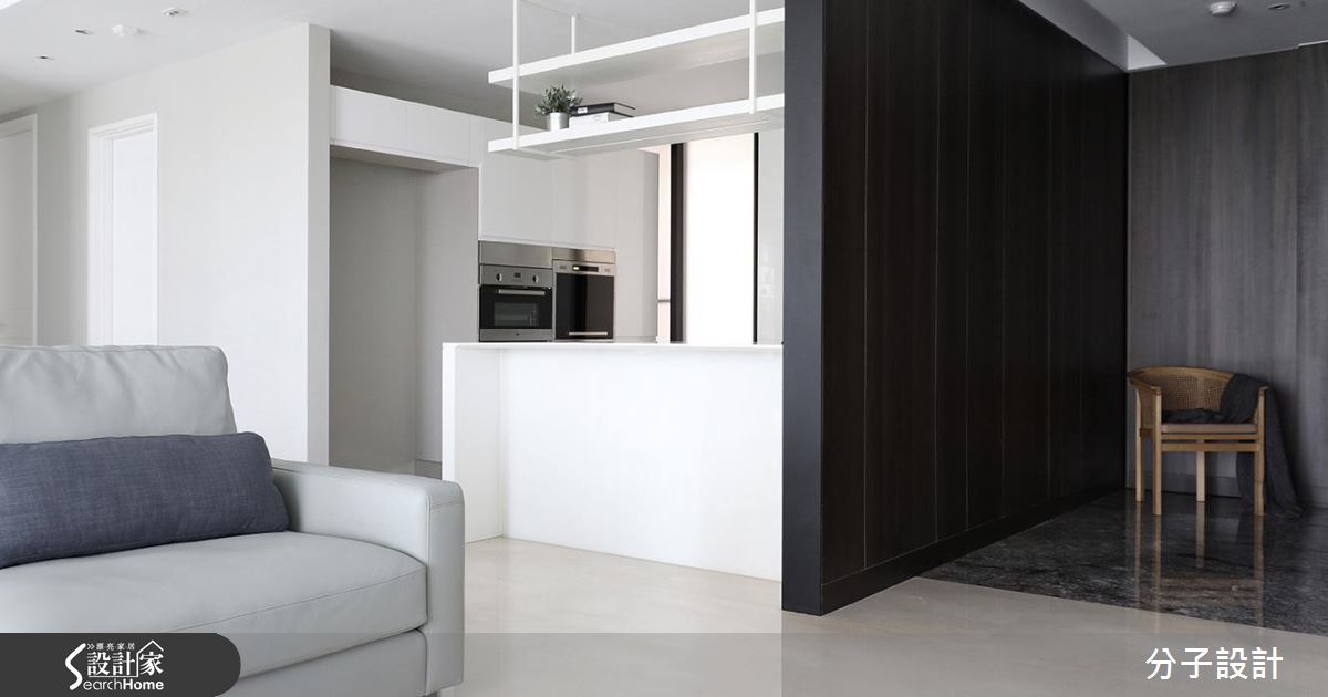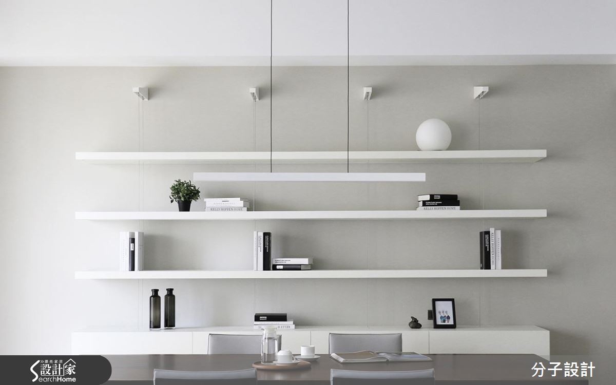 入門處透過地坪材質差異,界定玄關、廳區領域,並陳列一張藤編單椅,型塑撫慰人心的寧靜畫面;公領域給予開放規劃,並簡化天花板照明形式,加入自然質樸的選材用色,在素雅簡白之中,巧妙揉入色彩變化、展現輕質視感,且安排木餐桌呼應客廳的實木皮電視櫃,以木紋肌理添入生動氣息,餐桌旁牆面則配置鋼索懸吊開放式層架,挹注收納展示機能,廚房也作出懸吊式層架、滿足收納所需,破除量體厚重表現,維持整體的曼妙輕盈;臥房藉由淺色壁紙鋪述靜謐感,並透過燈光變化,營造沉靜或明亮等不同氛圍,使生活情境豐富而多變!