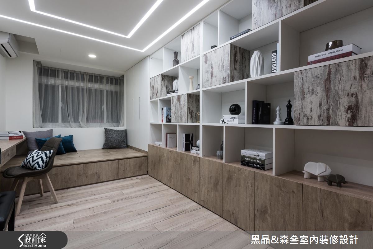設計師以開放式手法規劃公共空間,展現開闊的整體印象,在玄關、廳區之間配置清玻鐵件隔間,延伸公領域視野,使迎入的自然光得以均勻分布,並在簡約基底之中以豆沙色揮灑沙發牆,創造極具暖意的畫面;廚房做出格柵界定與餐區之間的範圍,且融入白巧克力磚、搭配一致的木紋廚具安排,構築清爽的料理場域;原先小而昏暗的書房,則將舊有隔間拆除、改為玻璃拉門,使光線可任意穿透,書房內加入了不同的木皮紋理,彰顯櫃體多變層次,一旁架高地坪打造窗邊臥榻,挹注更為豐富的使用主題,並在天花板嵌入 LED 燈帶框架,瞬間提亮整個空間;寢臥注入中性但富有暖度的色調,透過一幅簡約畫作隨意擺放、聚焦視線,呈現不受拘束的生活本質!