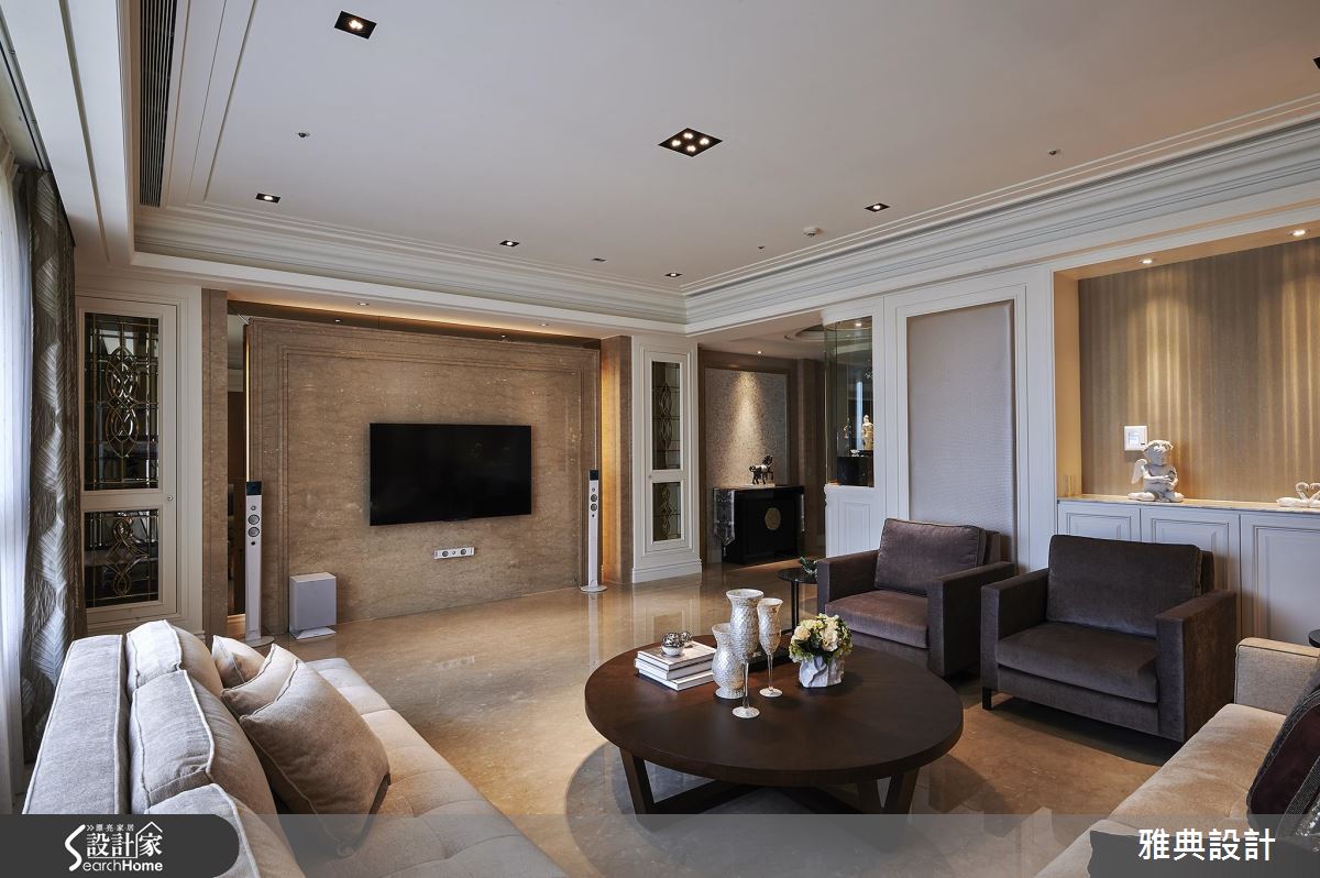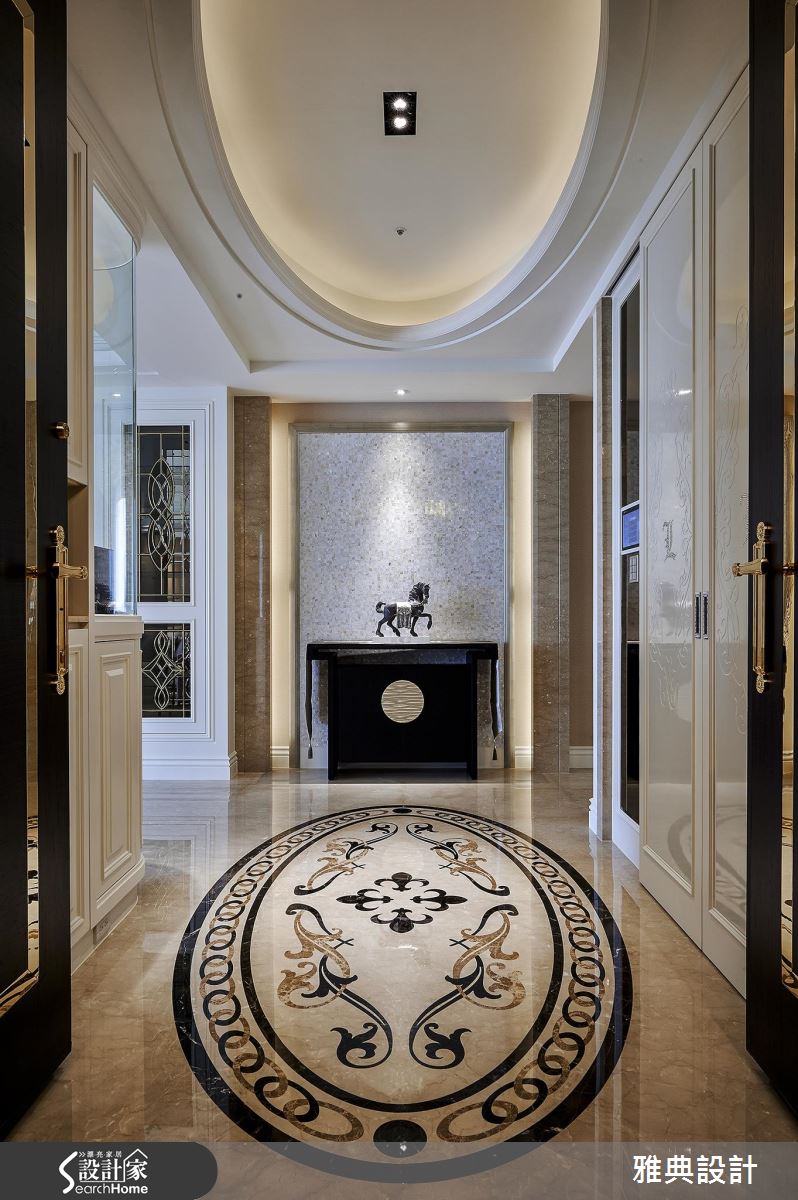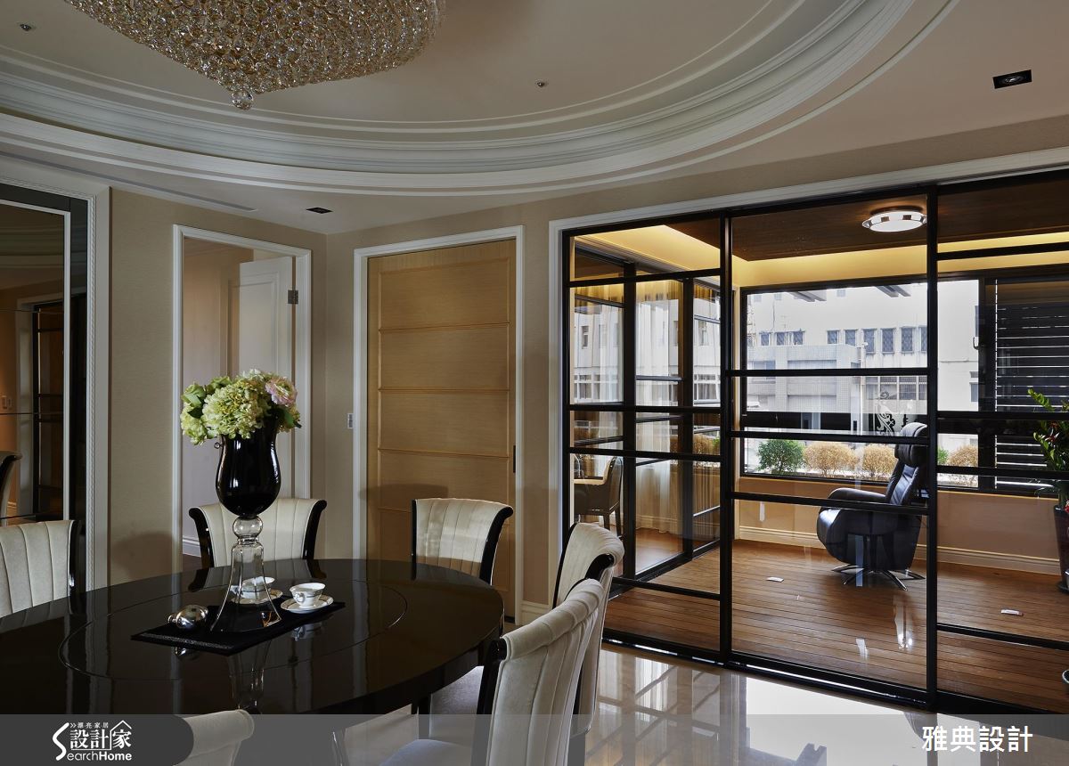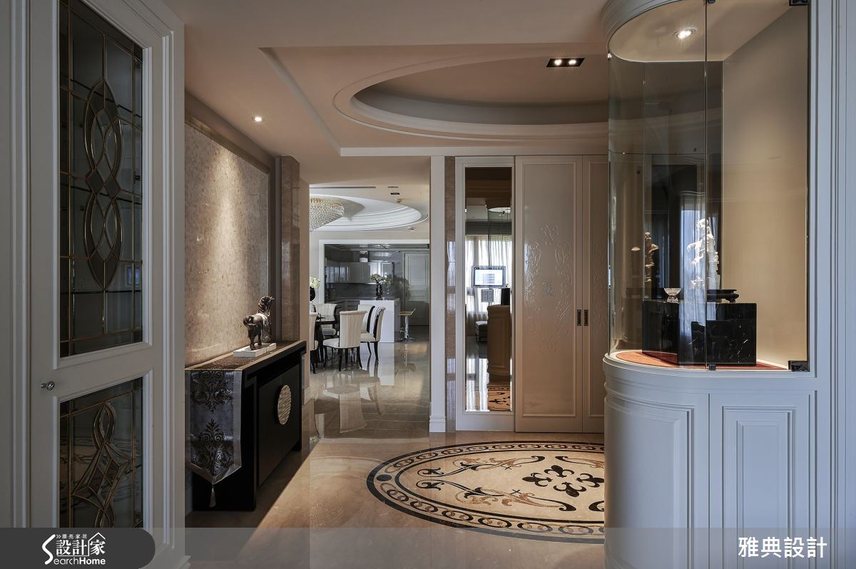 設計師重劃格局,利用玄關將客廳與其餘生活場域一分為二,達到公、私領域分明的效果。設計團隊為玄關空間煞費苦心,以讓石材水刀拼花圖騰與天頂形成天地呼應,外方內圓更象徵了大器意象,最後以貝殼板及導角石材,收攏迎賓處的視覺端景,隆重氣勢盡顯。設計團隊更克服工法難度,以曲面玻璃打造零死角展示櫥窗,讓屋主珍藏的元朝骨董藝品一覽無遺。進入用餐空間,圓形天頂與圓桌象徵完滿意象,佐以水晶吊燈與茶鏡營造典雅氣息。利用鐵件玻璃門片與拉門為多功能書房打造可恣意延伸的可能性、在開合之間隨心調度空間大小,同時又兼具採光需求。整體雖採用大地色系為主調,但透過細緻的石材、木作拼接與鋪陳,讓整體空間內斂與大器兼具。