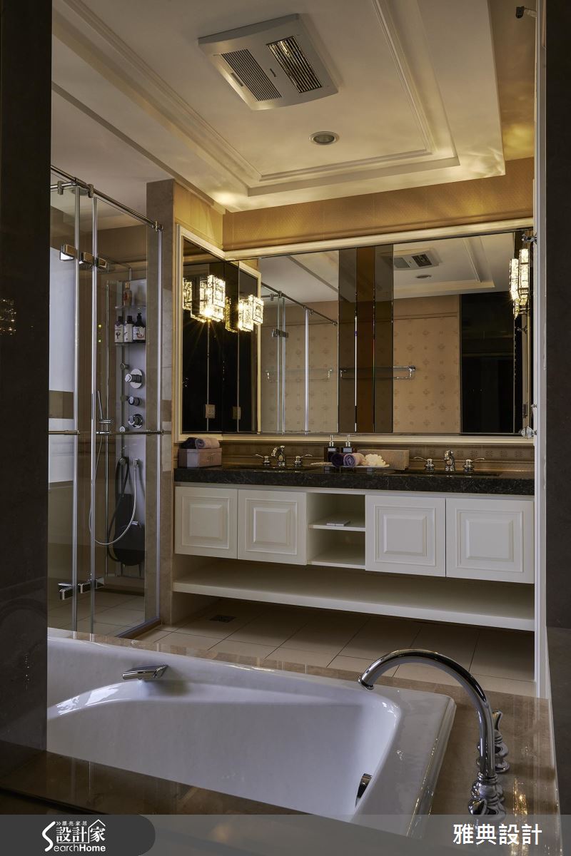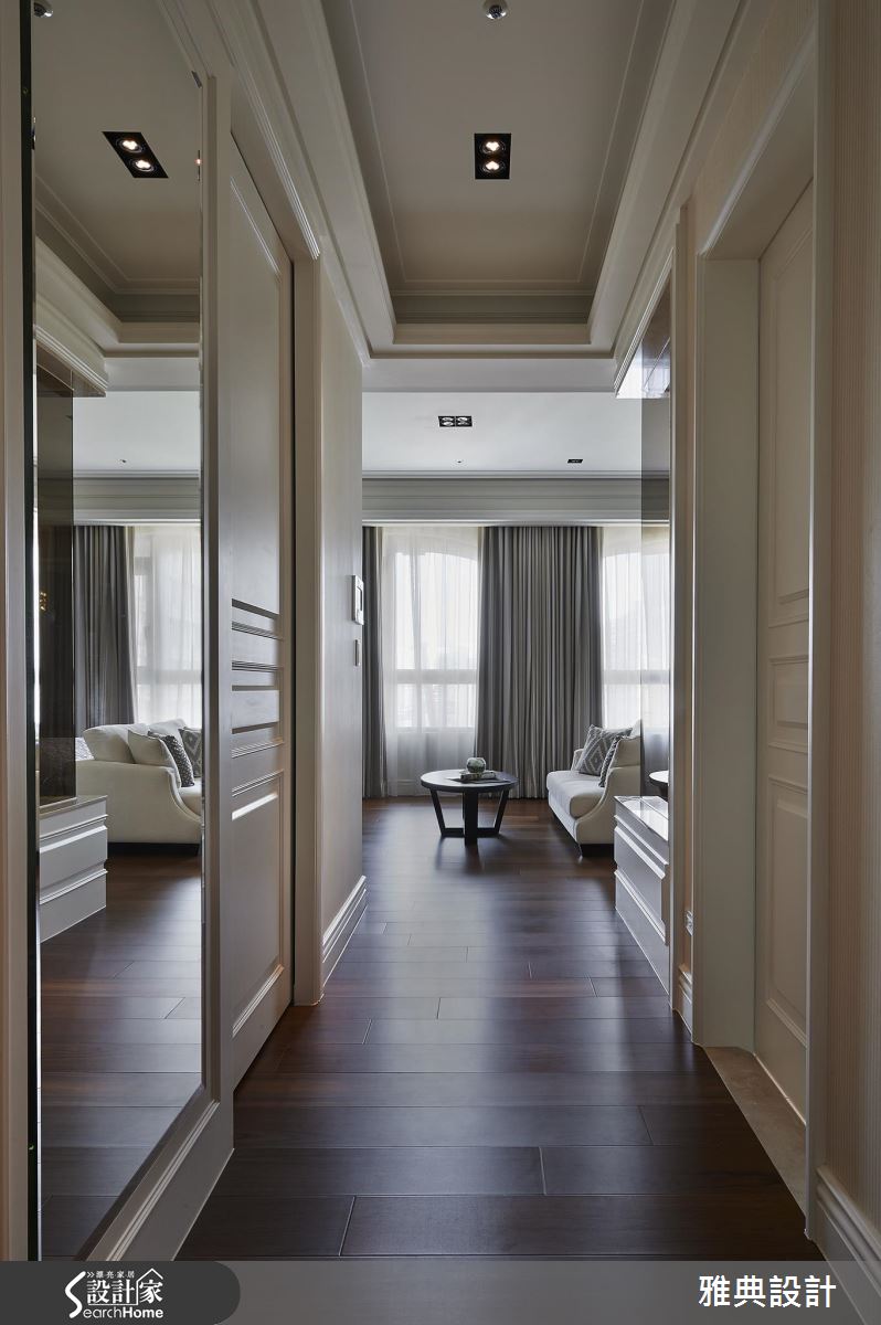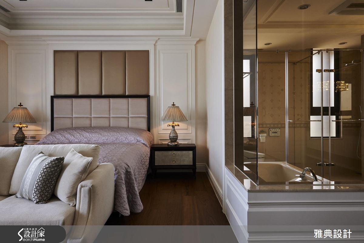 最令人著迷的莫過於飯店式主臥設計,通過兩邊建置大型收納櫃的長廊,就可到達結合起居室與臥房的設計,利用玻璃隔間打造衛浴空間,更帶出精品質感。