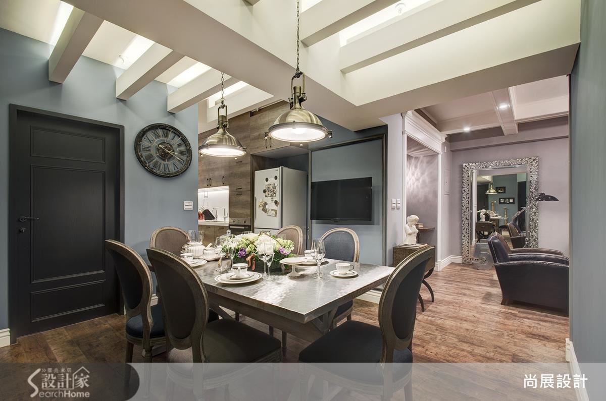 藉由區塊性的色彩揮灑,定義生活中不同場域;像是於餐區立面刷上淡藍色調,傳遞清新的用餐氛圍,天花則加入格柵裝飾樑與間接燈光,不僅達到拉抬尺度的效果,更增添了空間層次,並陳列質樸的刷白仿舊餐桌椅,一旁卻大膽搭襯深邃神秘的黑色門片,開創具衝突感的視覺之美。
