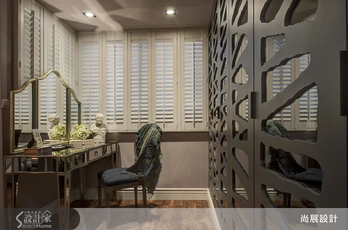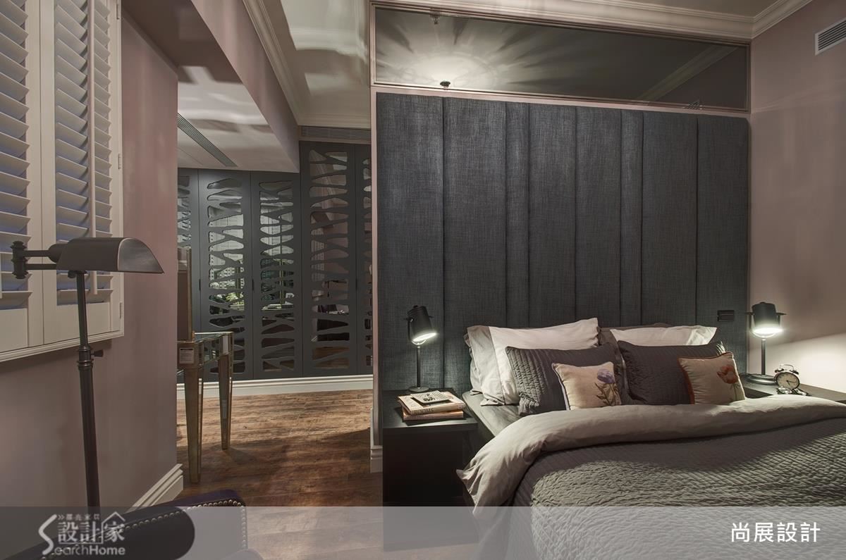 主臥融入女主人指定的淡紫色,凝鍊高雅氣質,床頭牆則鋪陳黑色繃布拼接深色鏡面,並借引燈光漫射,呈現華麗貴氣的立面表情;後方則導引流暢動線,規劃開放式梳妝更衣間,並量身訂製專屬衣櫃,櫃面承襲居宅的非洲元素、做出雷射雕刻斑馬紋,佐以復古鏡面梳妝桌,展現特有的精緻時尚。