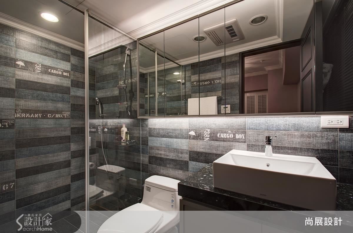 衛浴牆面鋪設仿木紋磚,敘說懷舊復古的氛圍,且將不同色彩的磚材予以穿插拼接、或在表面上刻字,添入特別的視覺變化。